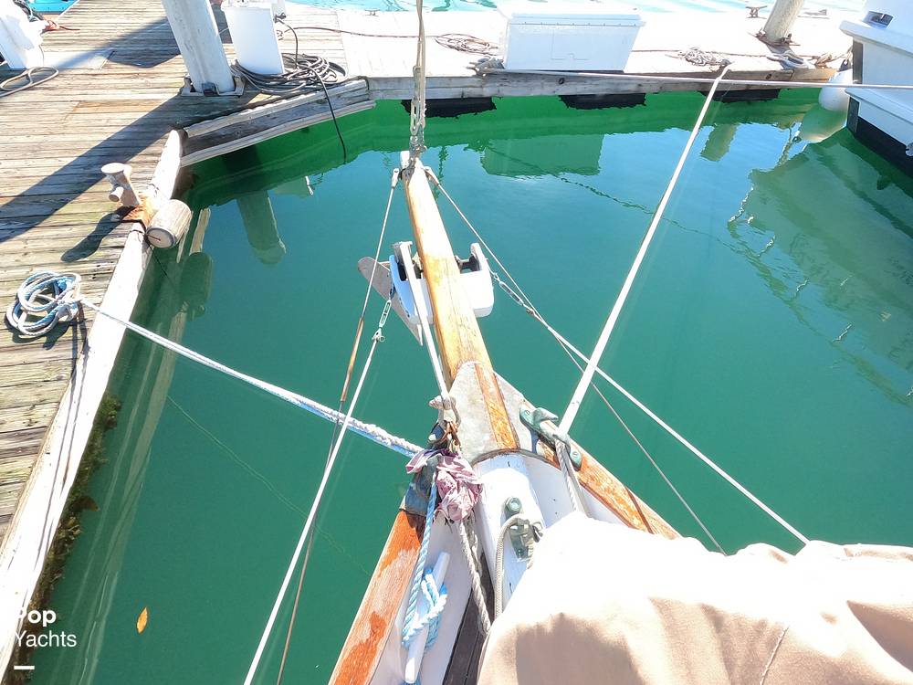 Her hull is built of longleaf yellow pine on an oak wood frame and she was built for all sailors to enjoy. She's 35 feet overall with a 10' beam and a hull speed of approximately 7 knots. WIth her sloop rig, she has the mainsail, jib, and a drifter sail. Age of the sails is unknown, and material is Dacron.