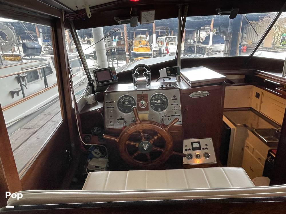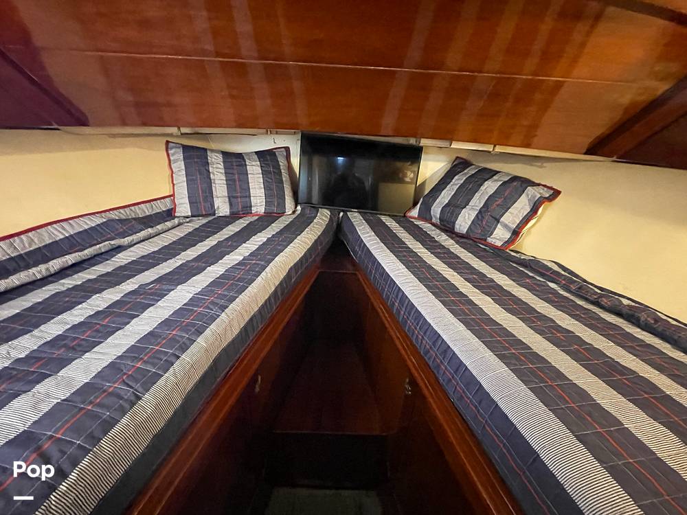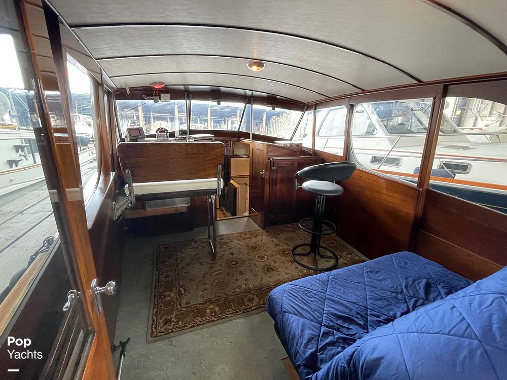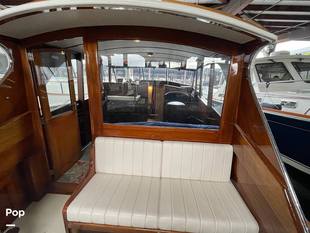 Entering the salon from a port side mahogany door places you in a comfortable salon area with a couch/hide-a-bed. The rich varnished interior is very bright with large windows providing passengers and helmsman with good 360-degree visibility. With the helm station to the port and chart table to the starboard, the open companionway down to the galley lies in the center.