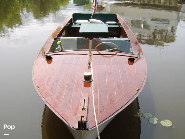 She has a beautiful white hull, with a beautifully varnished bow and stern, brass fittings and is powered with a 1957 Chris Craft Model K 95hp marine inboard engine and has Cedar planking over oak ribs with mahogany transom.