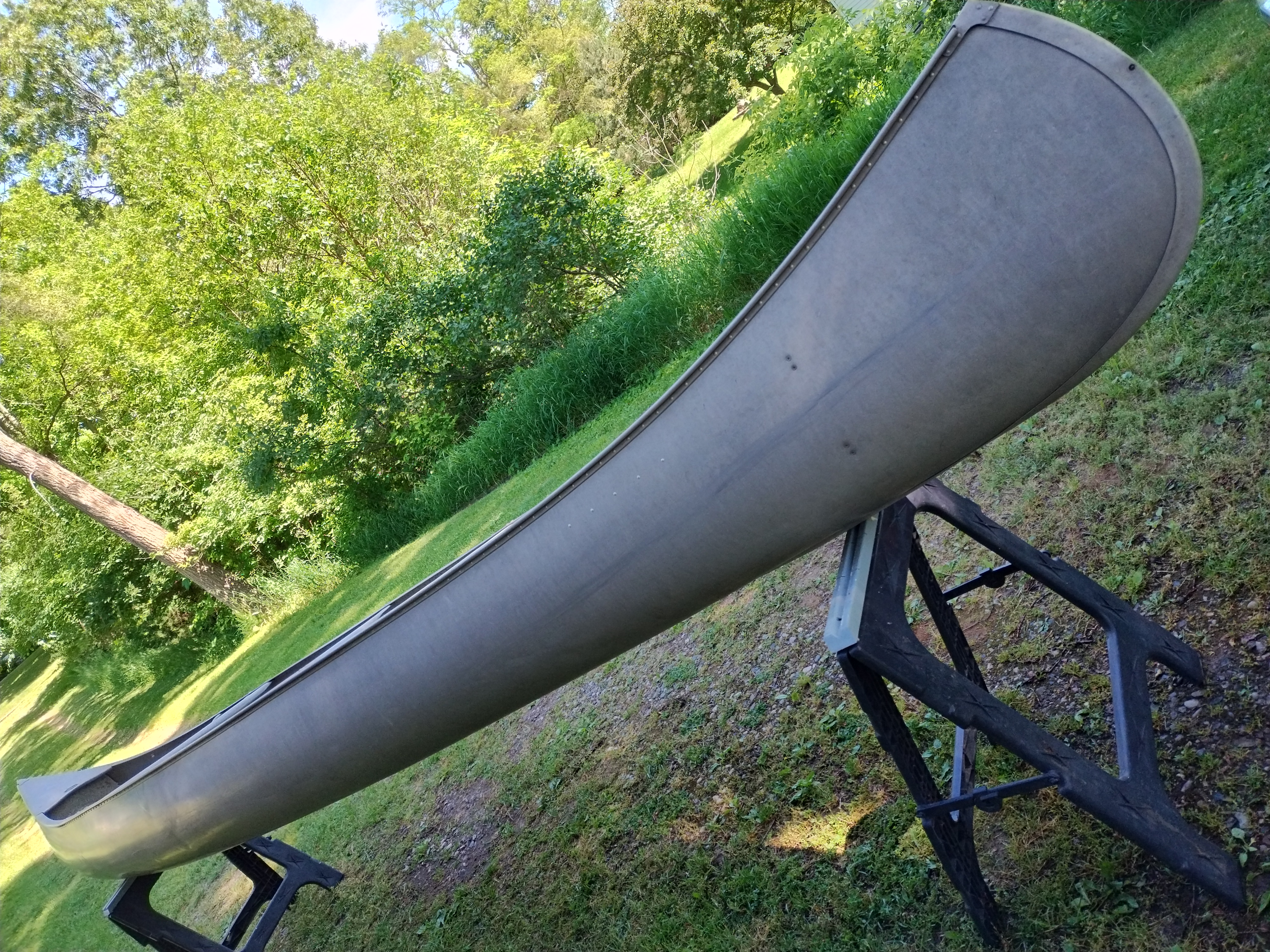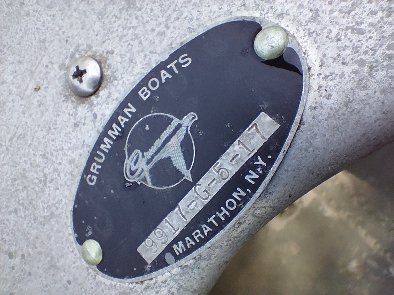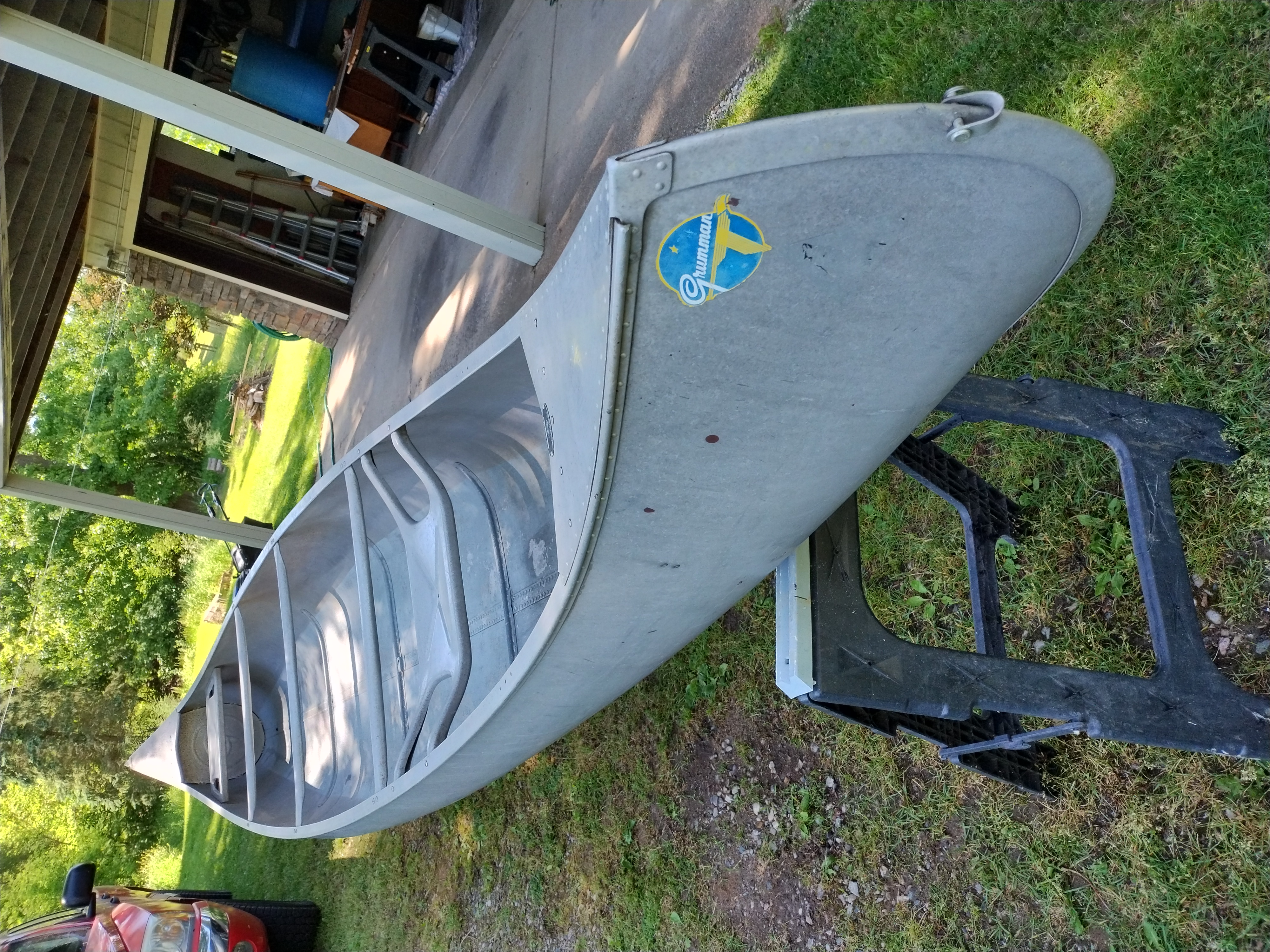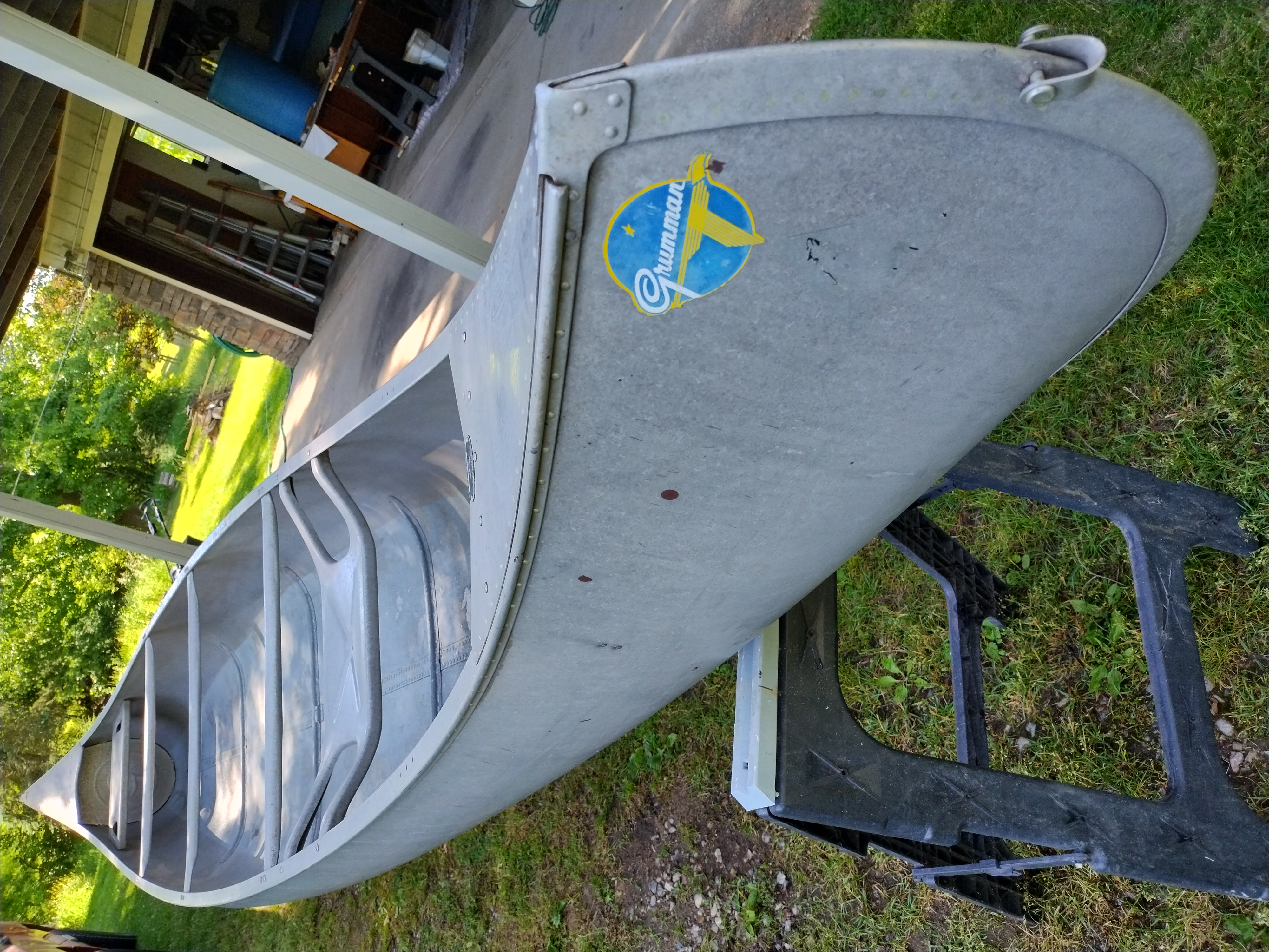 I'm not exactly sure of the year. My Dad bought it used in 1970 or 72. I think it is a 1965 model. It weighs about 75 pounds, and is in very good condition with only minor dents & scrapes, and no leaks. It is a Silverwolf model, but only remnants of the triangular shaped decal that once sat below the Grumman decal remain as seen in the pictures. It is equipped with the mounts for the sailboat kit. This canoe has provided years of enjoyment & fun and has many more to give.
