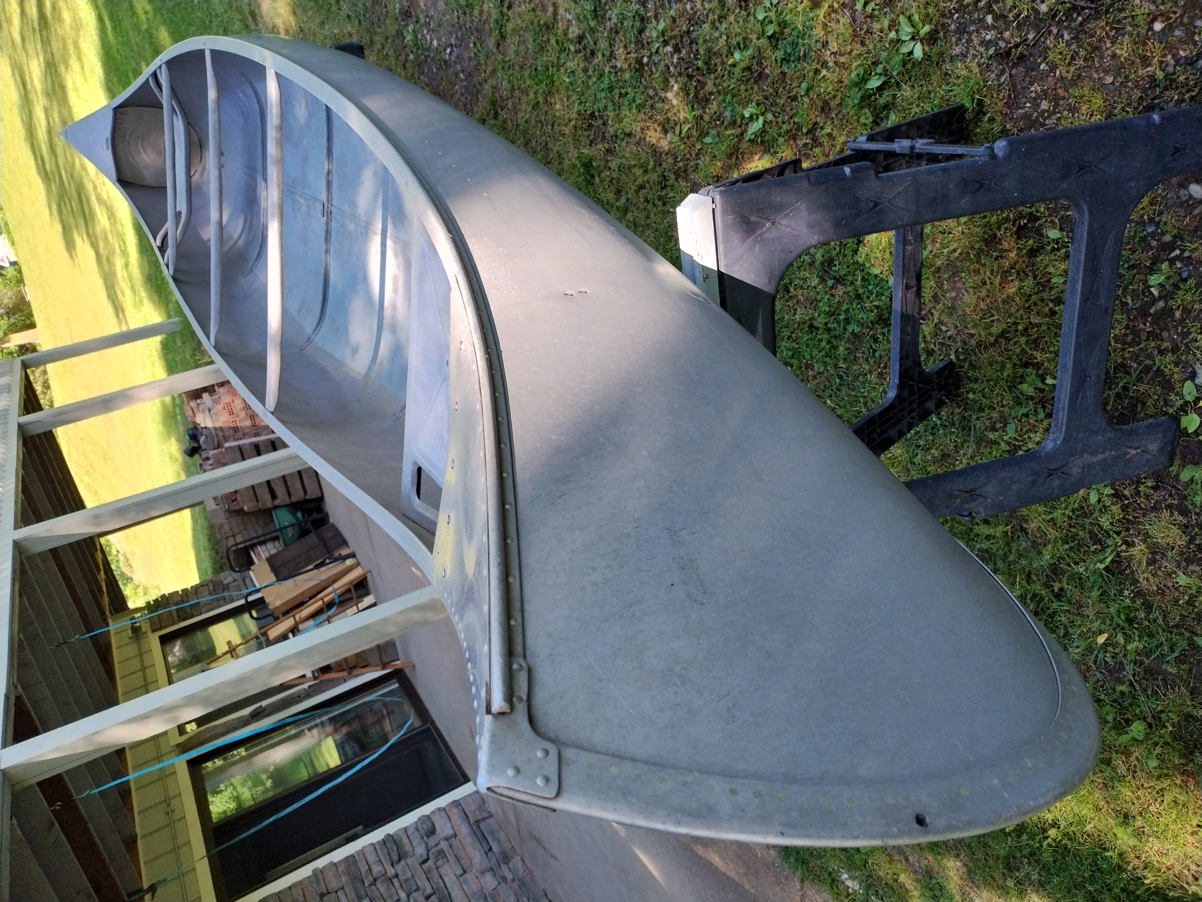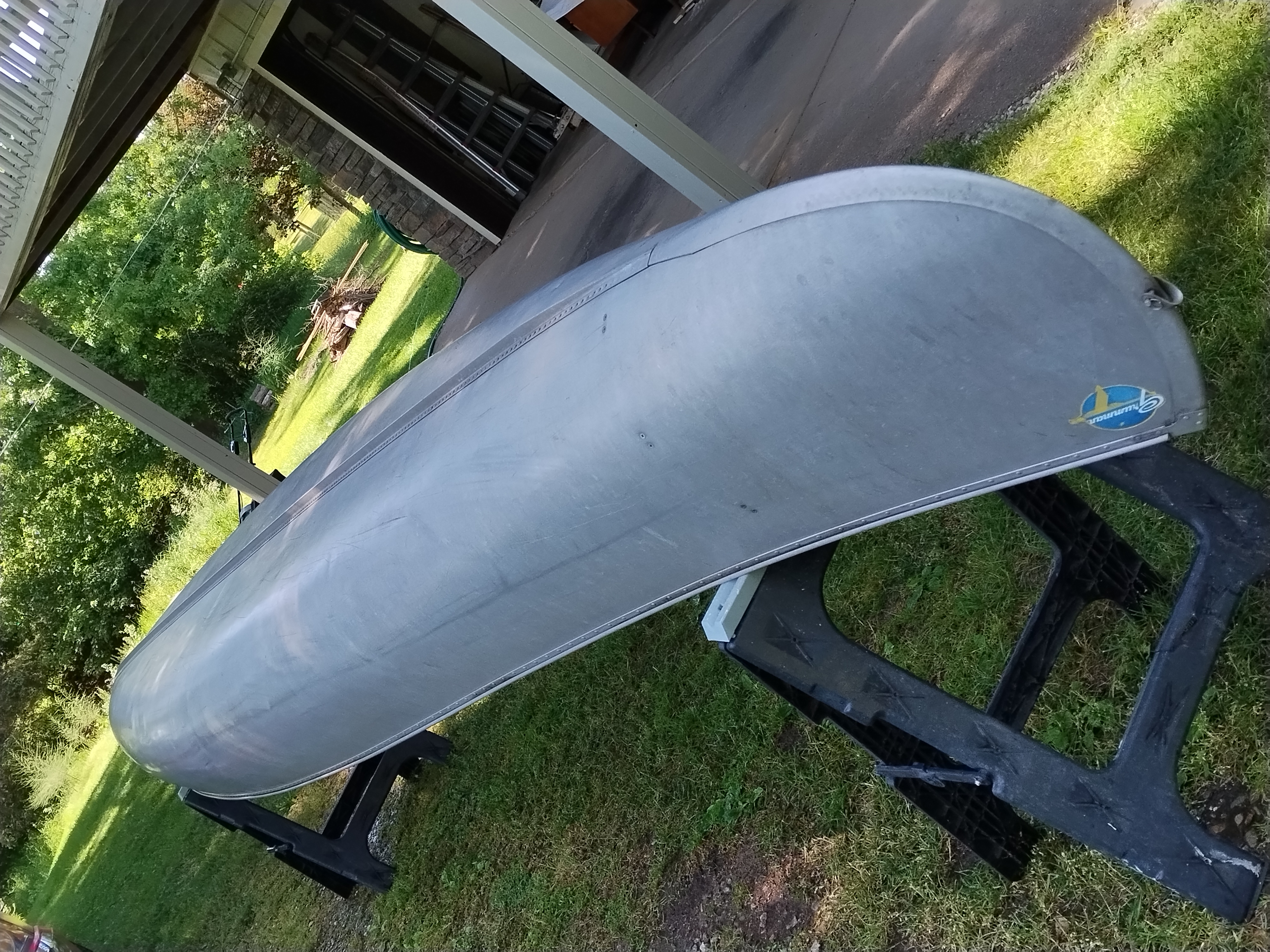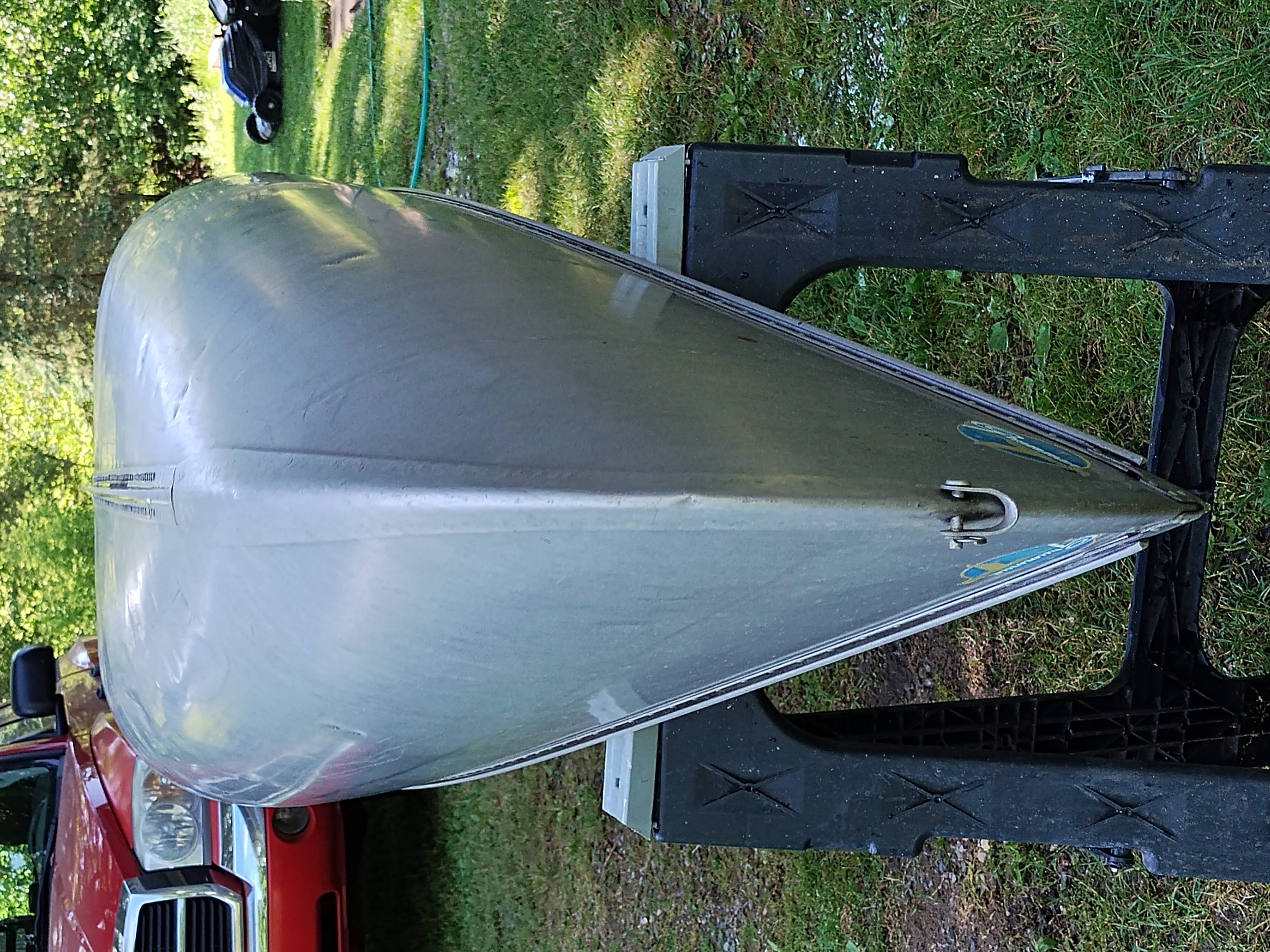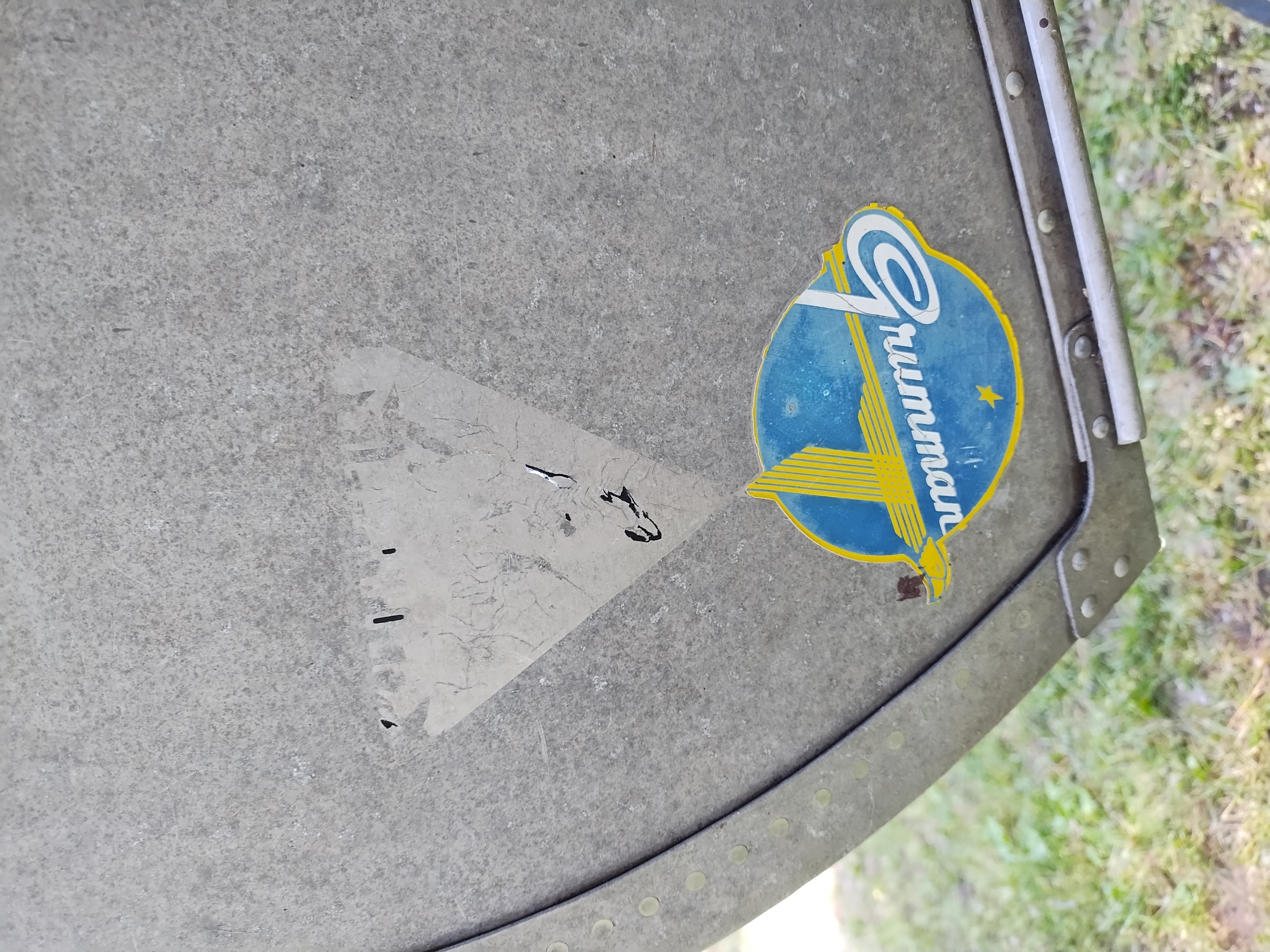 I'm not exactly sure of the year. My Dad bought it used in 1970 or 72. I think it is a 1965 model. It weighs about 75 pounds, and is in very good condition with only minor dents & scrapes, and no leaks. It is a Silverwolf model, but only remnants of the triangular shaped decal that once sat below the Grumman decal remain as seen in the pictures. It is equipped with the mounts for the sailboat kit. This canoe has provided years of enjoyment & fun and has many more to give.