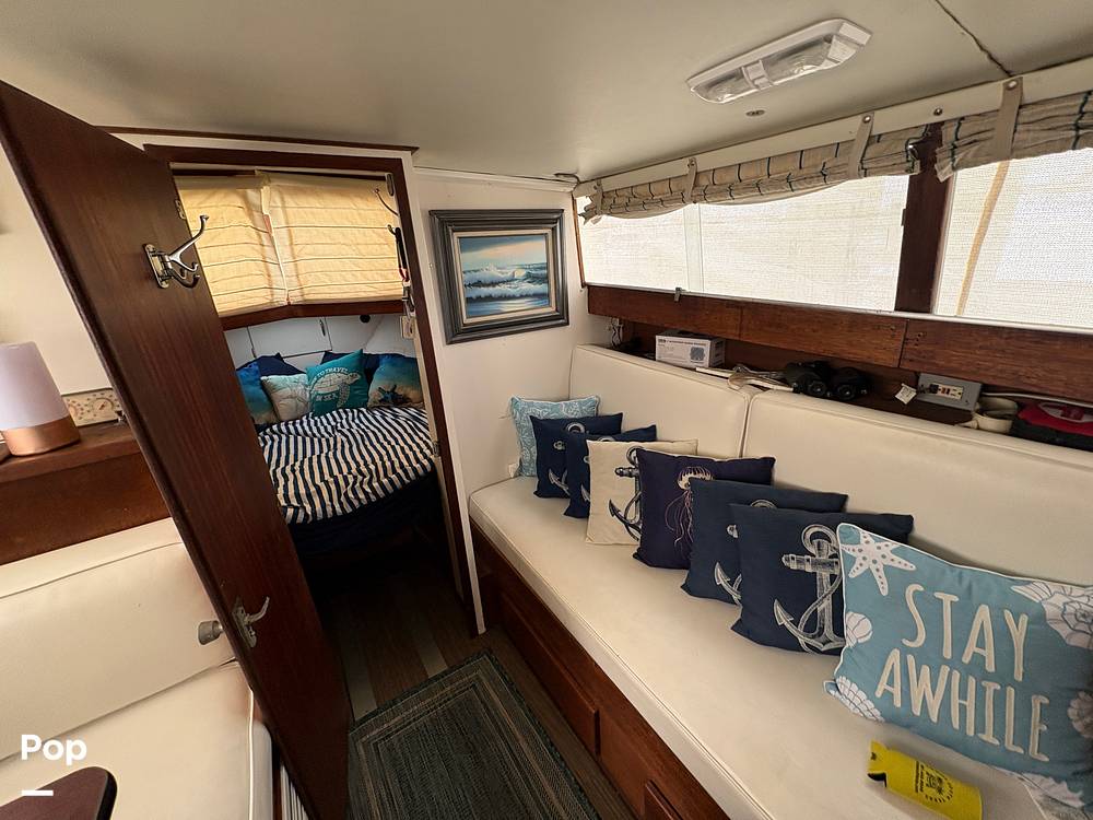 Below decks, you'll find a comfortable cabin cruiser layout with accommodations for overnight stays, including a galley, head (bathroom), sleeping berths, and rich wood-accented interiors that reflect classic nautical styling.