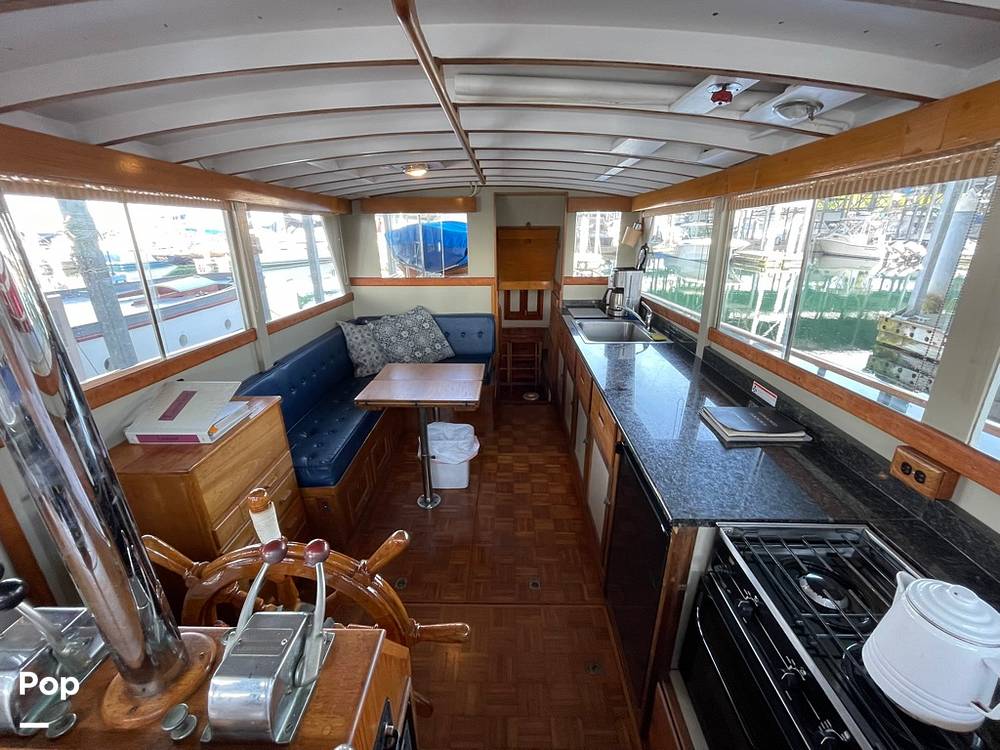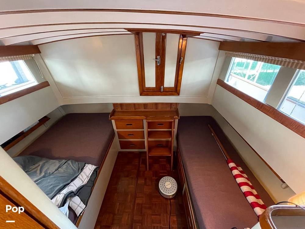 The interior offers a functional layout with a galley, salon, and sleeping quarters. Teak woodwork and practical design create a comfortable space for life aboard.