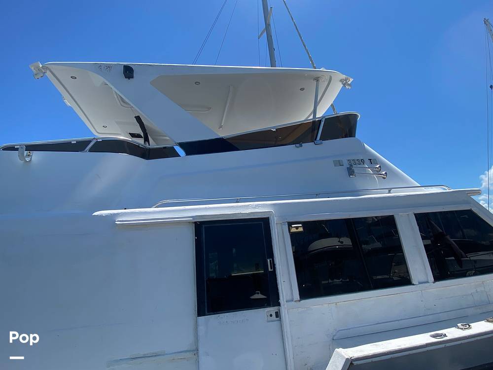 The pilot house features a five-panel windshield and panoramic windows. The galley with a U-shaped booth, a dinette, Teak interior, and wood decks over fiberglass. Aft deck with seating, table, and storage. Port twin lower berth guest cabins. Starboard guest head with shower. Forward bunk-style over-under cabin for crew. Three working heads.