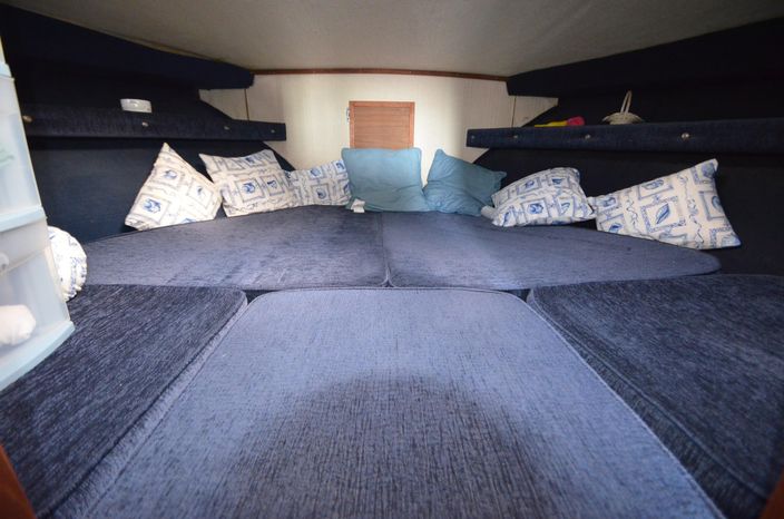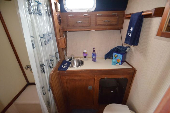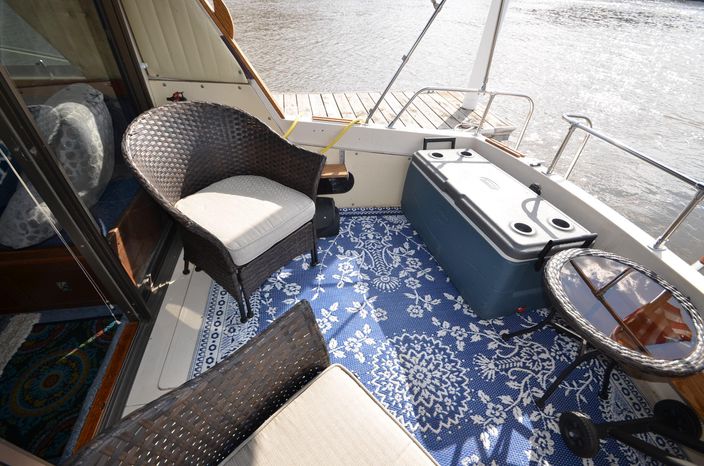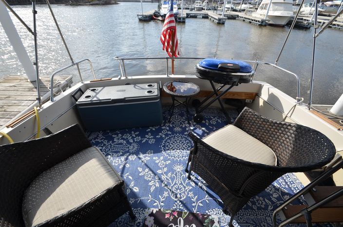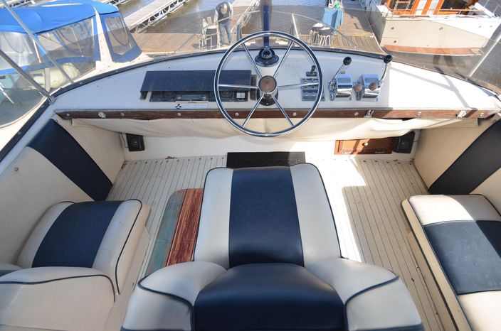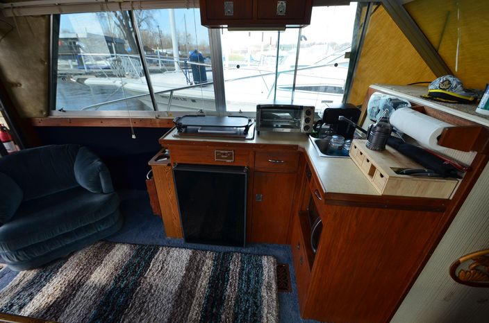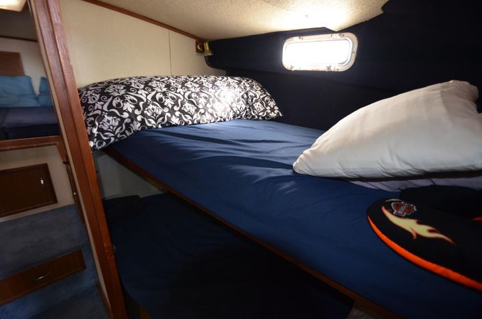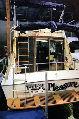 1975 Bayliner Montego 3350, twin 270 hp Crusader, GM 350 CID, 5.7l, raw water cooling, 600 approximate hours, starboard engine rebuilt 2019, I/O's, Onan 5.0 kw diesel generator with separate diesel fuel tank, NHM, dual station, 30 amp/115vac electrical service, shore power cord, three batteries, Pro Mariner battery charger, water heater, pressure water, King Air reverse cycle air/head, Raritan electric head, stall shower and vanity, sleeps five, master stateroom forward with V-berth, guest stateroom forward with bunk berths, blue carpet, double stainless steel sink, Norcold 12vdc/115vac refrigerator/freezer, Kenyon two burner propane stove, Sharp microwave oven, sofa salon, Vizio flat panel TV, Polaris VHF marine radio, VHF antenna, Datamarine depth finder, blue canvas, bridge and cockpit bimini tops, windshield privacy cover, anchor, four fenders with fender racks, mooring lines, Ritchie compass, electric horn and BBQ grill, remote control spotlight, teak swim platform with boarding ladder, Leveller trim tabs.