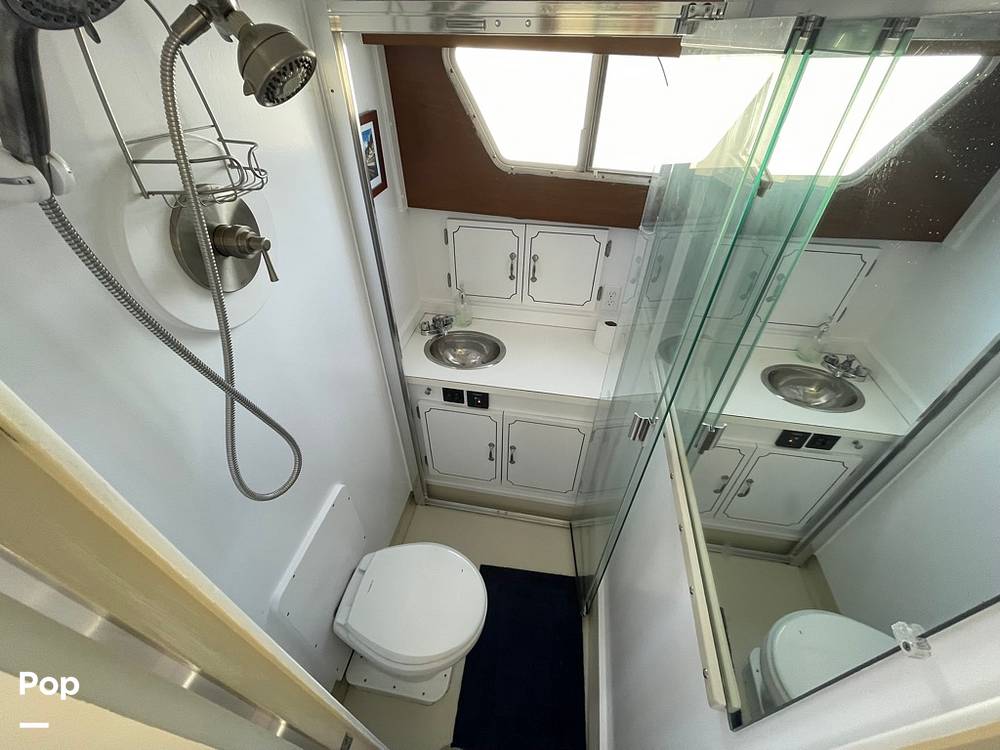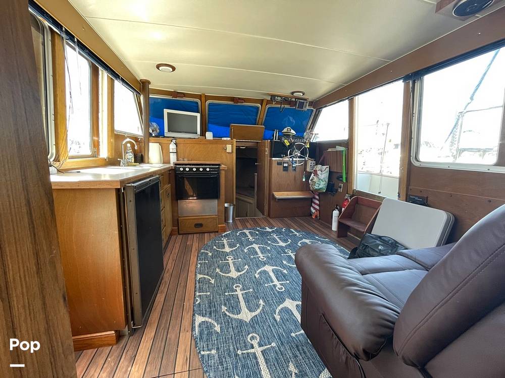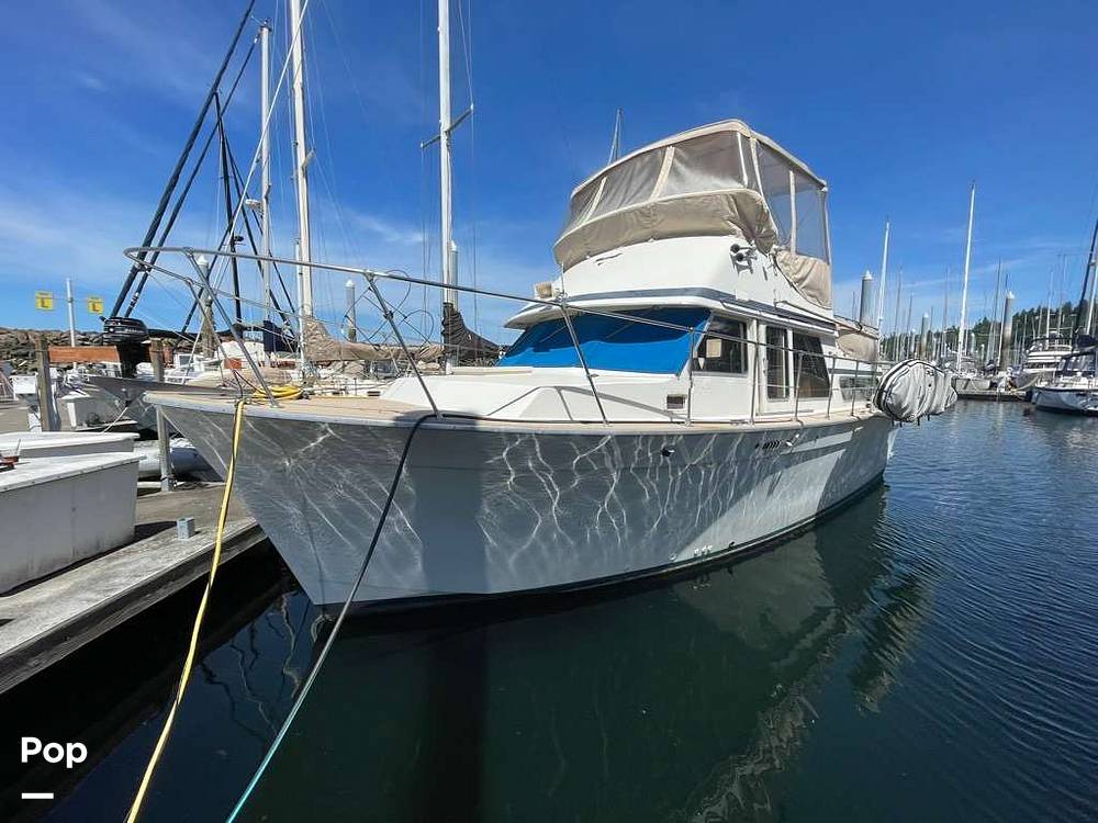 1975 Tollycraft Tri-Cabin 34, a used vessel with a fiberglass hull, 34 feet in length, and 150 inches at its widest point. Weighing approximately 17,000 pounds without fuel, gear, or passengers, this boat is powered by twin Mercruiser V8 engines.
