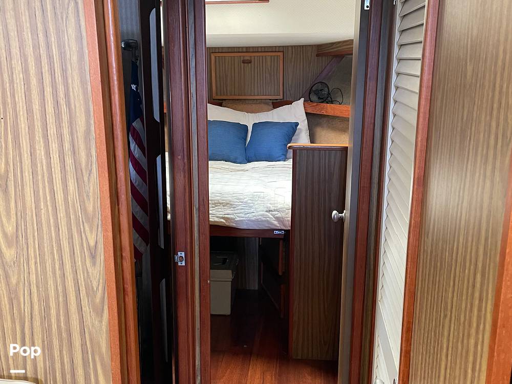 A three-step aft companionway takes you to the largest of the two staterooms. The stern stateroom features two hanging lockers, ample storage drawers, and plenty of natural light with windows fore, port and starboard side with queen-size walkaround bed central to the room. A large head with large vanity and full shower completes the stateroom.