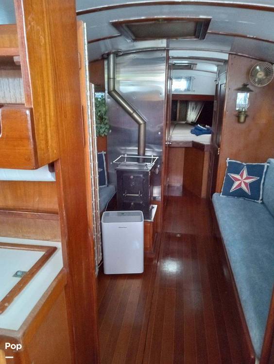She has a very unique wood-fired stove for winter living. This boat is very forgiving in bad weather. She cruises between 6 and 8 knots.