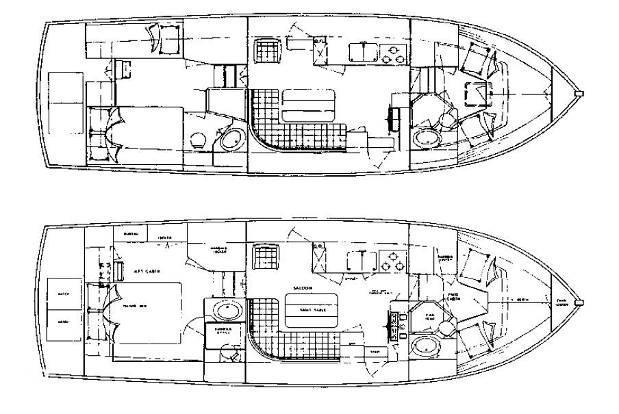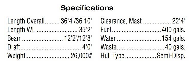 A semi-displacement hull with a long keel, hard chines and a deep forefoot provide the stability that won the 36 a reputation for seaworthiness seldom matched by other boats in her class.