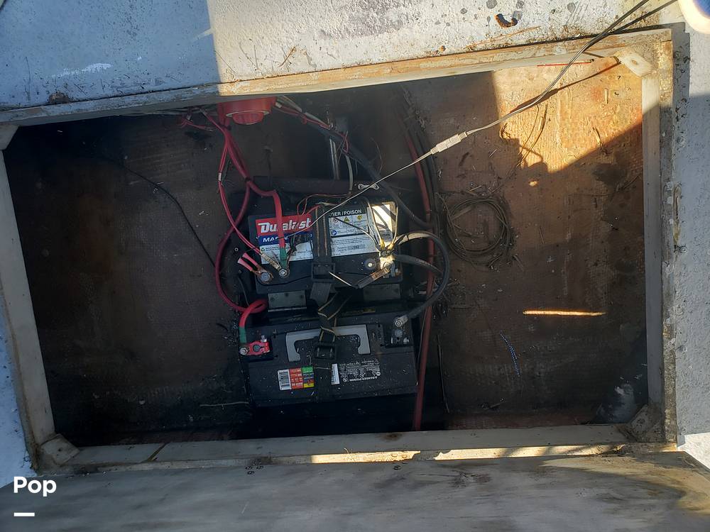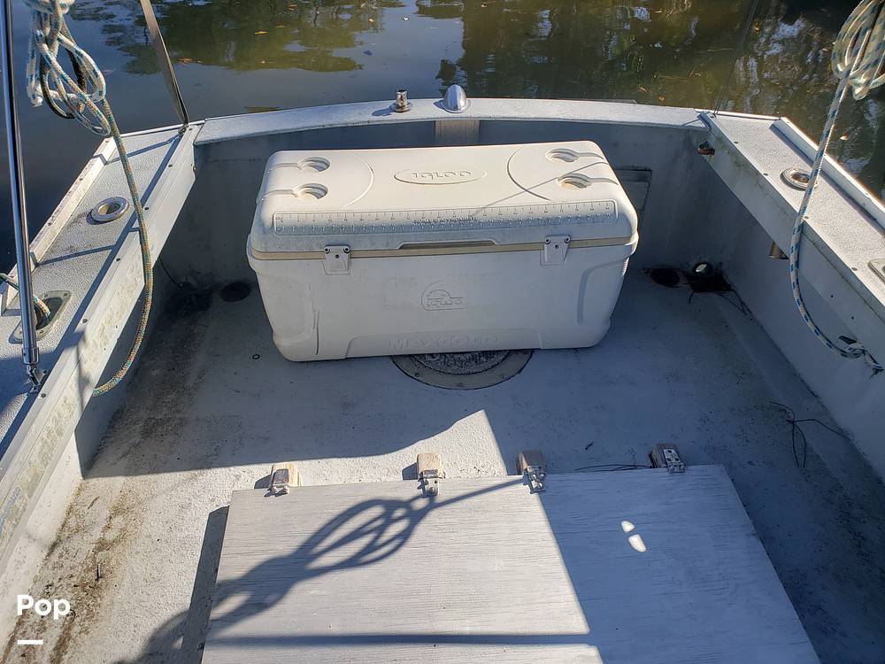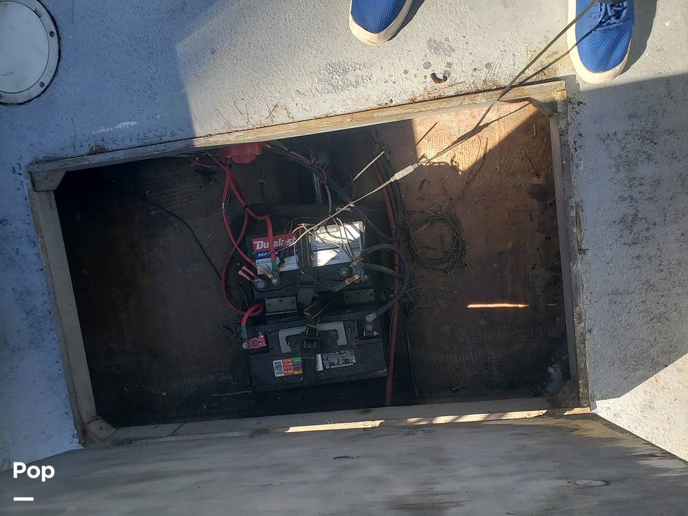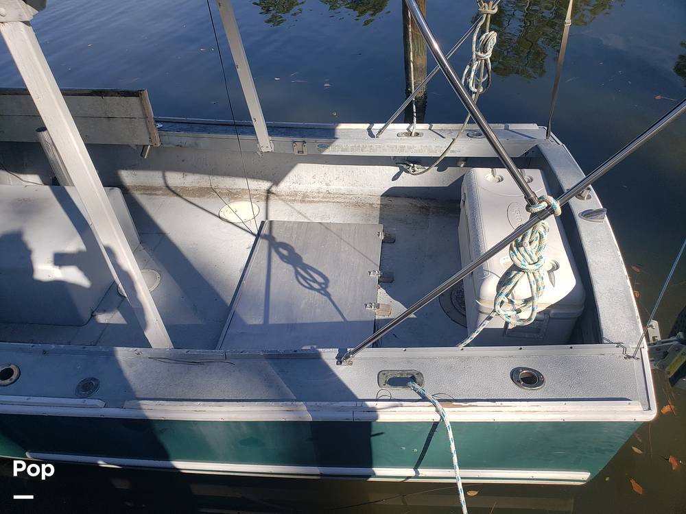 The boat is straightforward with a large open deck that's covered by a bimini, closed transom, low freeboard aft, that transitions into a covered helm with a large windshield. There is a forward V-berth with a simple companionway. It has the basic electronics of a VHF and a small Garmin.