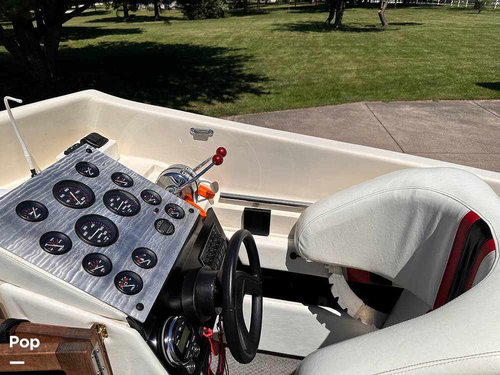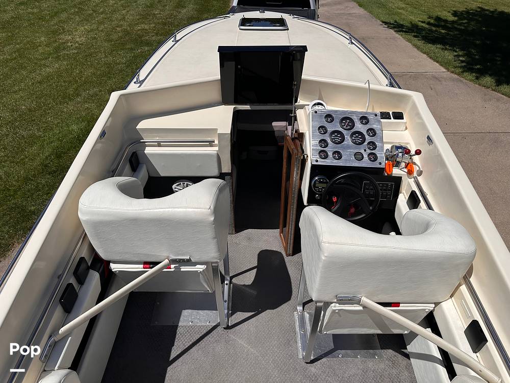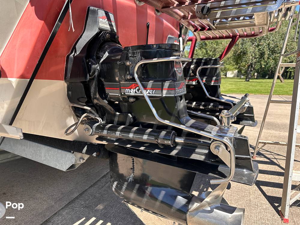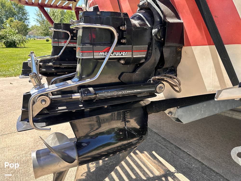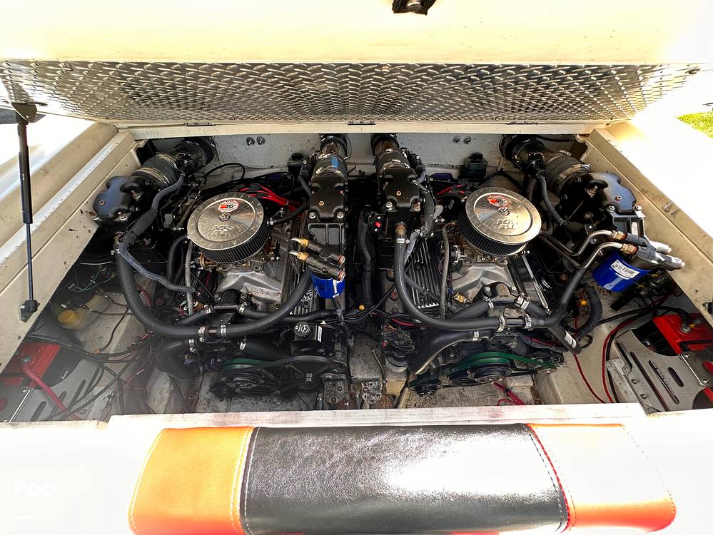 The engines were custom made new based on Mercruiser 350 cu. in V-8 as special high performance, with 4-bolt main bearings, roller rockers for push rods and cam. Camshaft is special marine hi-performance "Thumper" with Vortec heads for 330 hp. The engines were built in 2015, but kept in storage until 2018 when first run. Engines now have 82 hours for each engine. Exhaust is custom via CORSA exhaust, 4" with Captains Choice. Edelbrock aluminum high rise intake manifold with Edelbrock 4-barrel marine carburetor. Boat is fresh water only.