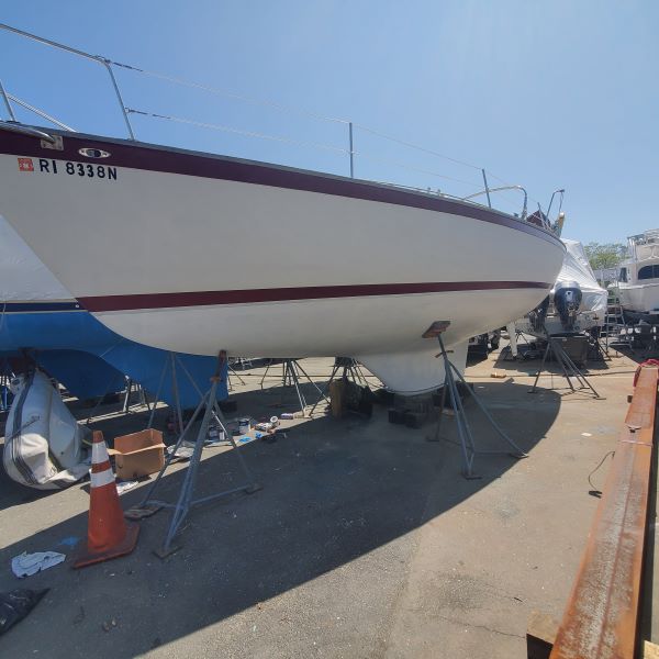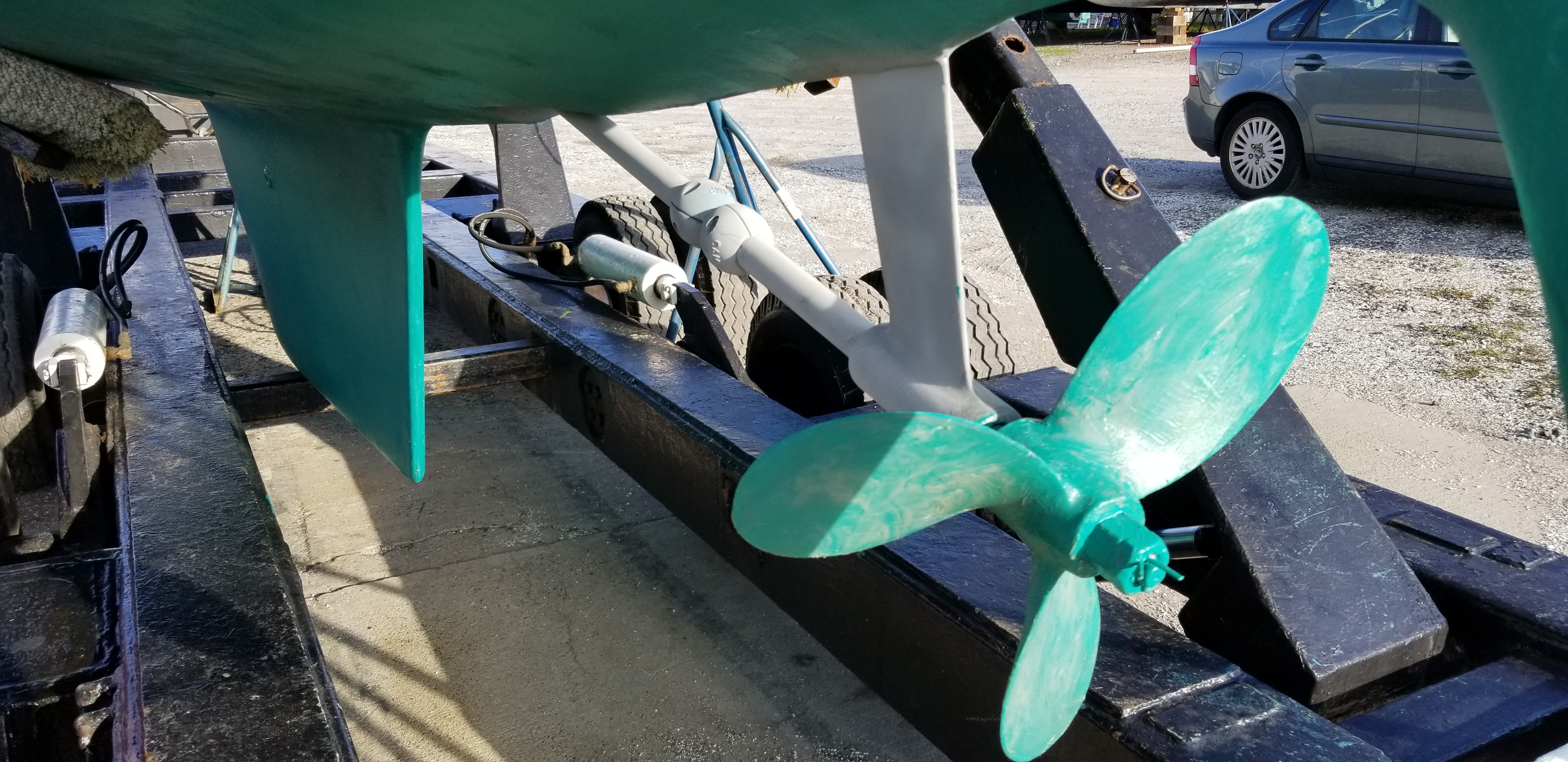 Hull sand blasted and stripped to Gelcoat, 3 new coats gelcoat (barrier coat added) 50% Cuprous Oxide Bottom Paint