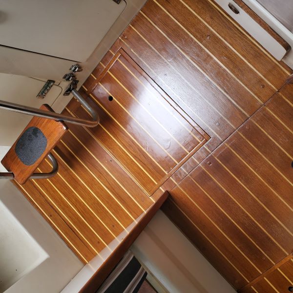 All interior teak restrained, re glazed. 3 Dodger panels refurbished last year with top of the line Stratoglass Vinyl, all new