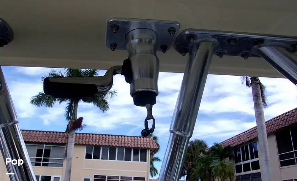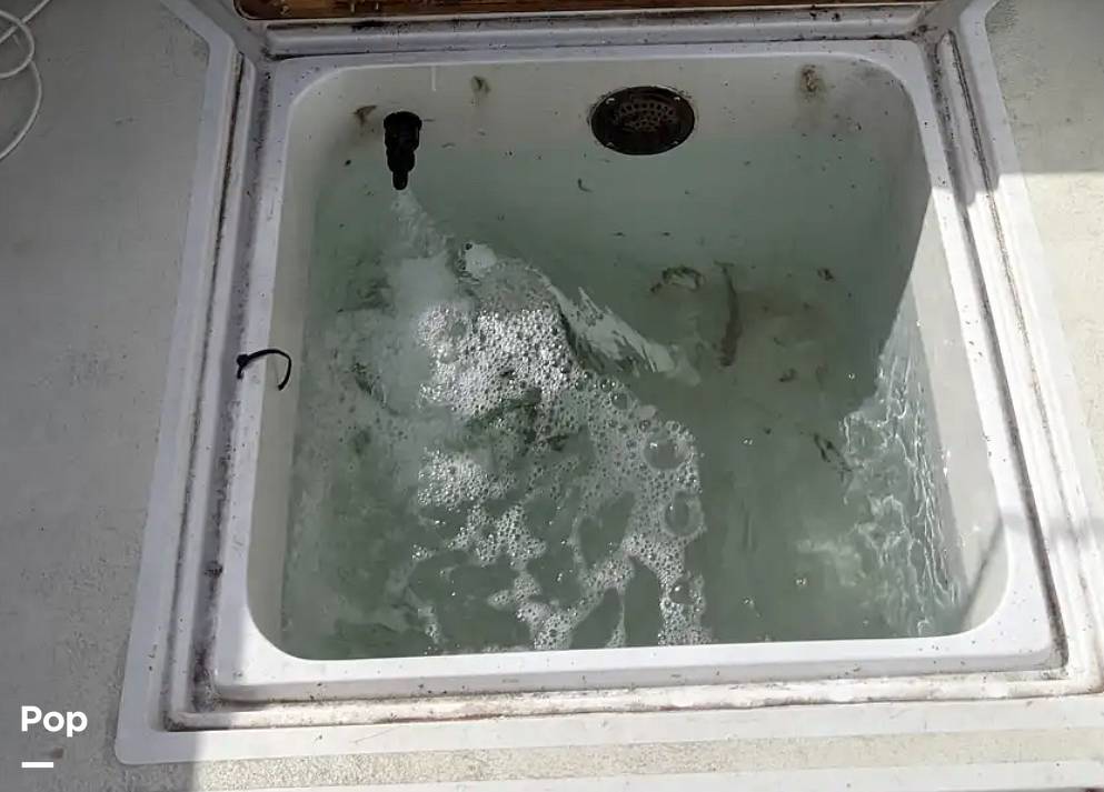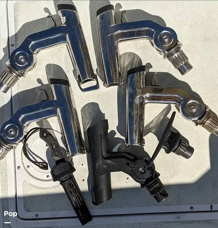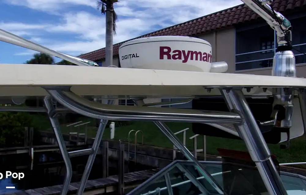 Controls include an Optimus joystick which will even walk the boat sideways. There is a Raymarine chartplotter-fishfinder-GPS, Lenco automatic trim tabs, and Maxwell helm-controlled windlass. The Raymarine radar dome works but is no longer compatible with the newer Raymarine chartplotter.