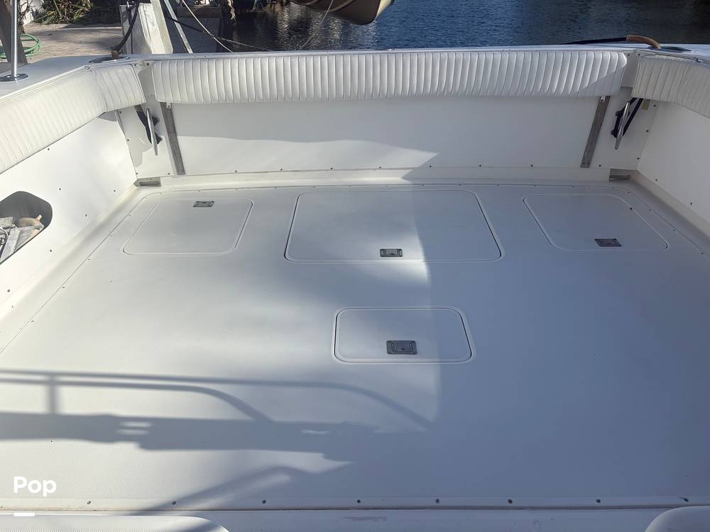 The large cockpit is one of the highlights, offering plenty of room to move around, fish, or relax, with easy access to the engines and systems. Wide side decks make getting around the boat simple, and the flybridge provides great visibility and a comfortable helm area for running or docking.