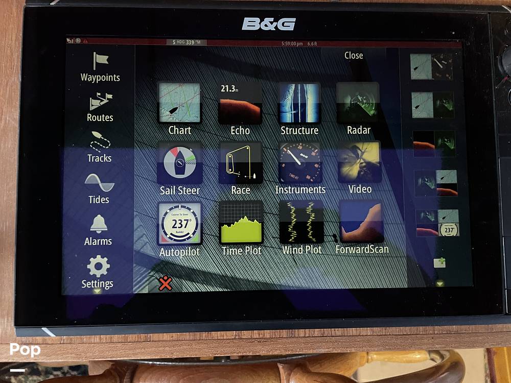 She comes with several recent upgrades to enhance your sailing pleasure. A complete B & G operating system, including Autopilot, Radar, Echo Sounder, Navigating, Self-steer, Forward Scan, Video, and Chart systems, ensures navigation is a breeze. A Side Power Thruster adds maneuverability to your sailing adventures.