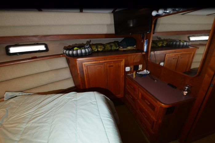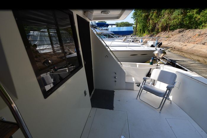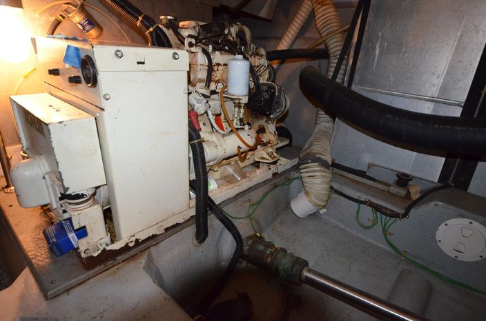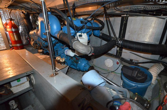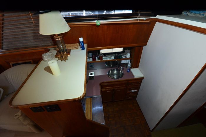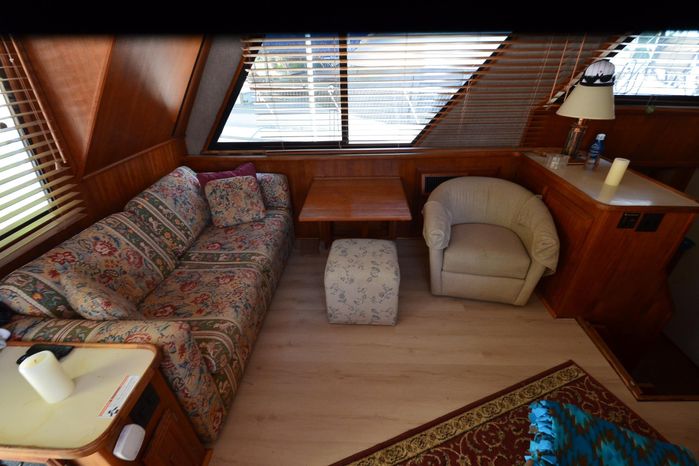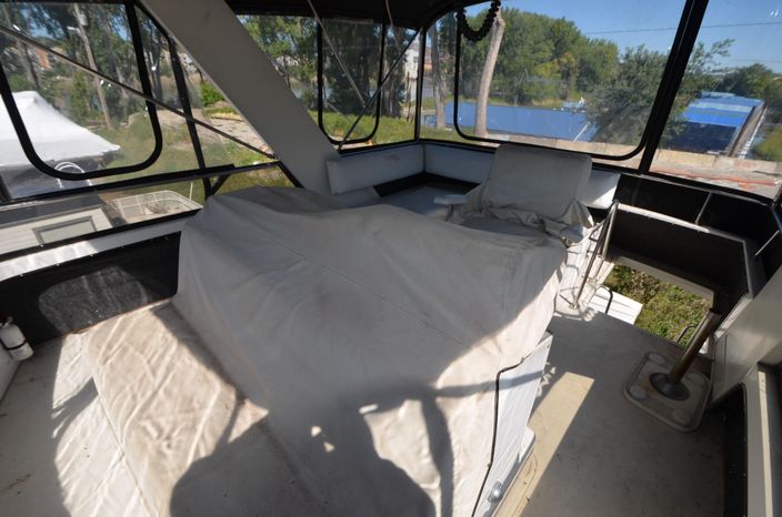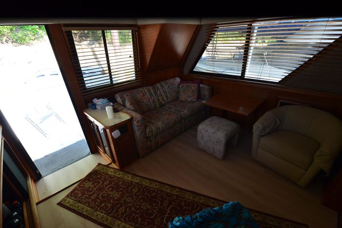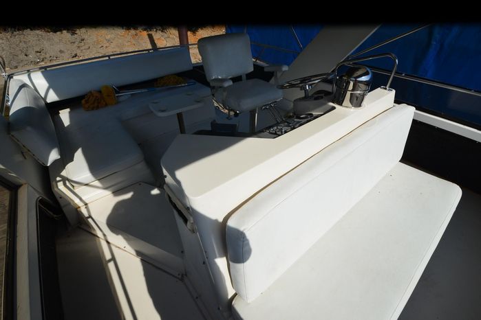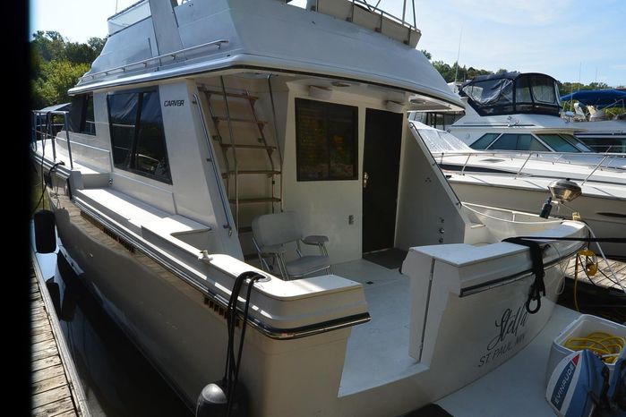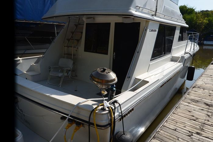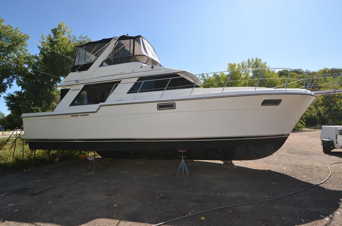 1986 Carver 4227 Cockpit MY, T-350 HP Crusader, GM 454 CID, inboard, enclosed cooling, 1100 approximate hours, Kohler 7.5 kw generator, 1395 approximate hours, dual 50 amp service with shore power cords, three Marine air reverse cycle air/heat units, Raritan Crown head/shower/vanity, sleeps six, master stateroom forward with island queen berth, guest stateroom/office with fold down bunk, Salon, lower helm, convertible sofa, ice maker, two chairs, fold-out dining table, teak woodwork, entertainment center, AM/FM stereo/cassette, dry bar, Galley: full size refrigerator/freezer, Princess three burner stove, microwave/convection oven, two station intercom, VHF marine radio (U/L), depth finder (U/L), engine synchronizing gauge (U/L), Northstar 800 loran, Benmar auto pilot, sum log, dual station remote spot light, anchor, bow pulpit, electric windlass, five fenders, trim tabs, white canvas, bimini top with enclosure, electronics arch, flybridge and cockpit carpet, deck washdown, transom door, swim platform with boarding ladder.