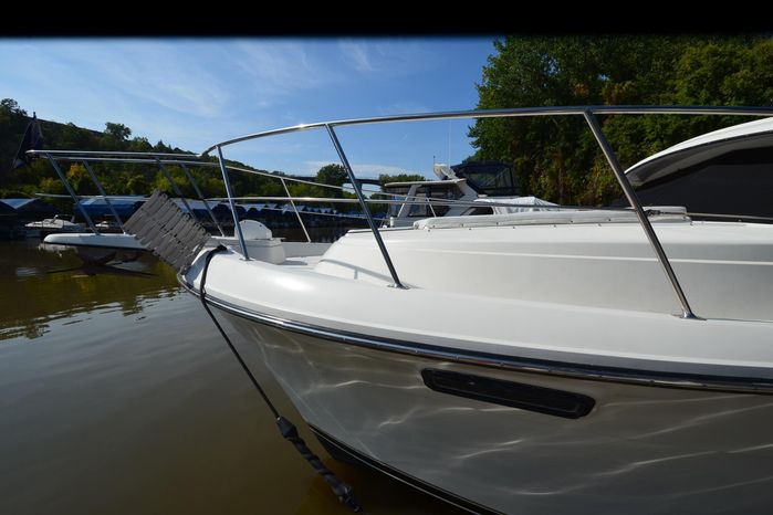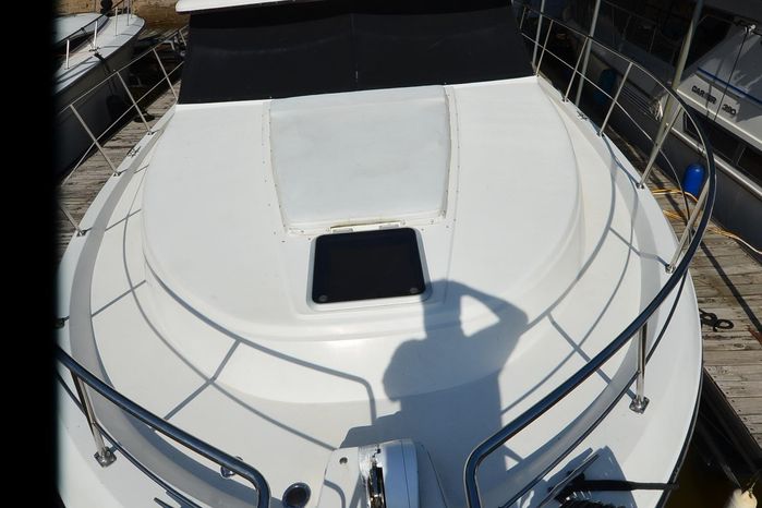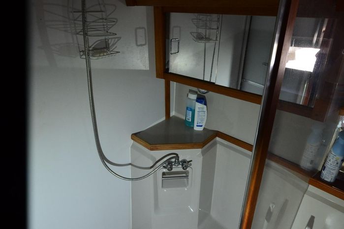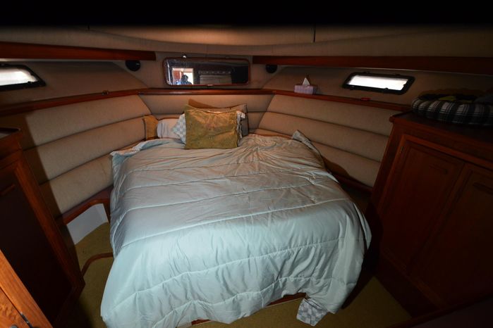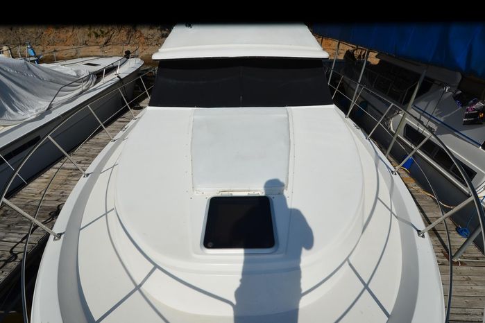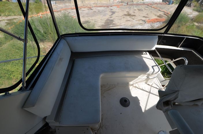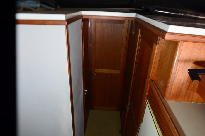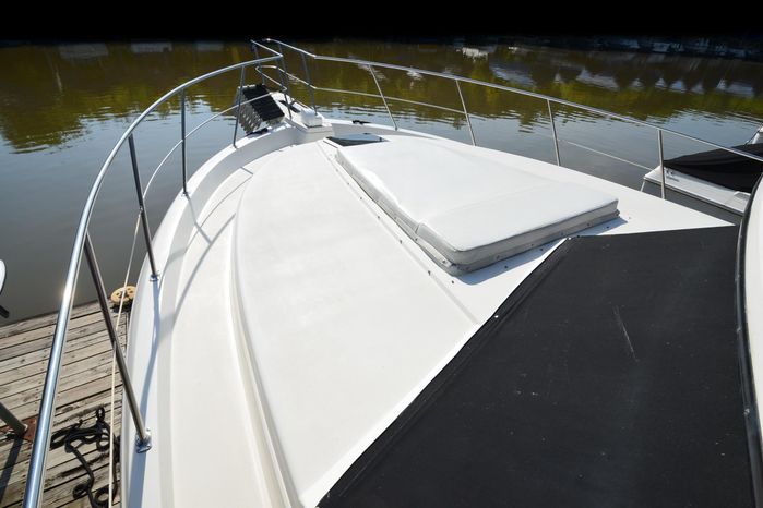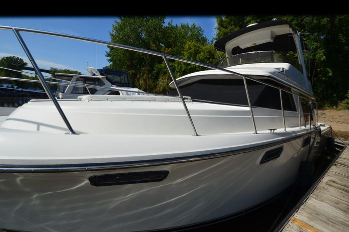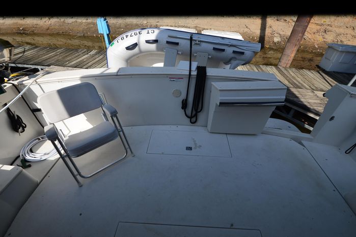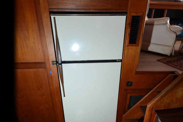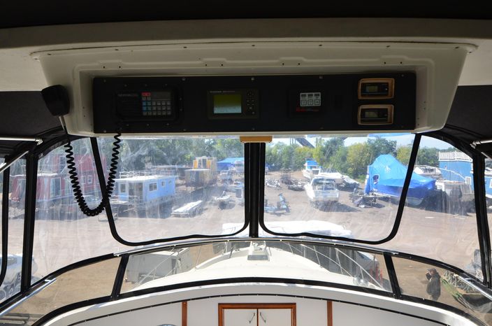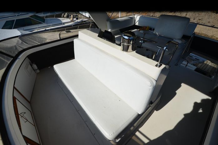 1986 Carver 4227 Cockpit MY, T-350 HP Crusader, GM 454 CID, inboard, enclosed cooling, 1100 approximate hours, Kohler 7.5 kw generator, 1395 approximate hours, dual 50 amp service with shore power cords, three Marine air reverse cycle air/heat units, Raritan Crown head/shower/vanity, sleeps six, master stateroom forward with island queen berth, guest stateroom/office with fold down bunk, Salon, lower helm, convertible sofa, ice maker, two chairs, fold-out dining table, teak woodwork, entertainment center, AM/FM stereo/cassette, dry bar, Galley: full size refrigerator/freezer, Princess three burner stove, microwave/convection oven, two station intercom, VHF marine radio (U/L), depth finder (U/L), engine synchronizing gauge (U/L), Northstar 800 loran, Benmar auto pilot, sum log, dual station remote spot light, anchor, bow pulpit, electric windlass, five fenders, trim tabs, white canvas, bimini top with enclosure, electronics arch, flybridge and cockpit carpet, deck washdown, transom door, swim platform with boarding ladder.