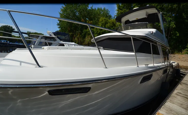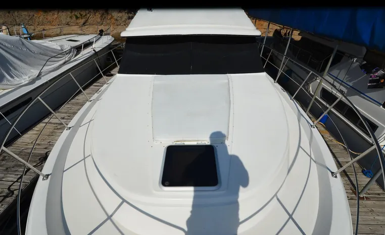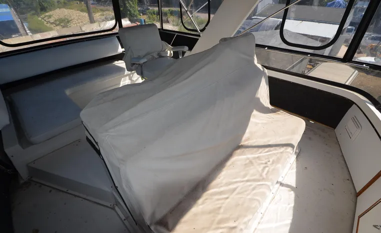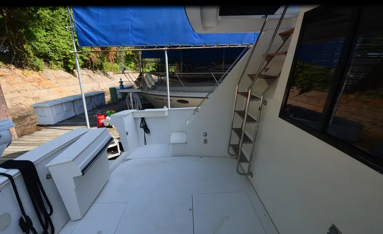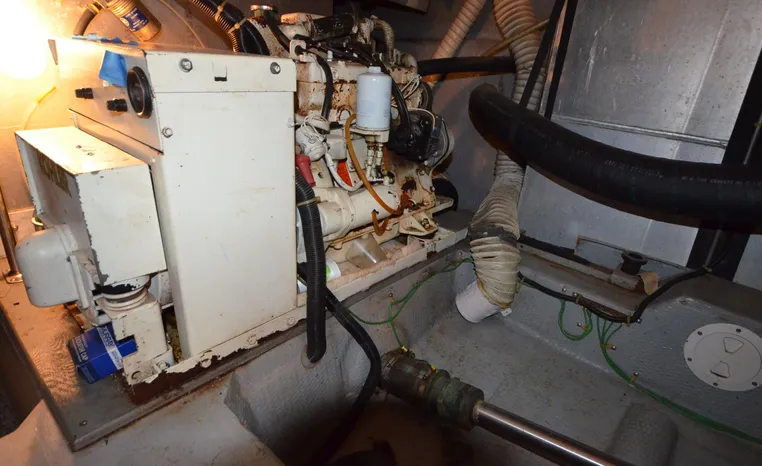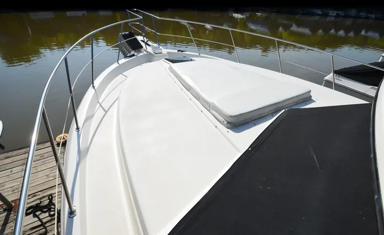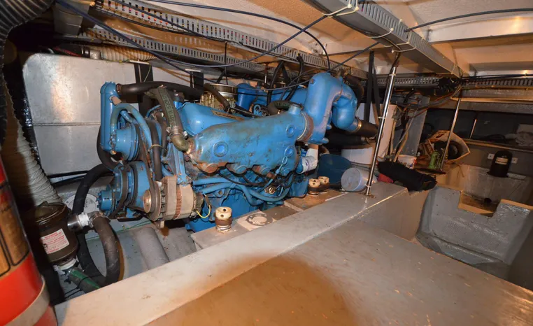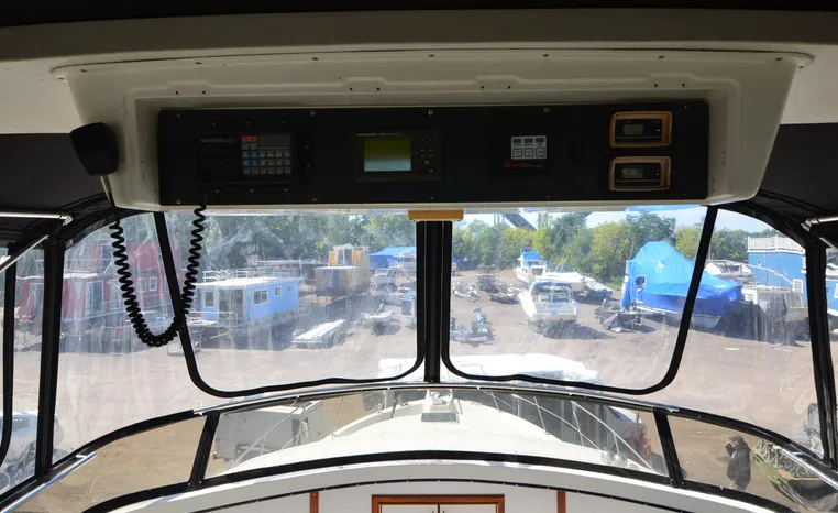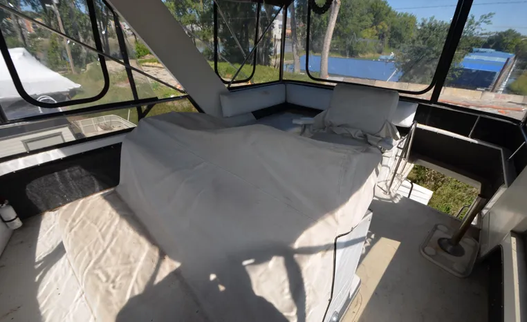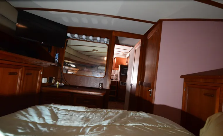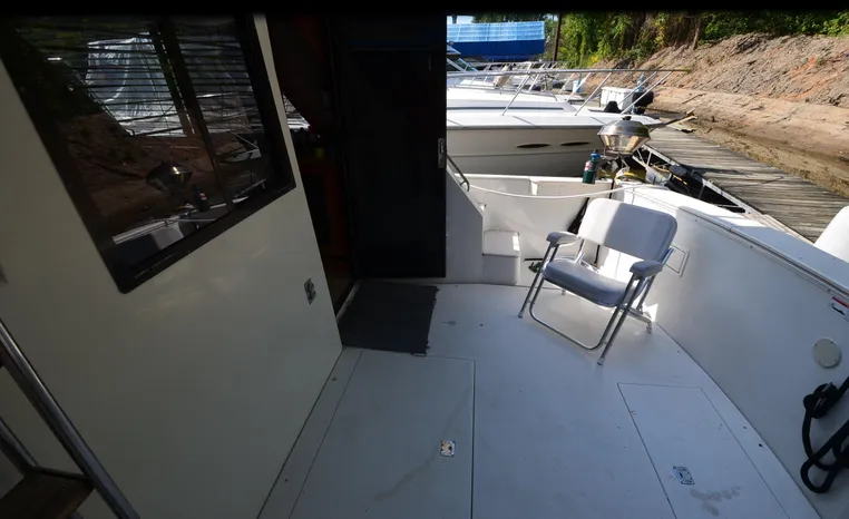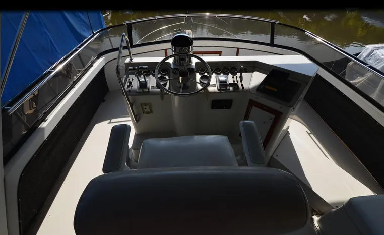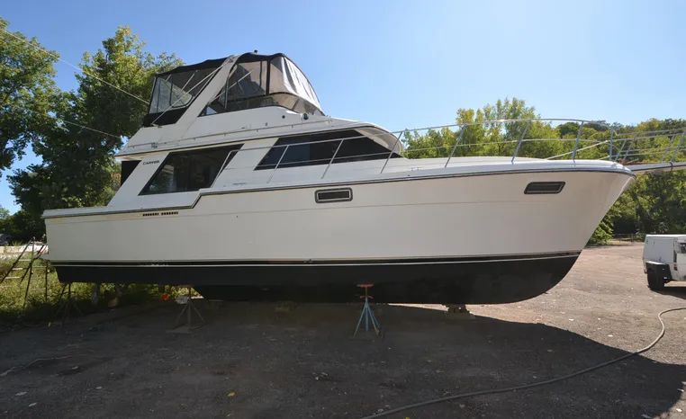 1986 Carver 4227 Cockpit MY, T-350 HP Crusader, GM 454 CID, inboard, enclosed cooling, 1100 approximate hours, Kohler 7.5 kw generator, 1395 approximate hours, dual 50 amp service with shore power cords, three Marine air reverse cycle air/heat units, Raritan Crown head/shower/vanity, sleeps six, master stateroom forward with island queen berth, guest stateroom/office with fold down bunk, Salon, lower helm, convertible sofa, ice maker, two chairs, fold-out dining table, teak woodwork, entertainment center, AM/FM stereo/cassette, dry bar, Galley: full size refrigerator/freezer, Princess three burner stove, microwave/convection oven, two station intercom, VHF marine radio (U/L), depth finder (U/L), engine synchronizing gauge (U/L), Northstar 800 loran, Benmar auto pilot, sum log, dual station remote spot light, anchor, bow pulpit, electric windlass, five fenders, trim tabs, white canvas, bimini top with enclosure, electronics arch, flybridge and cockpit carpet, deck washdown, transom door, swim platform with boarding ladder.