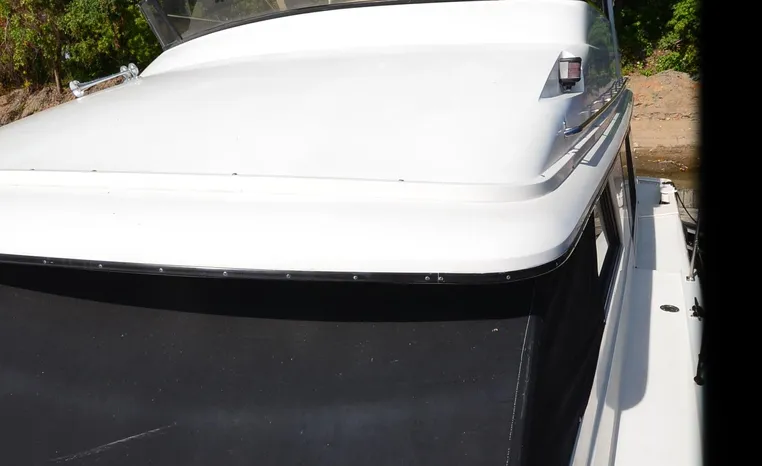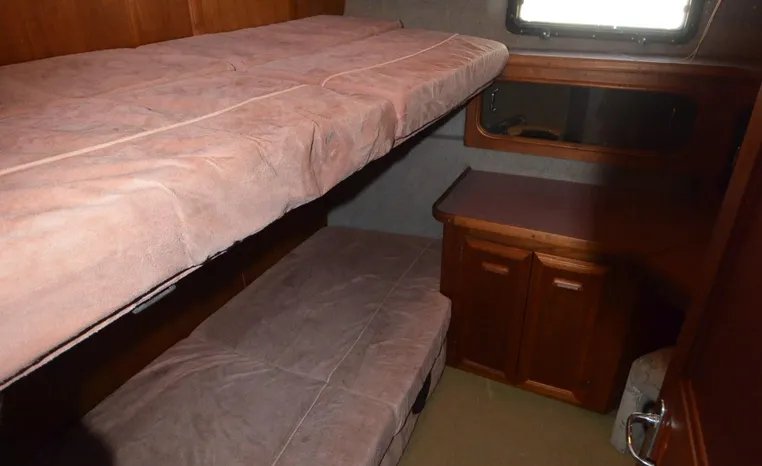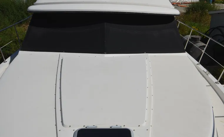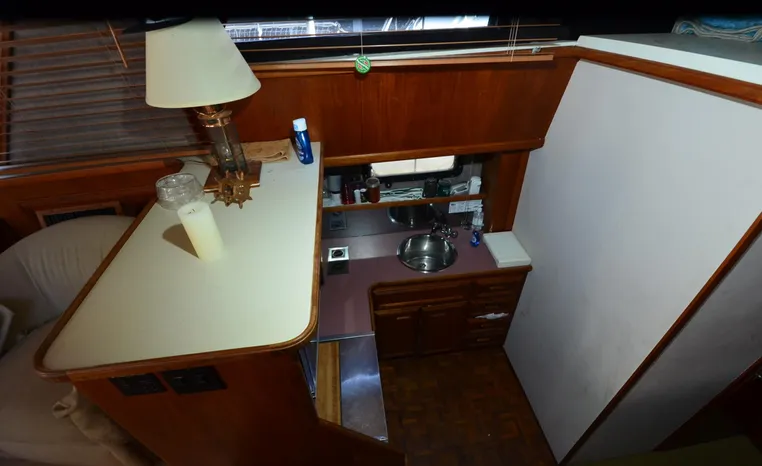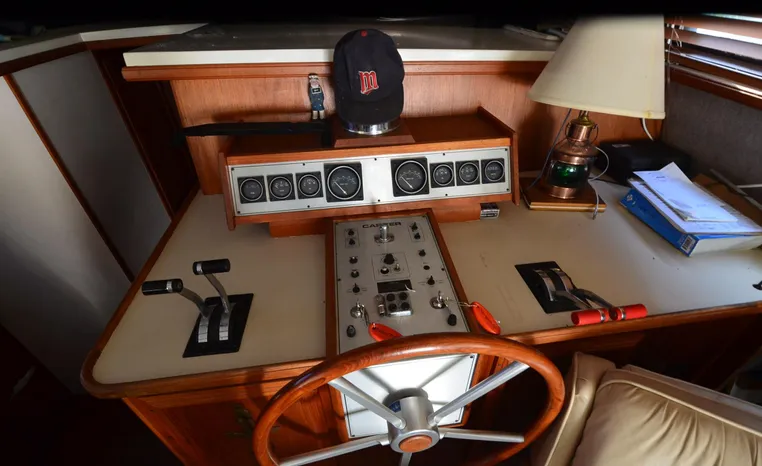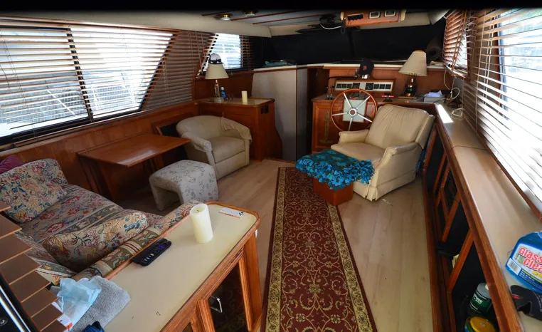 1986 Carver 4227 Cockpit MY, T-350 HP Crusader, GM 454 CID, inboard, enclosed cooling, 1100 approximate hours, Kohler 7.5 kw generator, 1395 approximate hours, dual 50 amp service with shore power cords, three Marine air reverse cycle air/heat units, Raritan Crown head/shower/vanity, sleeps six, master stateroom forward with island queen berth, guest stateroom/office with fold down bunk, Salon, lower helm, convertible sofa, ice maker, two chairs, fold-out dining table, teak woodwork, entertainment center, AM/FM stereo/cassette, dry bar, Galley: full size refrigerator/freezer, Princess three burner stove, microwave/convection oven, two station intercom, VHF marine radio (U/L), depth finder (U/L), engine synchronizing gauge (U/L), Northstar 800 loran, Benmar auto pilot, sum log, dual station remote spot light, anchor, bow pulpit, electric windlass, five fenders, trim tabs, white canvas, bimini top with enclosure, electronics arch, flybridge and cockpit carpet, deck washdown, transom door, swim platform with boarding ladder.