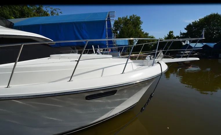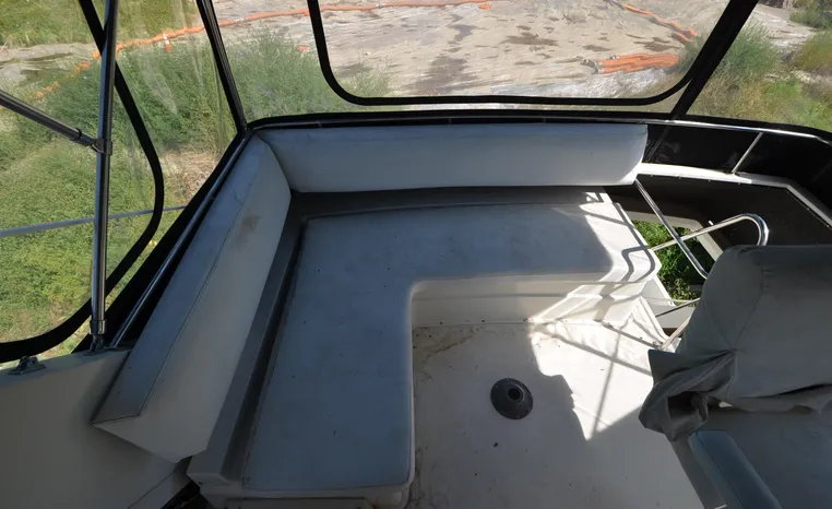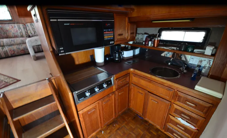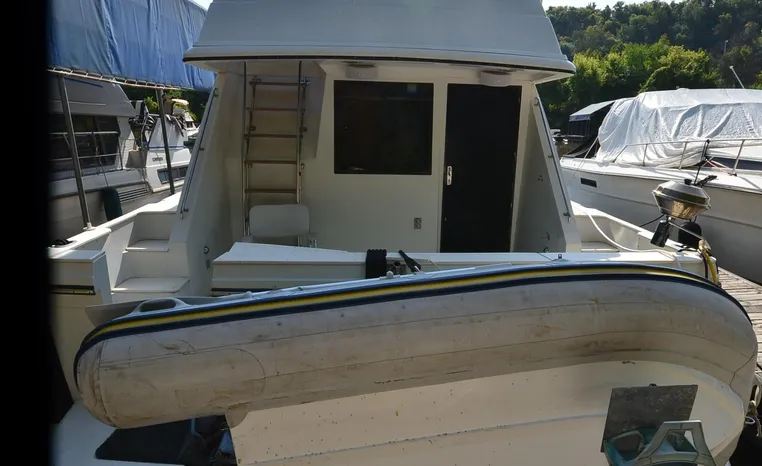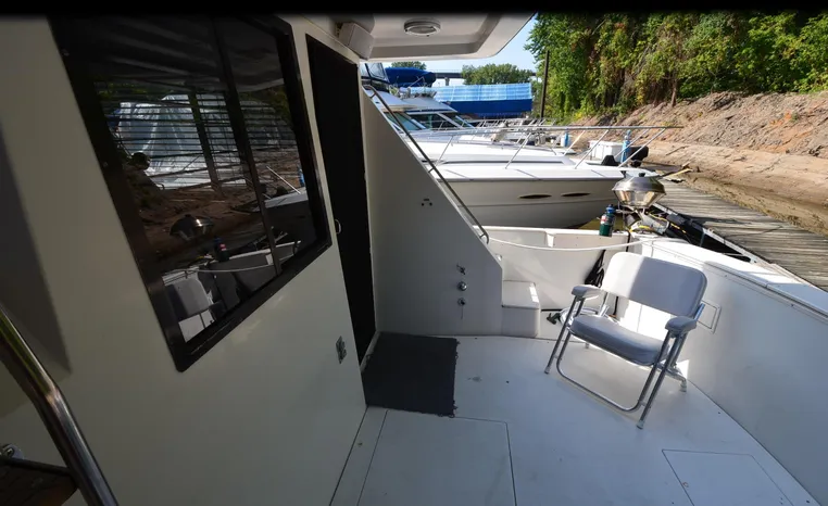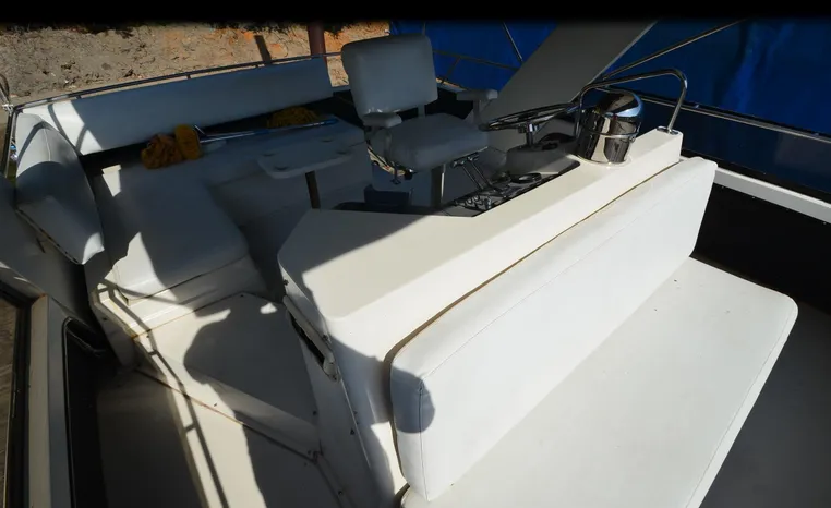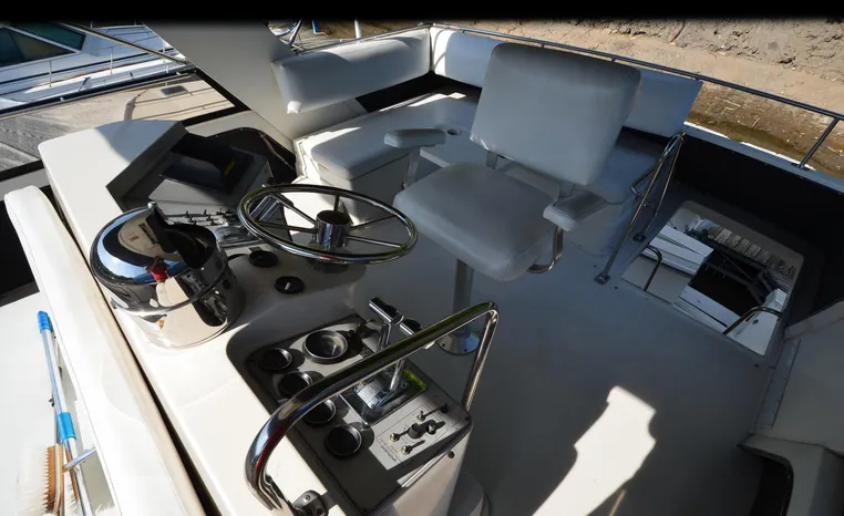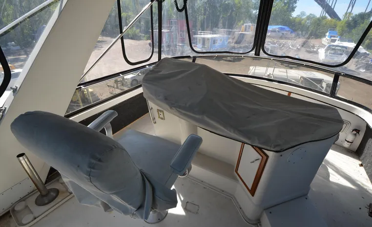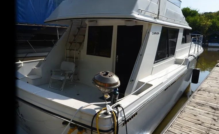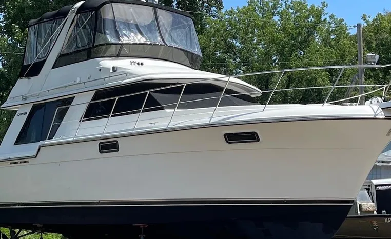 1986 Carver 4227 Cockpit MY, T-350 HP Crusader, GM 454 CID, inboard, enclosed cooling, 1100 approximate hours, Kohler 7.5 kw generator, 1395 approximate hours, dual 50 amp service with shore power cords, three Marine air reverse cycle air/heat units, Raritan Crown head/shower/vanity, sleeps six, master stateroom forward with island queen berth, guest stateroom/office with fold down bunk, Salon, lower helm, convertible sofa, ice maker, two chairs, fold-out dining table, teak woodwork, entertainment center, AM/FM stereo/cassette, dry bar, Galley: full size refrigerator/freezer, Princess three burner stove, microwave/convection oven, two station intercom, VHF marine radio (U/L), depth finder (U/L), engine synchronizing gauge (U/L), Northstar 800 loran, Benmar auto pilot, sum log, dual station remote spot light, anchor, bow pulpit, electric windlass, five fenders, trim tabs, white canvas, bimini top with enclosure, electronics arch, flybridge and cockpit carpet, deck washdown, transom door, swim platform with boarding ladder.