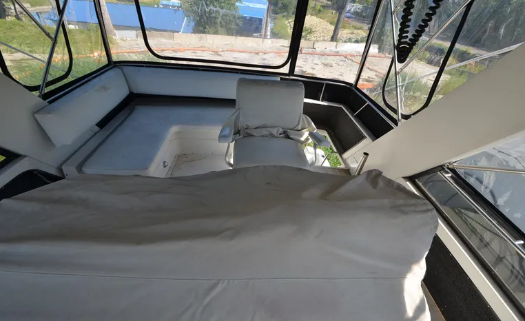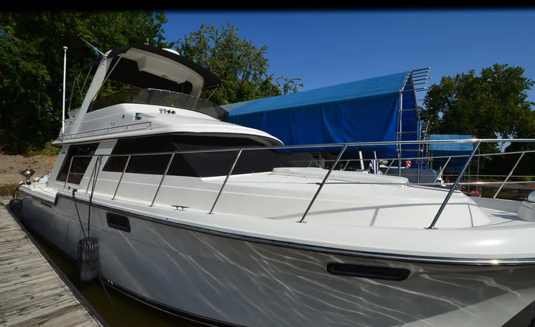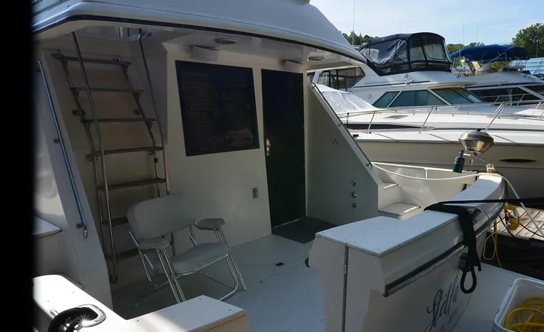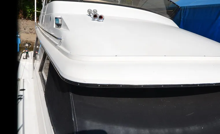 1986 Carver 4227 Cockpit MY, T-350 HP Crusader, GM 454 CID, inboard, enclosed cooling, 1100 approximate hours, Kohler 7.5 kw generator, 1395 approximate hours, dual 50 amp service with shore power cords, three Marine air reverse cycle air/heat units, Raritan Crown head/shower/vanity, sleeps six, master stateroom forward with island queen berth, guest stateroom/office with fold down bunk, Salon, lower helm, convertible sofa, ice maker, two chairs, fold-out dining table, teak woodwork, entertainment center, AM/FM stereo/cassette, dry bar, Galley: full size refrigerator/freezer, Princess three burner stove, microwave/convection oven, two station intercom, VHF marine radio (U/L), depth finder (U/L), engine synchronizing gauge (U/L), Northstar 800 loran, Benmar auto pilot, sum log, dual station remote spot light, anchor, bow pulpit, electric windlass, five fenders, trim tabs, white canvas, bimini top with enclosure, electronics arch, flybridge and cockpit carpet, deck washdown, transom door, swim platform with boarding ladder.