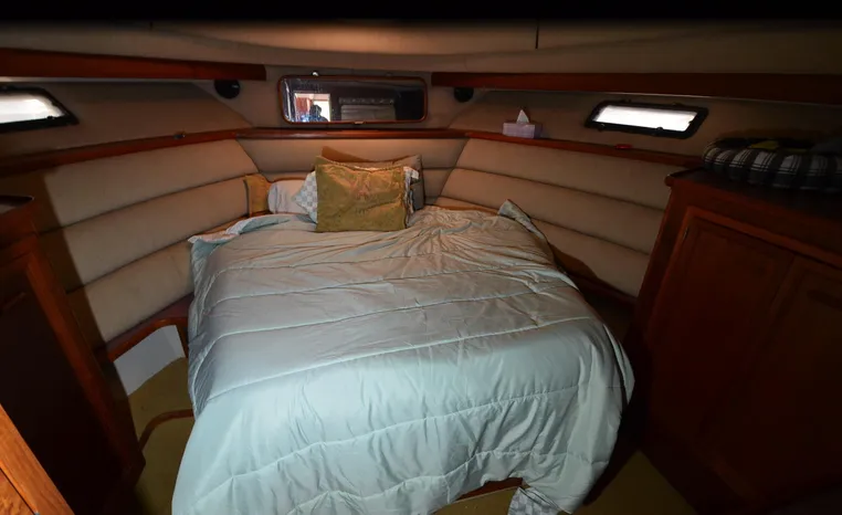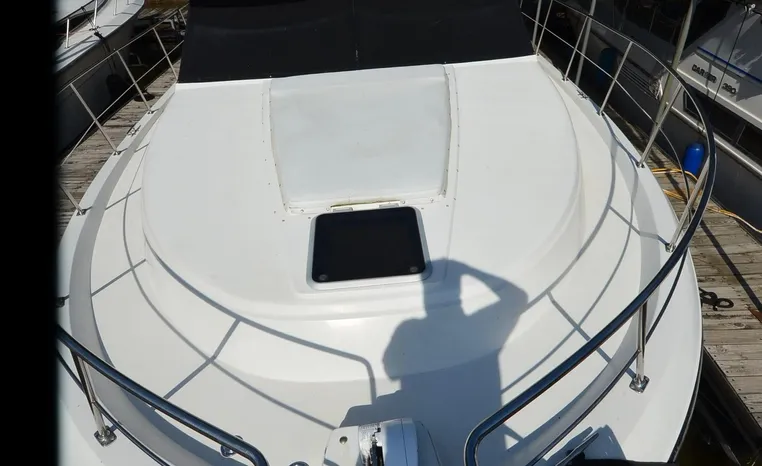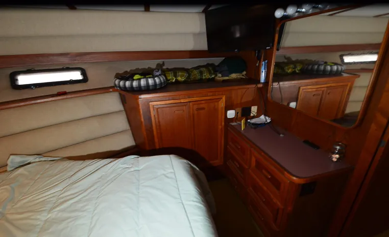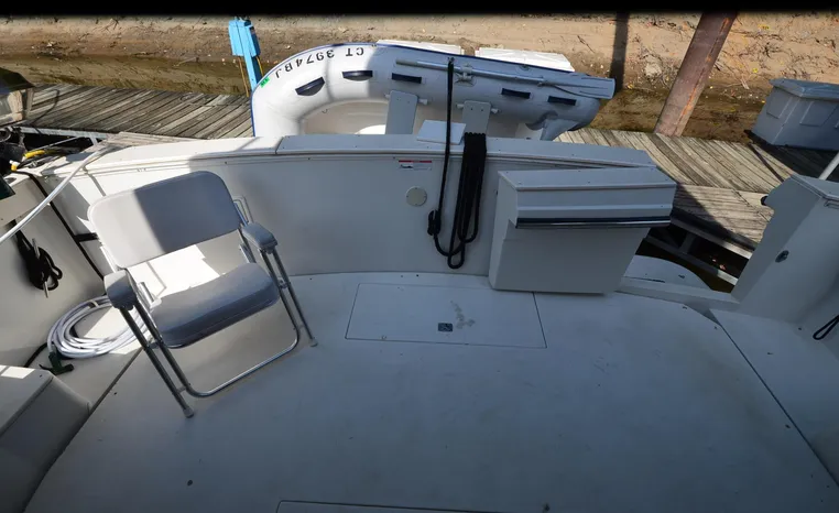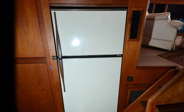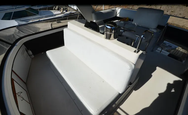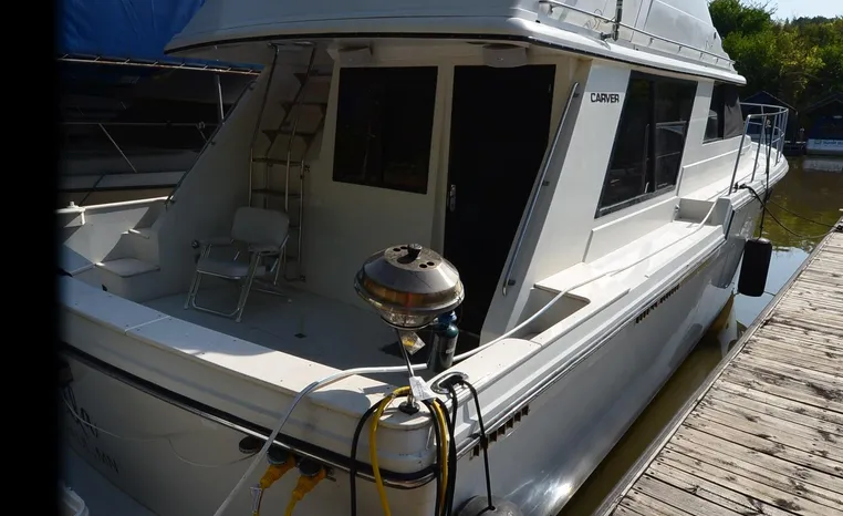 1986 Carver 4227 Cockpit MY, T-350 HP Crusader, GM 454 CID, inboard, enclosed cooling, 1100 approximate hours, Kohler 7.5 kw generator, 1395 approximate hours, dual 50 amp service with shore power cords, three Marine air reverse cycle air/heat units, Raritan Crown head/shower/vanity, sleeps six, master stateroom forward with island queen berth, guest stateroom/office with fold down bunk, Salon, lower helm, convertible sofa, ice maker, two chairs, fold-out dining table, teak woodwork, entertainment center, AM/FM stereo/cassette, dry bar, Galley: full size refrigerator/freezer, Princess three burner stove, microwave/convection oven, two station intercom, VHF marine radio (U/L), depth finder (U/L), engine synchronizing gauge (U/L), Northstar 800 loran, Benmar auto pilot, sum log, dual station remote spot light, anchor, bow pulpit, electric windlass, five fenders, trim tabs, white canvas, bimini top with enclosure, electronics arch, flybridge and cockpit carpet, deck washdown, transom door, swim platform with boarding ladder.