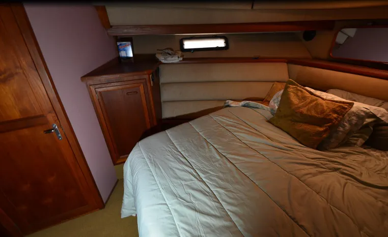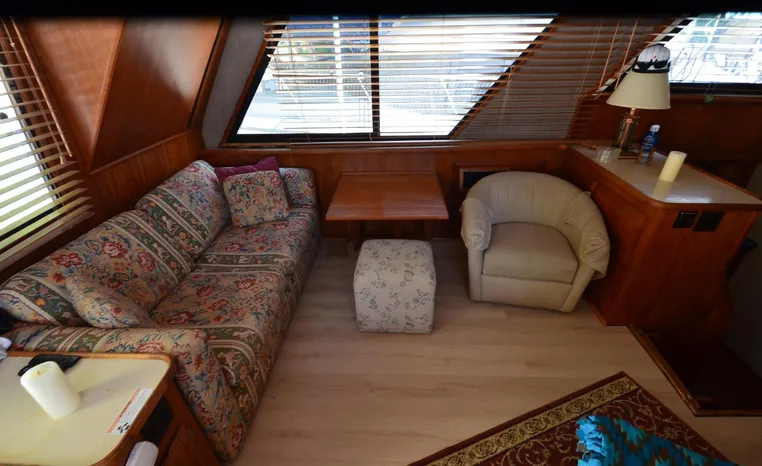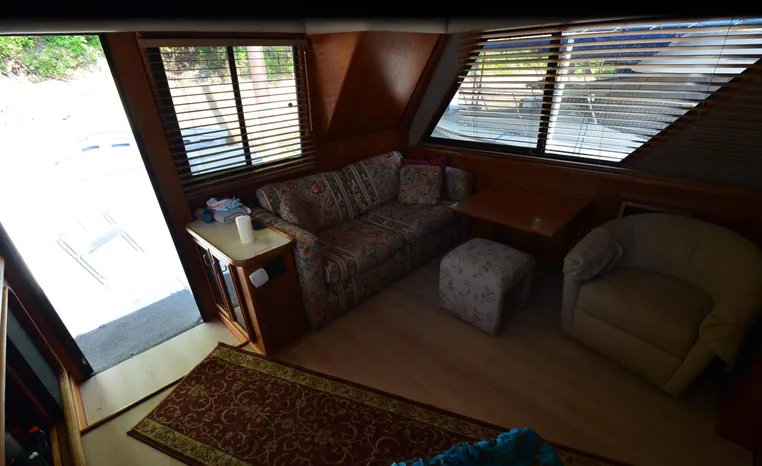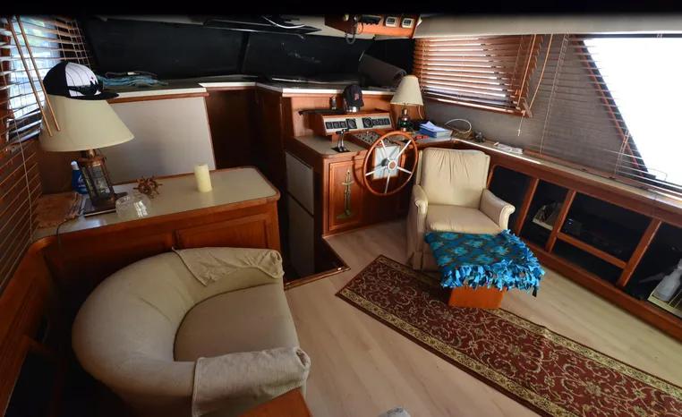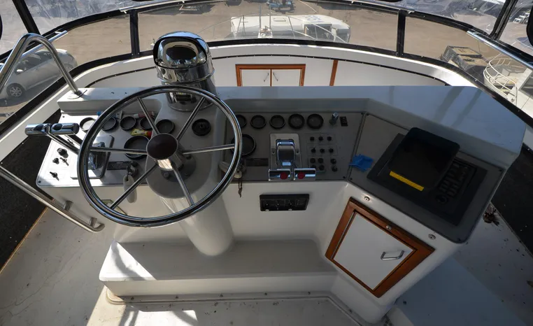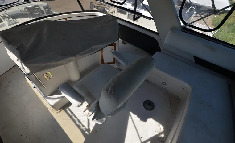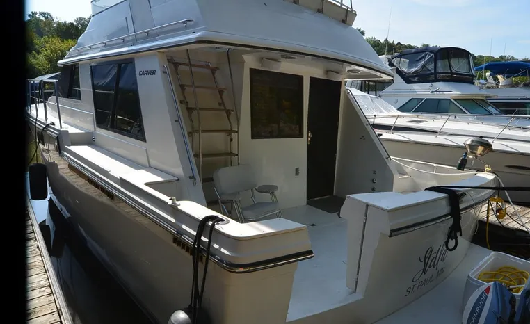 1986 Carver 4227 Cockpit MY, T-350 HP Crusader, GM 454 CID, inboard, enclosed cooling, 1100 approximate hours, Kohler 7.5 kw generator, 1395 approximate hours, dual 50 amp service with shore power cords, three Marine air reverse cycle air/heat units, Raritan Crown head/shower/vanity, sleeps six, master stateroom forward with island queen berth, guest stateroom/office with fold down bunk, Salon, lower helm, convertible sofa, ice maker, two chairs, fold-out dining table, teak woodwork, entertainment center, AM/FM stereo/cassette, dry bar, Galley: full size refrigerator/freezer, Princess three burner stove, microwave/convection oven, two station intercom, VHF marine radio (U/L), depth finder (U/L), engine synchronizing gauge (U/L), Northstar 800 loran, Benmar auto pilot, sum log, dual station remote spot light, anchor, bow pulpit, electric windlass, five fenders, trim tabs, white canvas, bimini top with enclosure, electronics arch, flybridge and cockpit carpet, deck washdown, transom door, swim platform with boarding ladder.