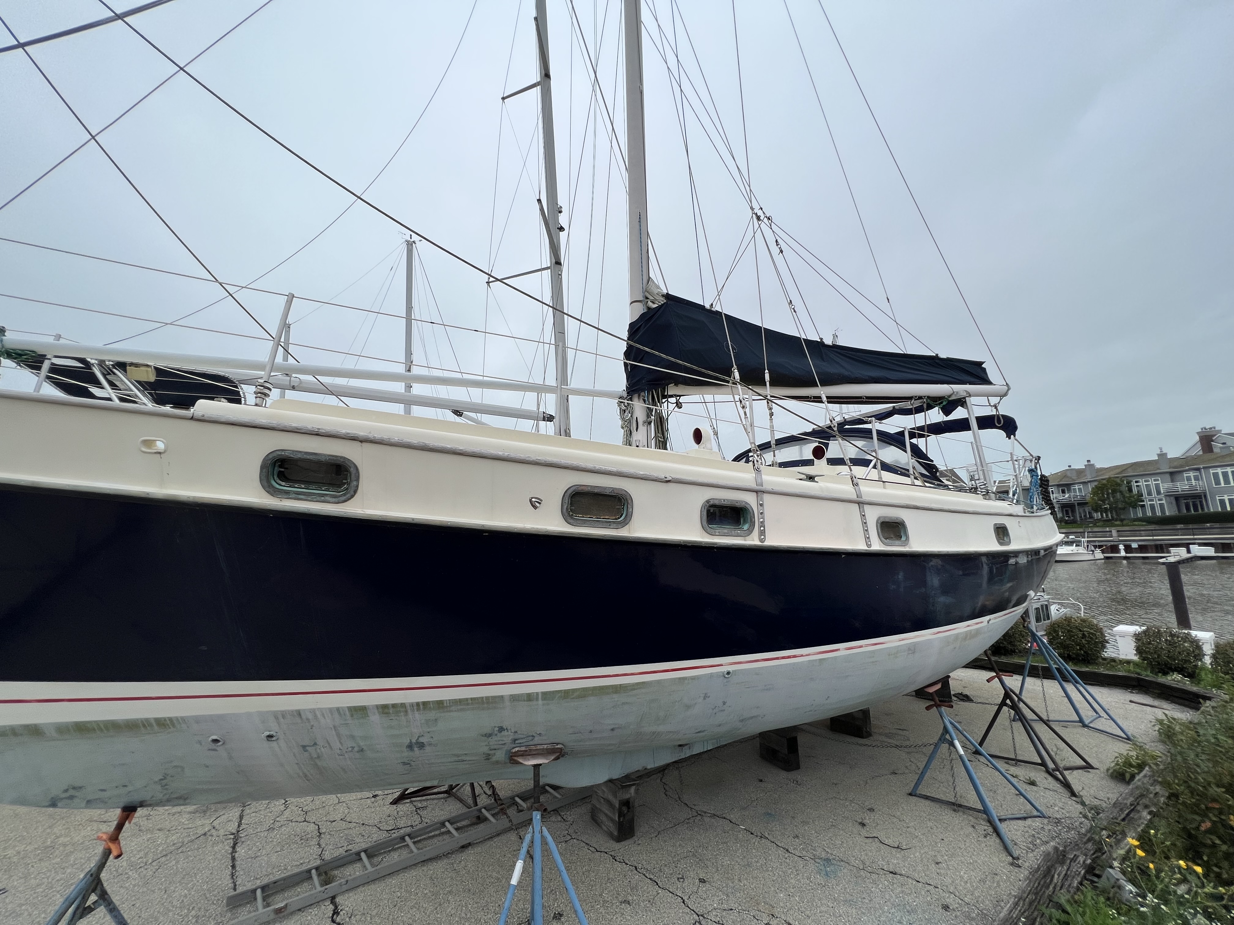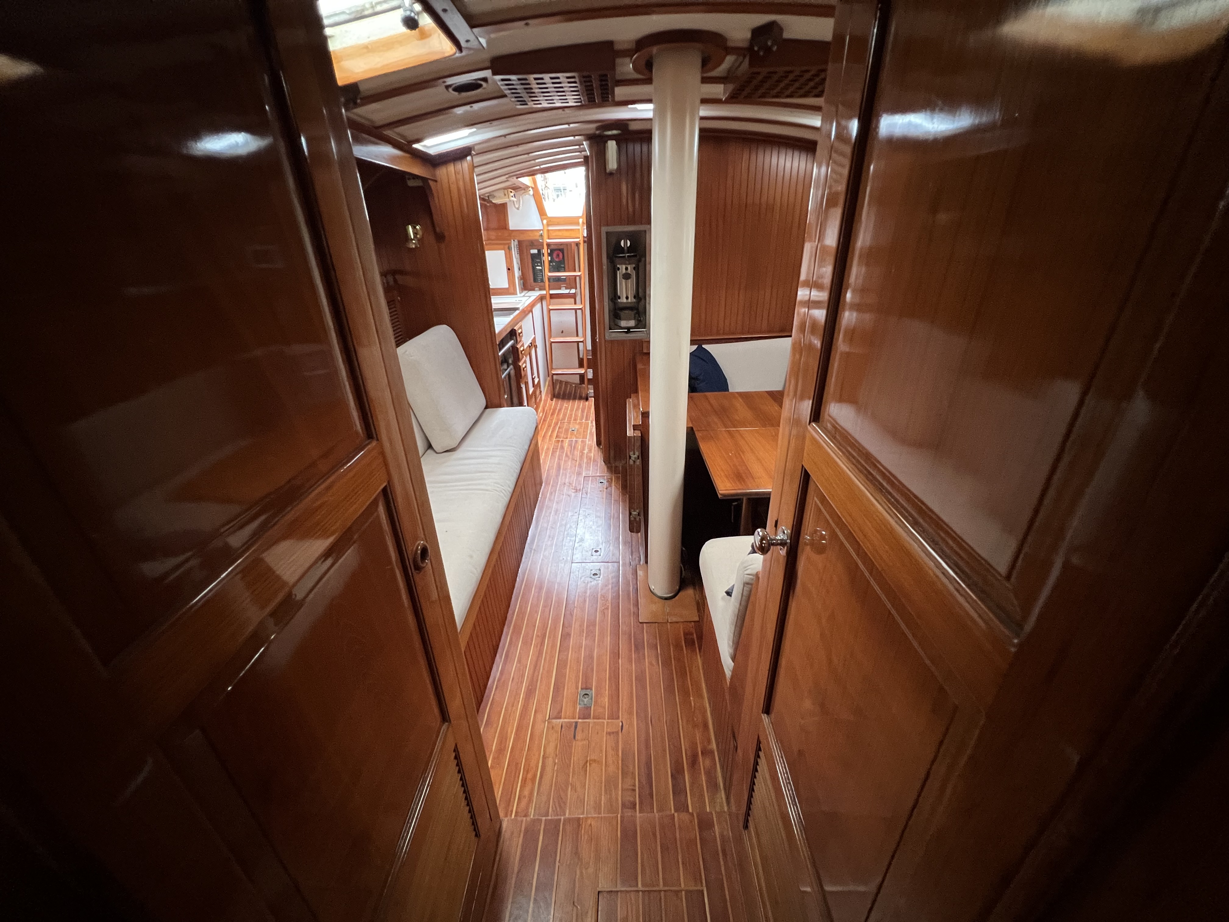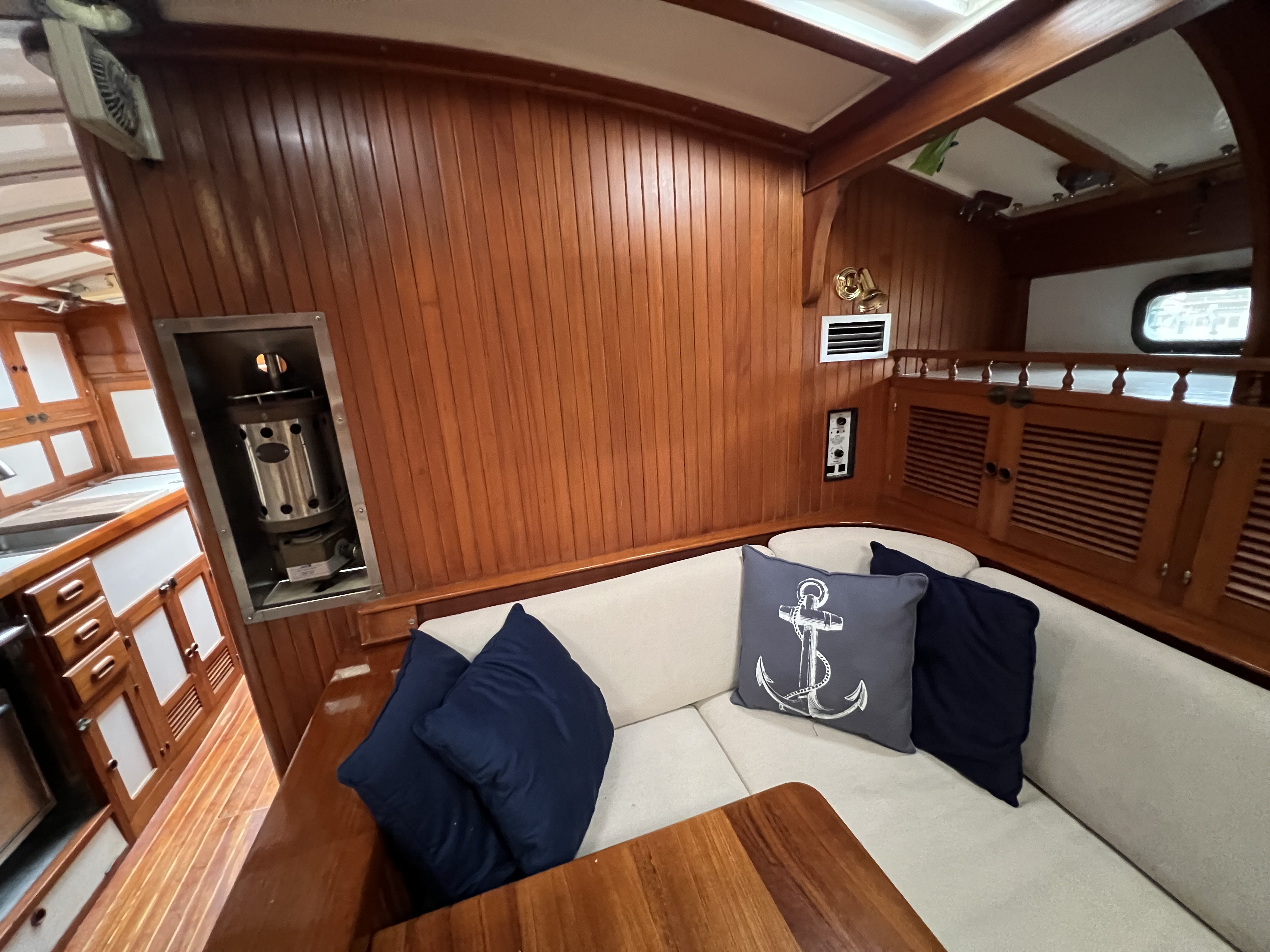 The Krogen 38 was designed by Jim Krogen as his own personal sailboat for gunkholing in the shoal waters of Florida and the Bahamas. She's meant to be single or shorthanded weeks at a time in a sailors paradise. The interior is varnished teak and white battened overhead. Ten bronze opening port lights, 4 aluminum framed deck hatches, three deck prisms, (4)four - 4" Dorade vents and 1 cabin fan provide excellent natural light and ventilation. There is DC LED lighting including courtesy lights to illuminate the teak and holly cabin sole.