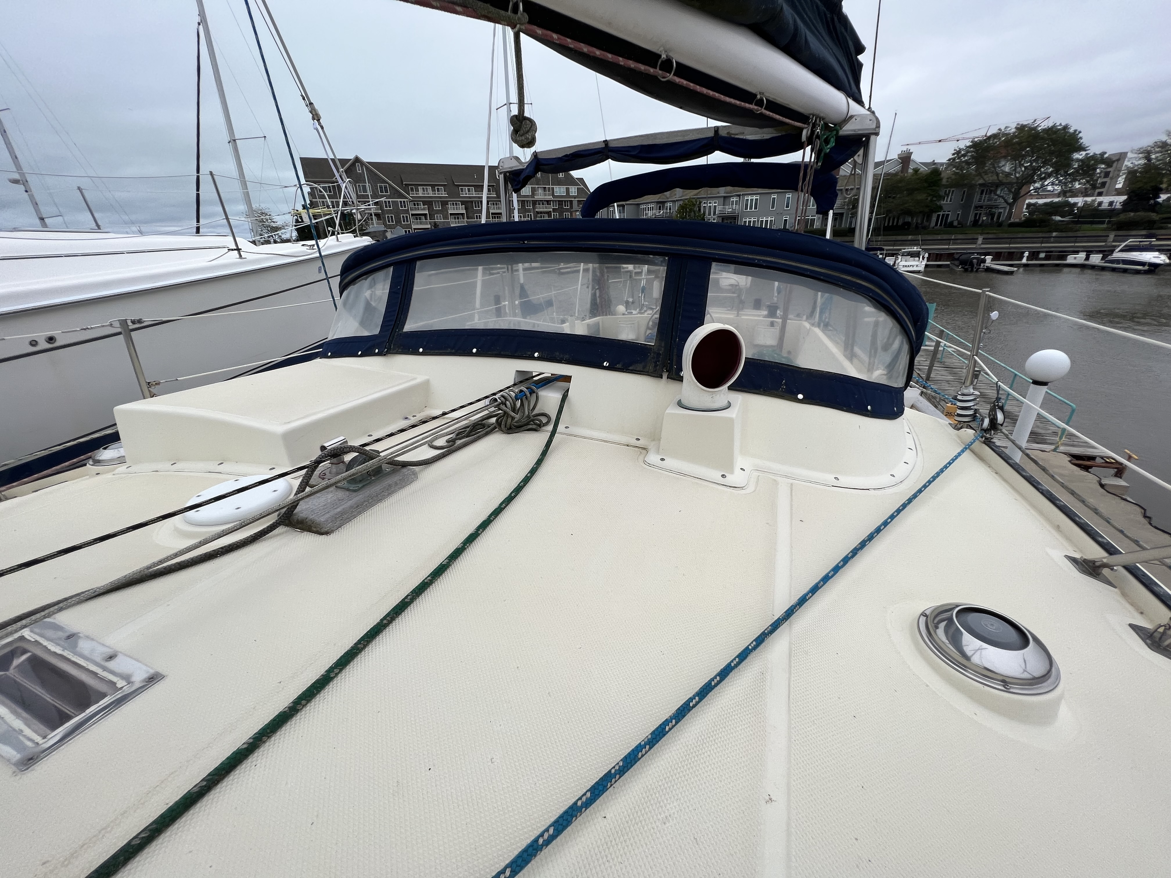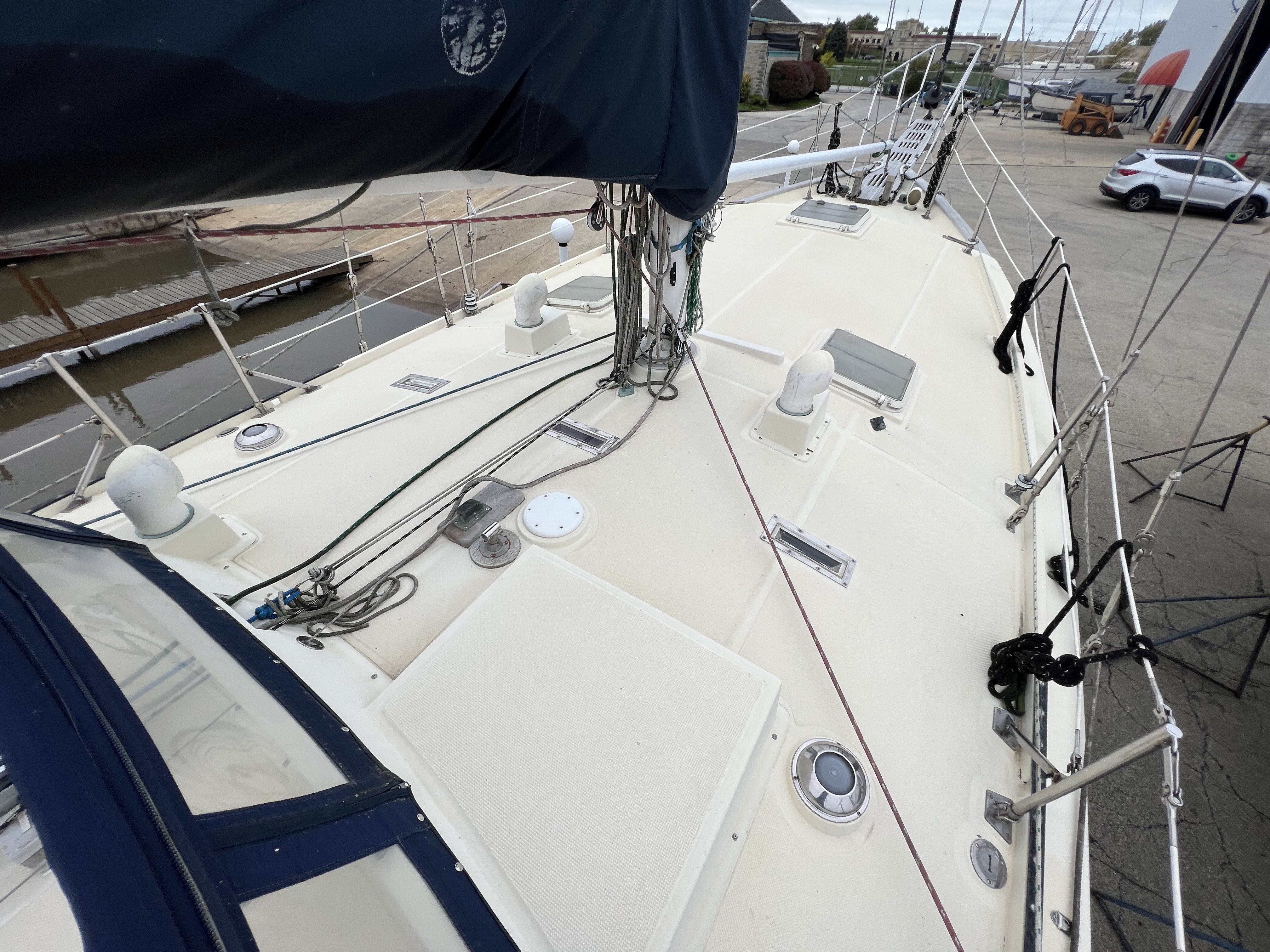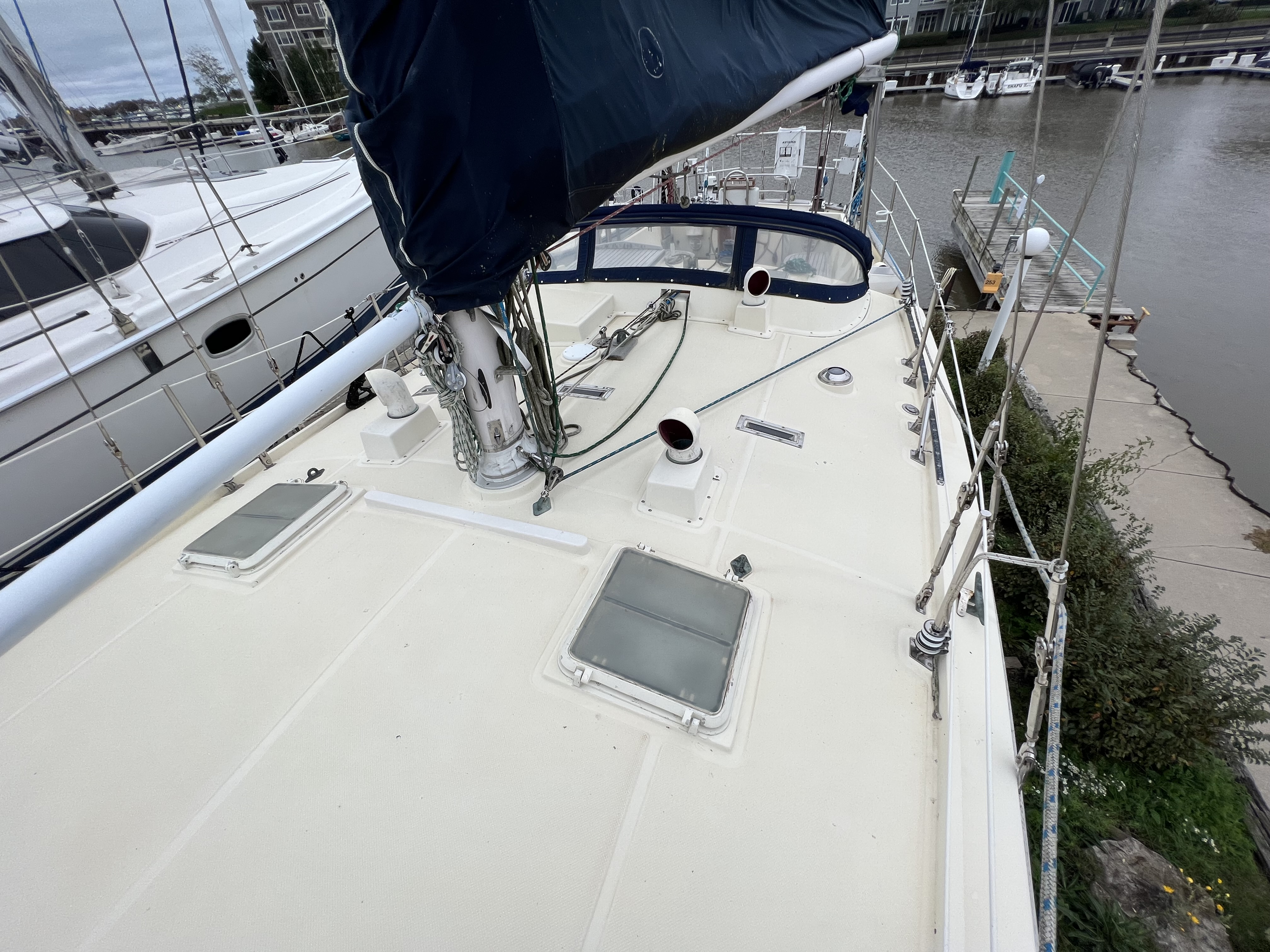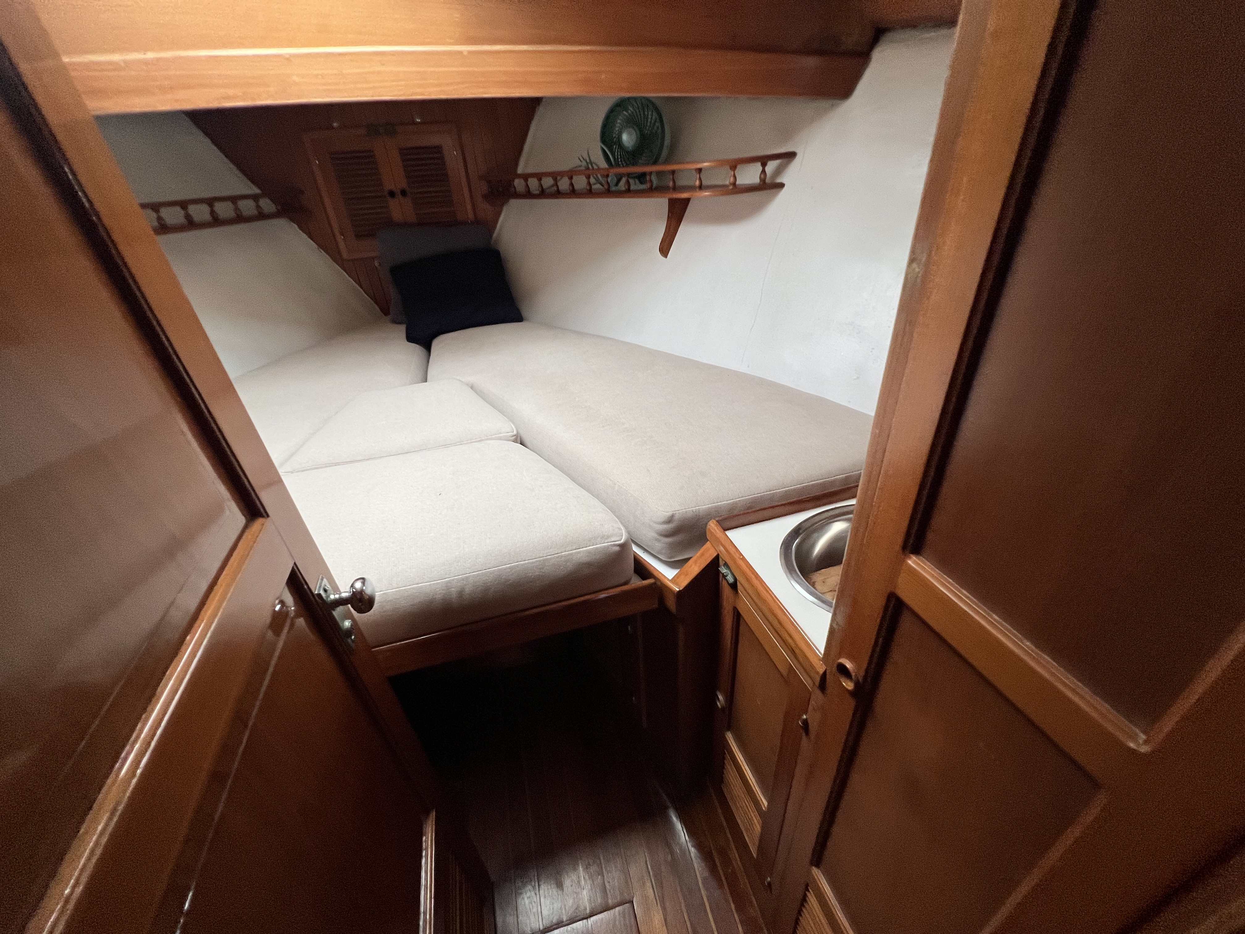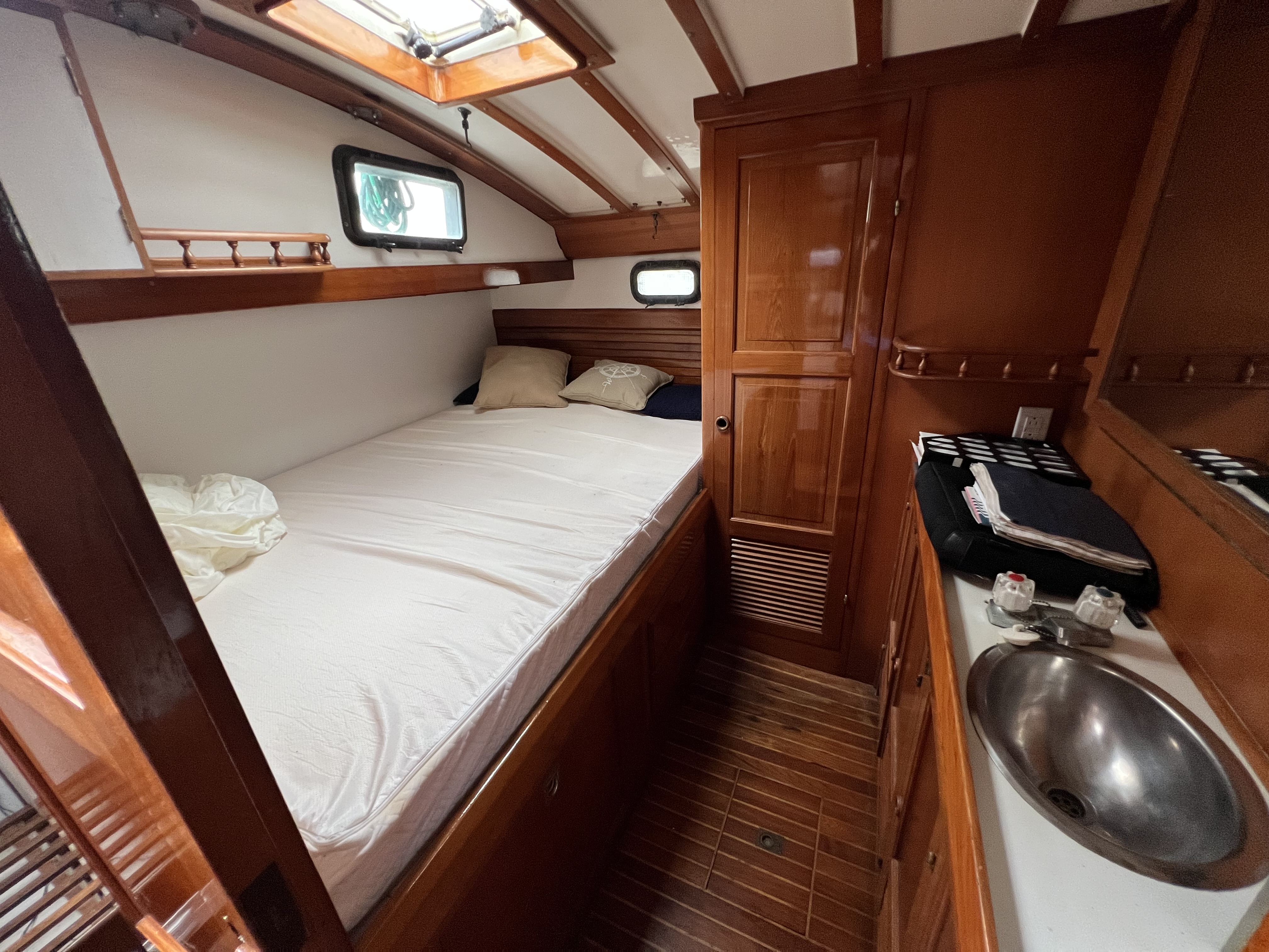 •The forward cabin has a double vee berth, port & starboard shelves, counter with sink, hanging locker, cabnetry, deck hatch, and two opening ports.