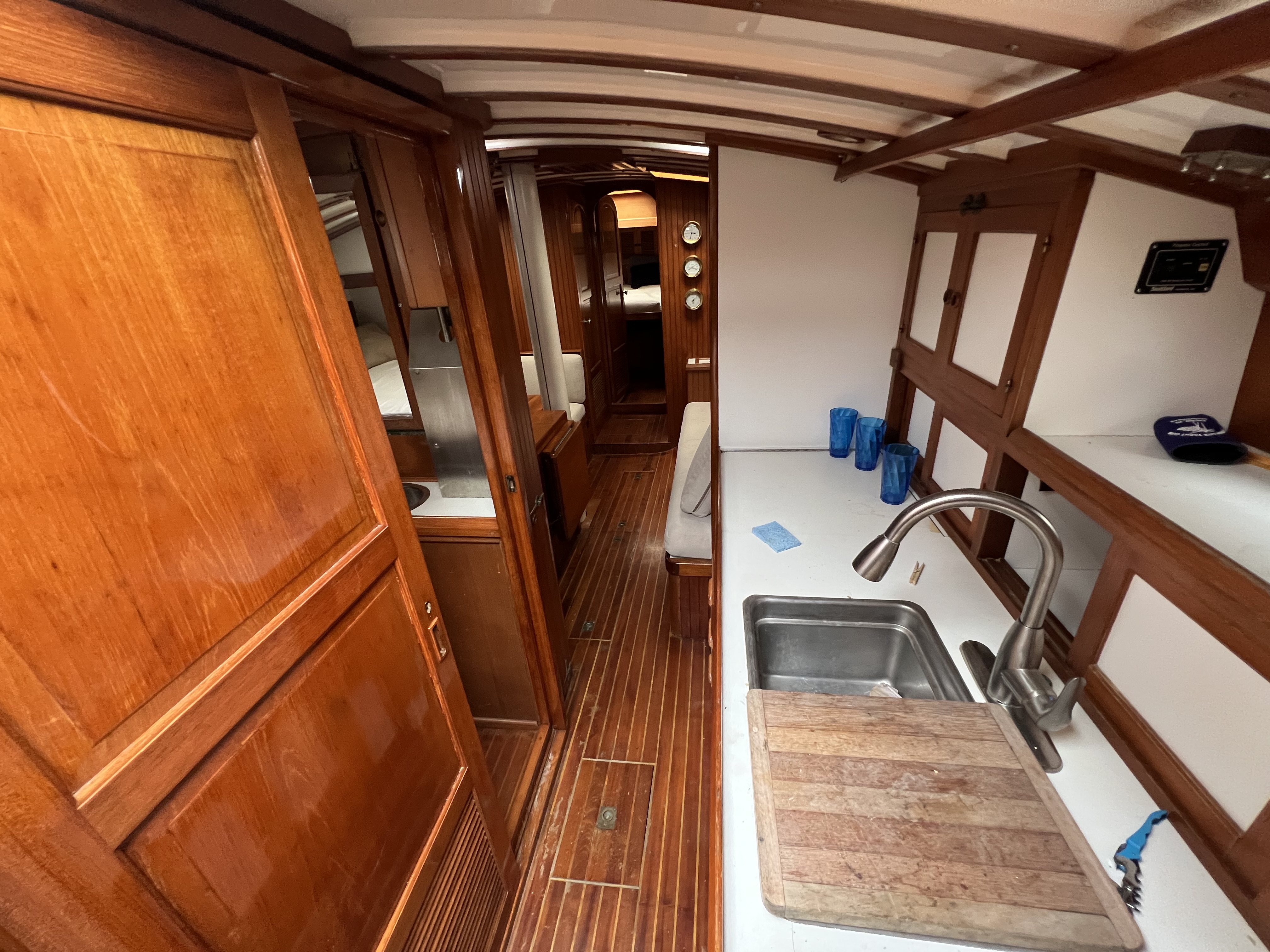 Water: two 75 gallon self-trimming stainless steel water tanks under the settees for a total of 150 gallons