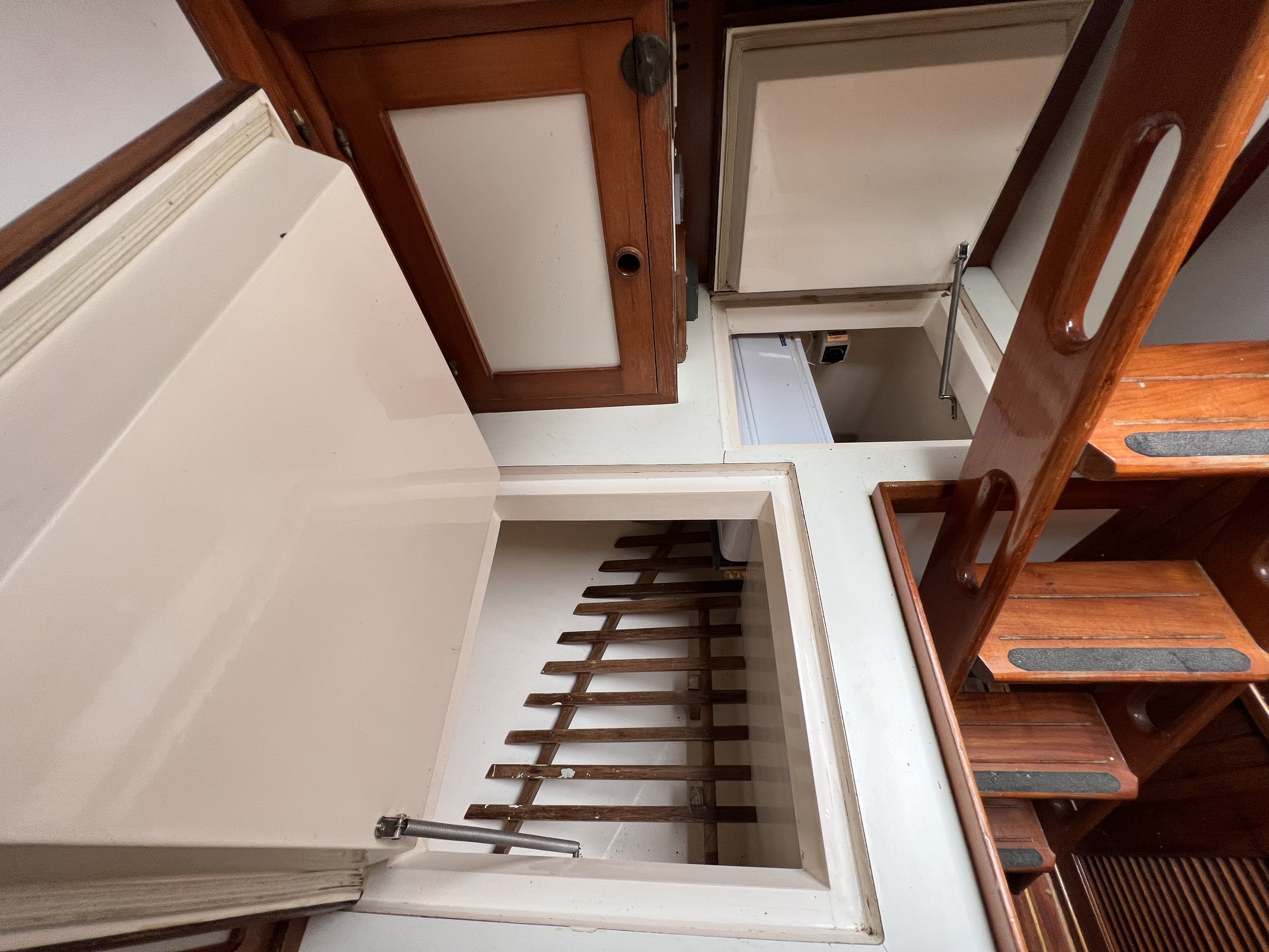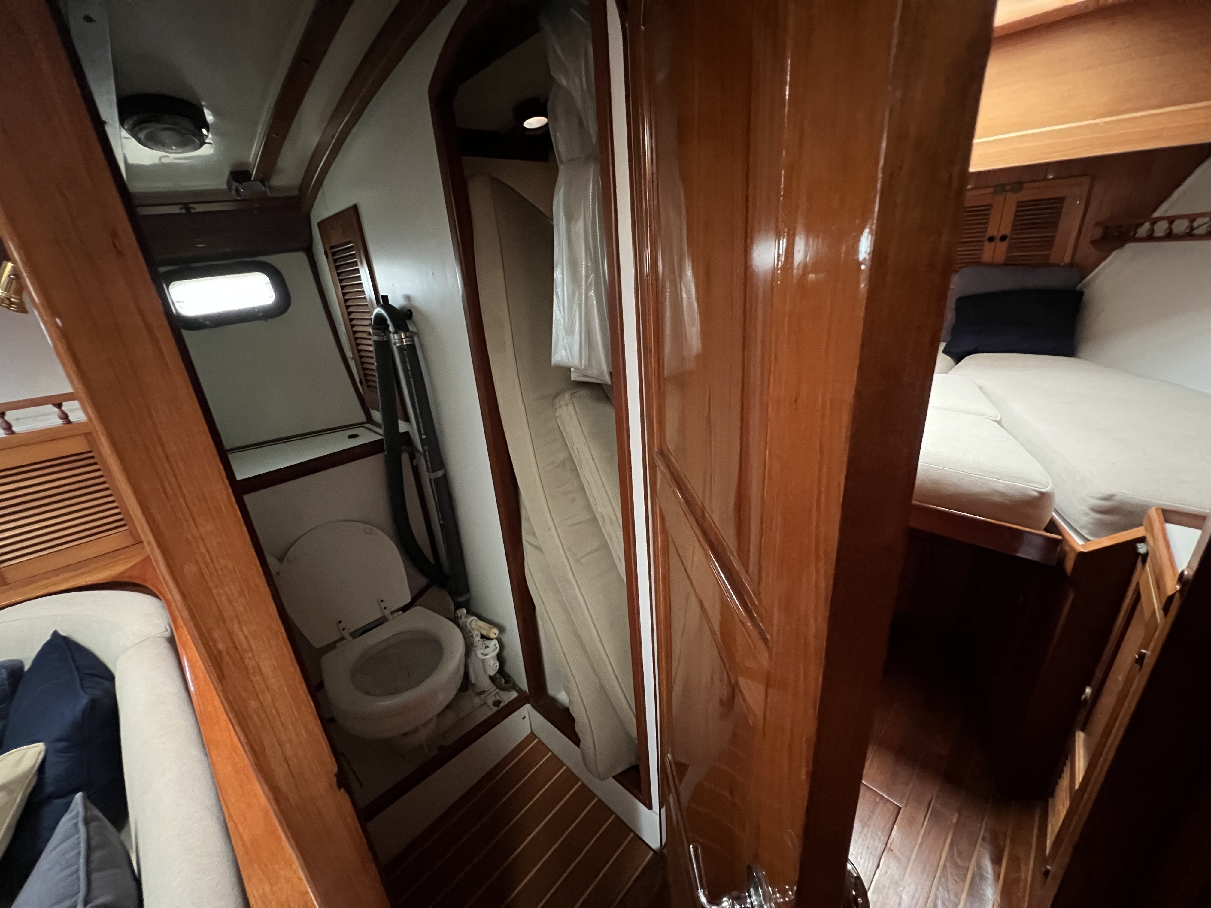 •The head compartment is to port with a manual head & holding tank (deck discharge with bypass for direct discharge) separate shower stall, shower grate, independent shower sump pump, cabinet and storage shelves, and opening port.