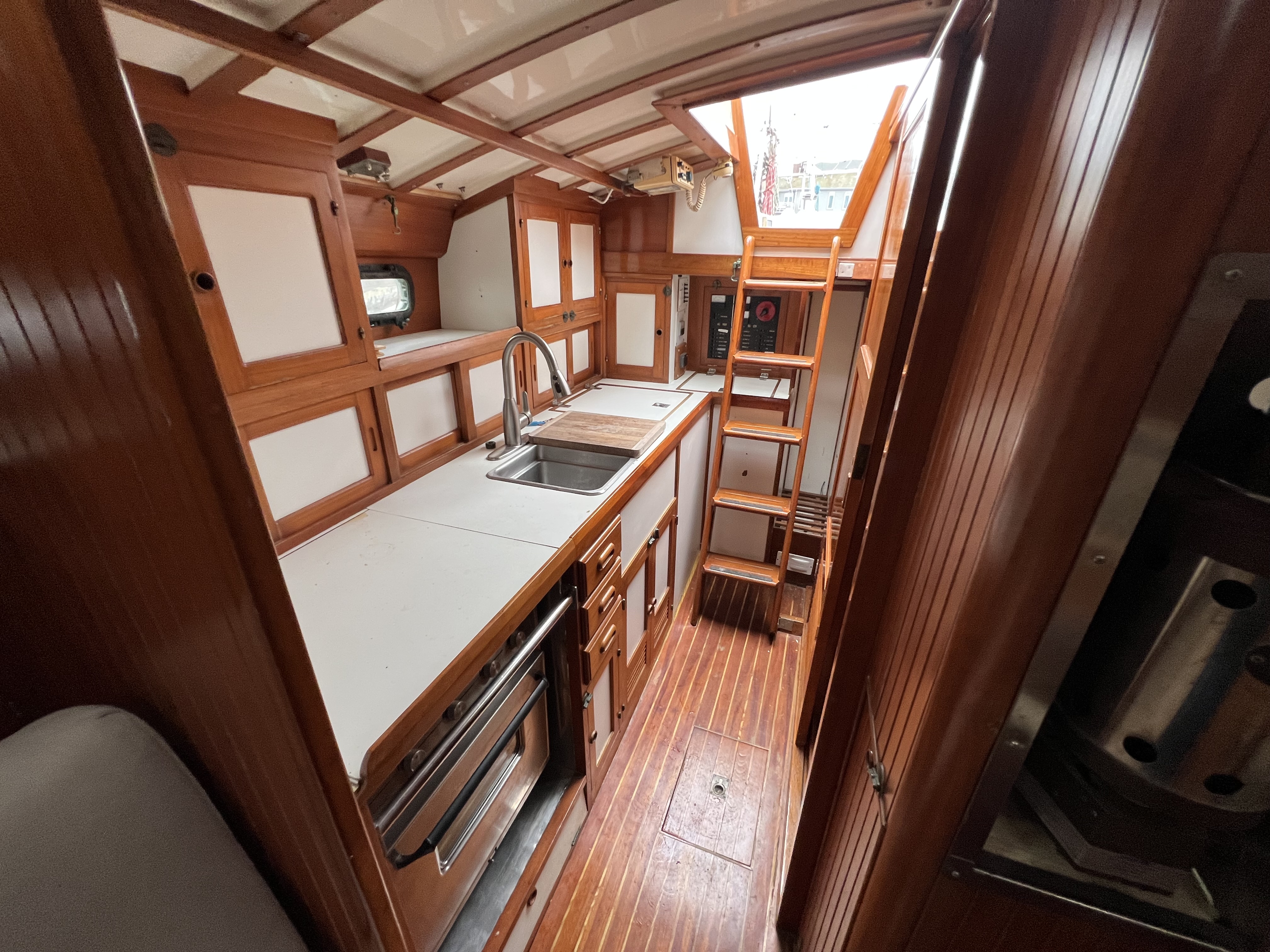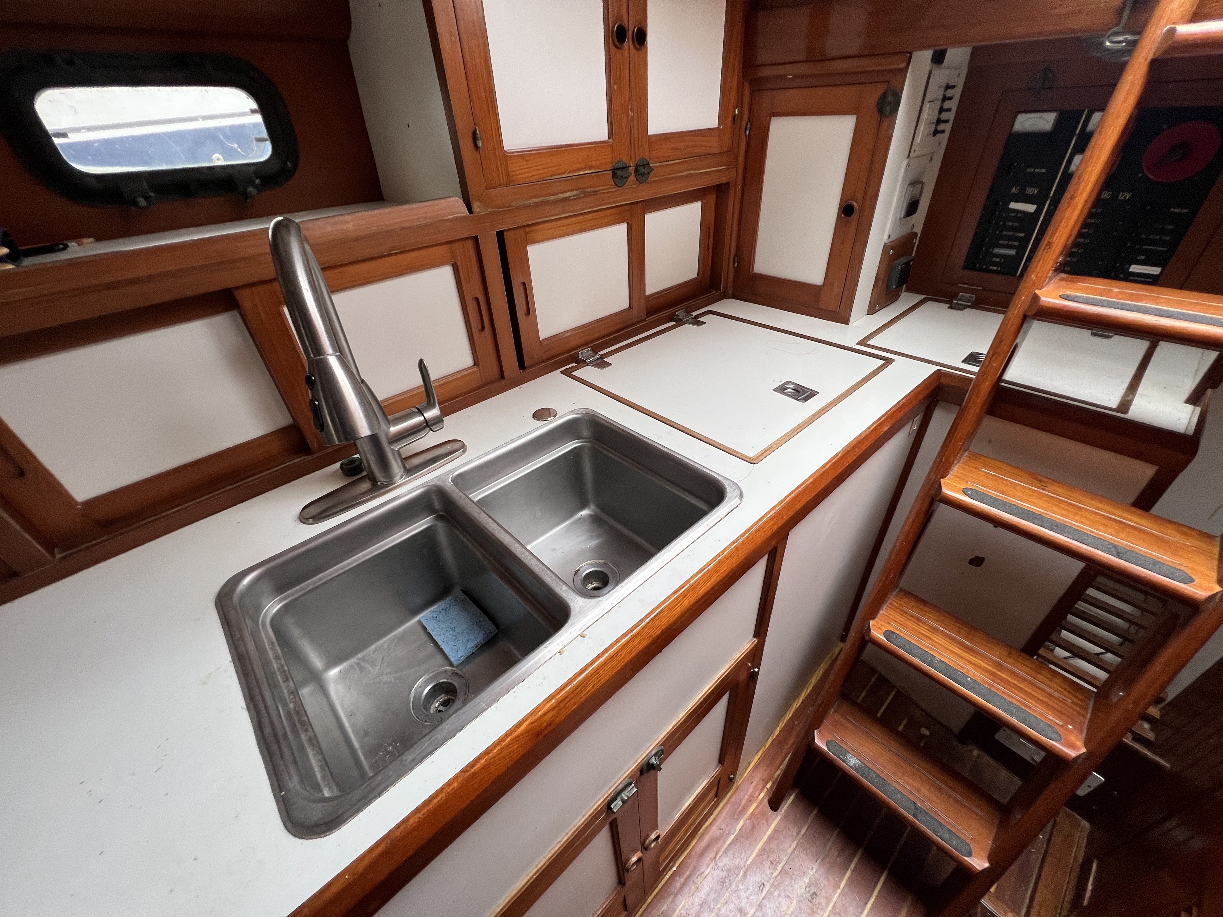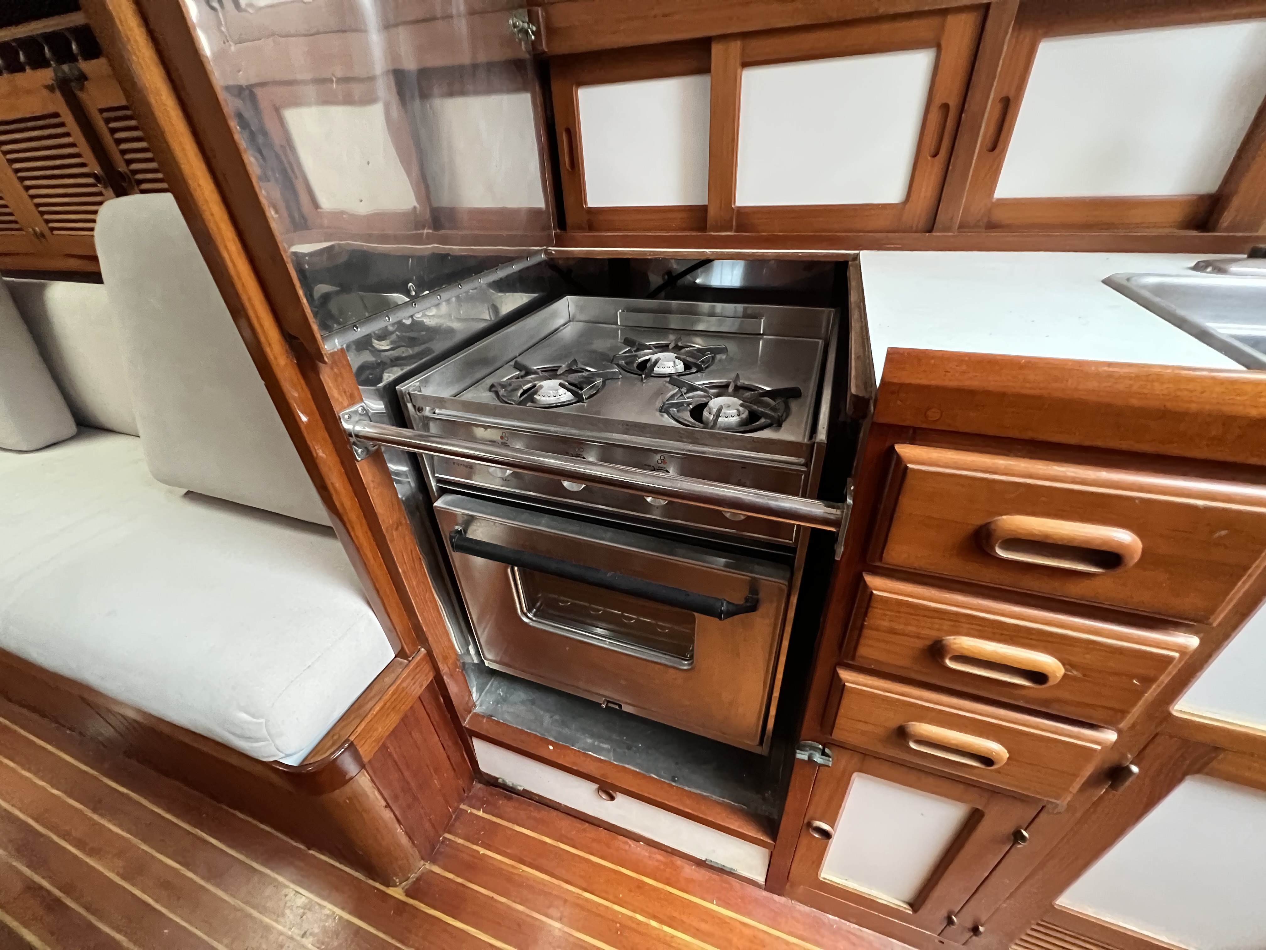 •The L-shaped galley to starboard has storage galore, double stainless steel sink, hot and cold pressure water, shore side water with an Atlantic Marine 10 Gal. 110v AC/engine heated water heater, a large top load insulated ice box w/ Isotherm compact classic model 2501, 12v DC refrigeration (2014), a gimbal 3 burner Hillerange propane stove/oven.