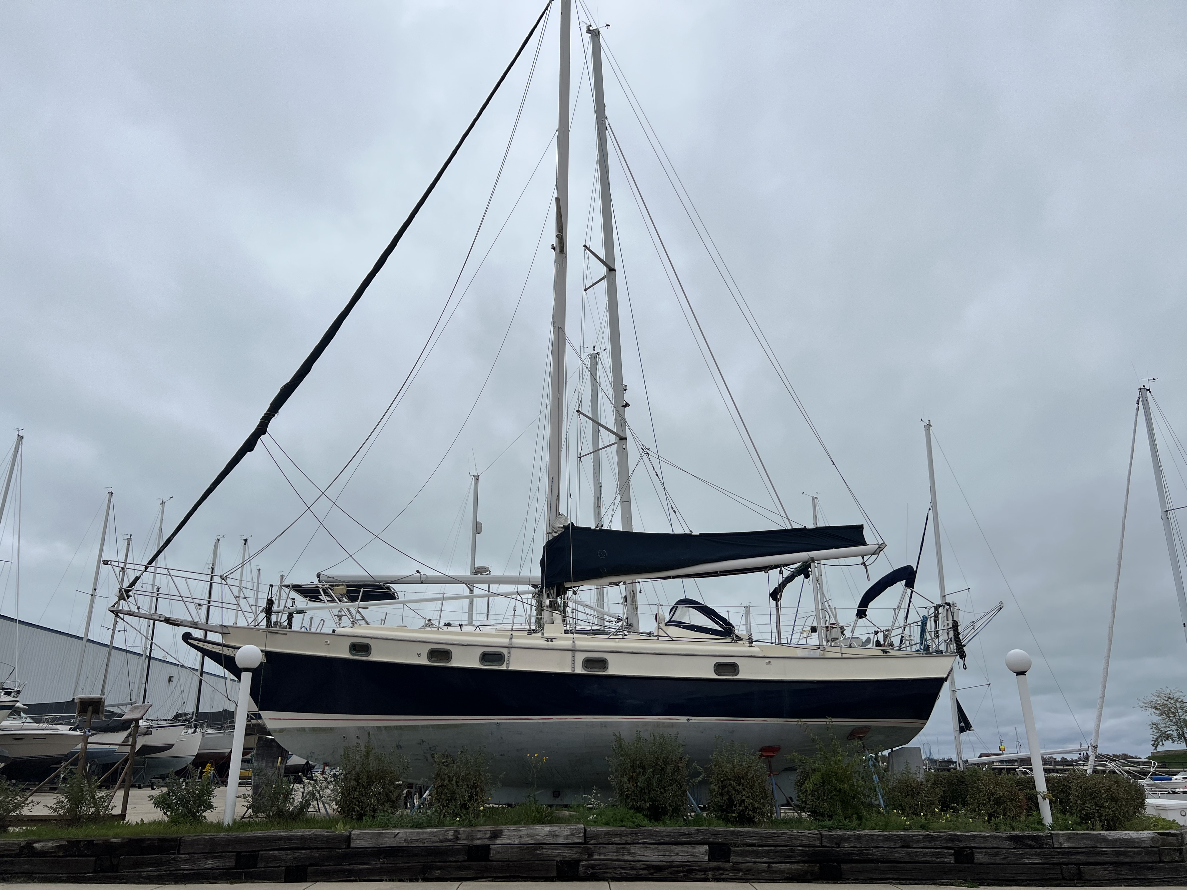 A high end cruising yacht cutter rigged with roller furling headsail.