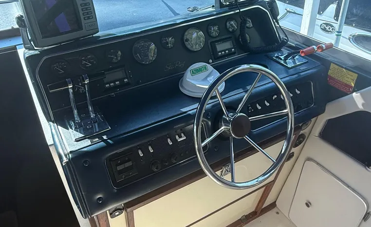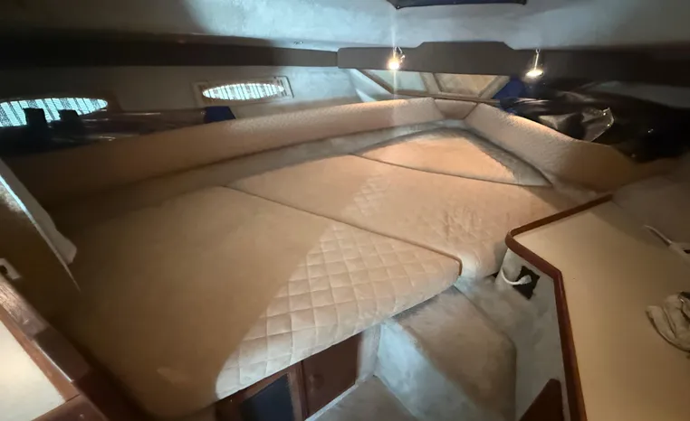 The Sea Ray 300 Weekender of the early 1980's is a straightforward express cruiser with inboard power, a flush cockpit, and practical cabin accommodation's. While the Weekender is somewhat dated by today's styling standards, she remains a good selection for used-boat buyers looking for a reliable and well built express. She rides on a solid fiberglass deep-V hull, and a wide 11-foot beam results in a rather spacious interior with berths for two adults and two kids. Unlike her sistership the 300 Sundancer (1985-89), the Weekender does not have a mid berth aft. In other respects, however, the floorplans of the two boats are identical. A double berth is located in the forward stateroom which has a sliding curtain for privacy. A convertible dinette is to port, and the standup head compartment contains a sink and shower. Because there's no mid-cabin, the Weekenders cockpit is flush--a feature that provides for a more open cockpit. Double-wide helm and companion seats are forward, and a removable lounge seat at the transom seats three. There are storage pockets under the gunnels, and a transom door was standard.