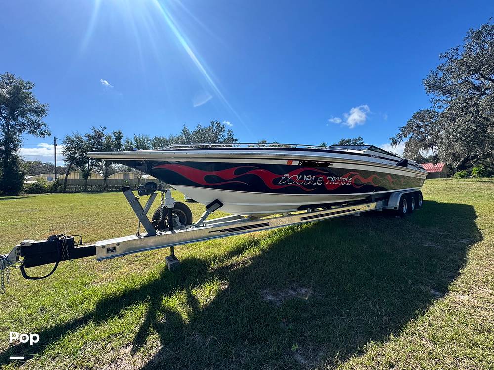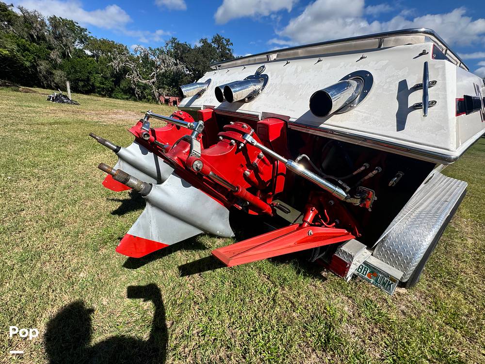 This 33-footer has twin big-block Mercruiser engines (with CMI headers) and a Mercruiser stern drive (with 1450 Huber transmissions). Its hull is designed by Reggie Fountain, which contributes to this boat's extra-special handling characteristics.
