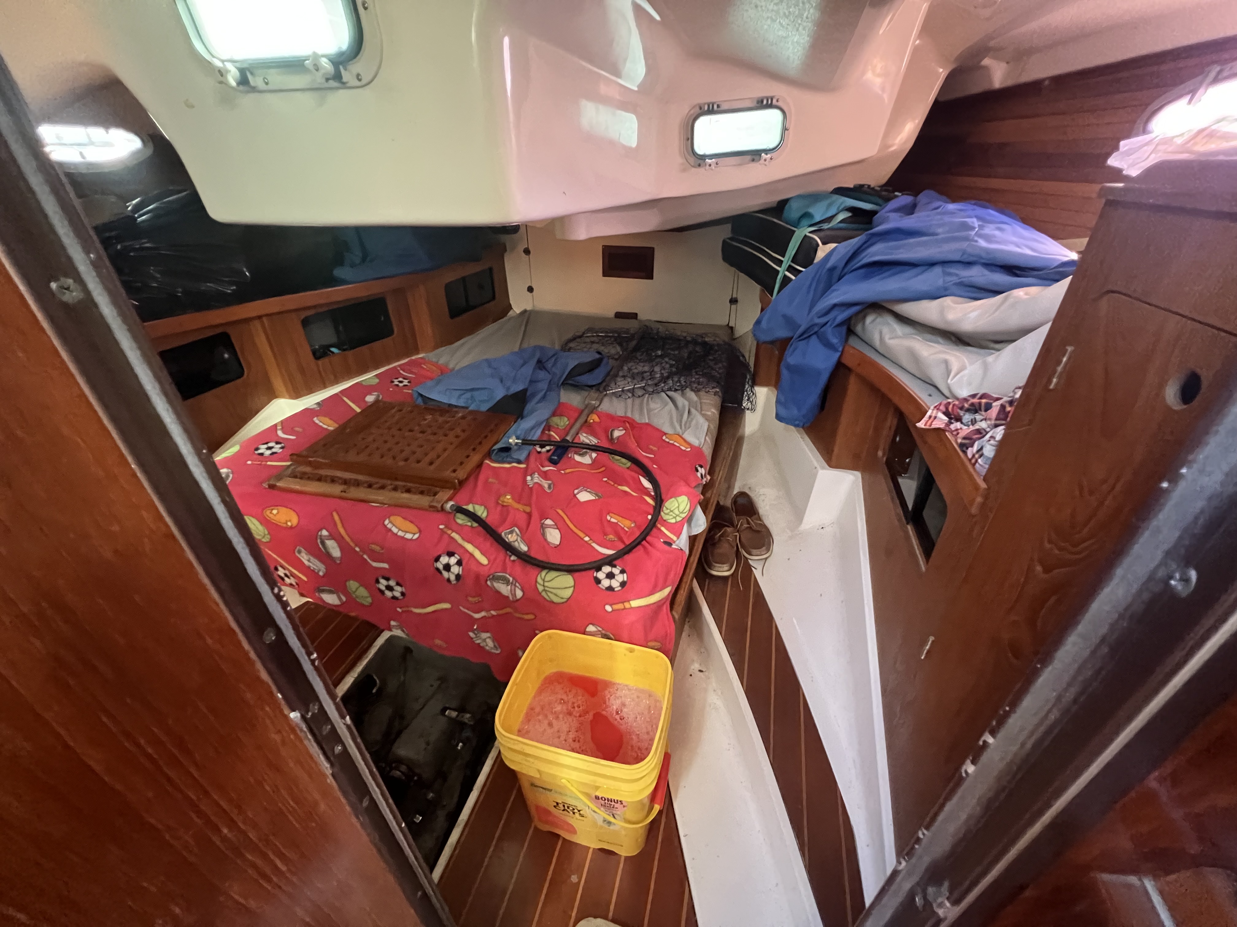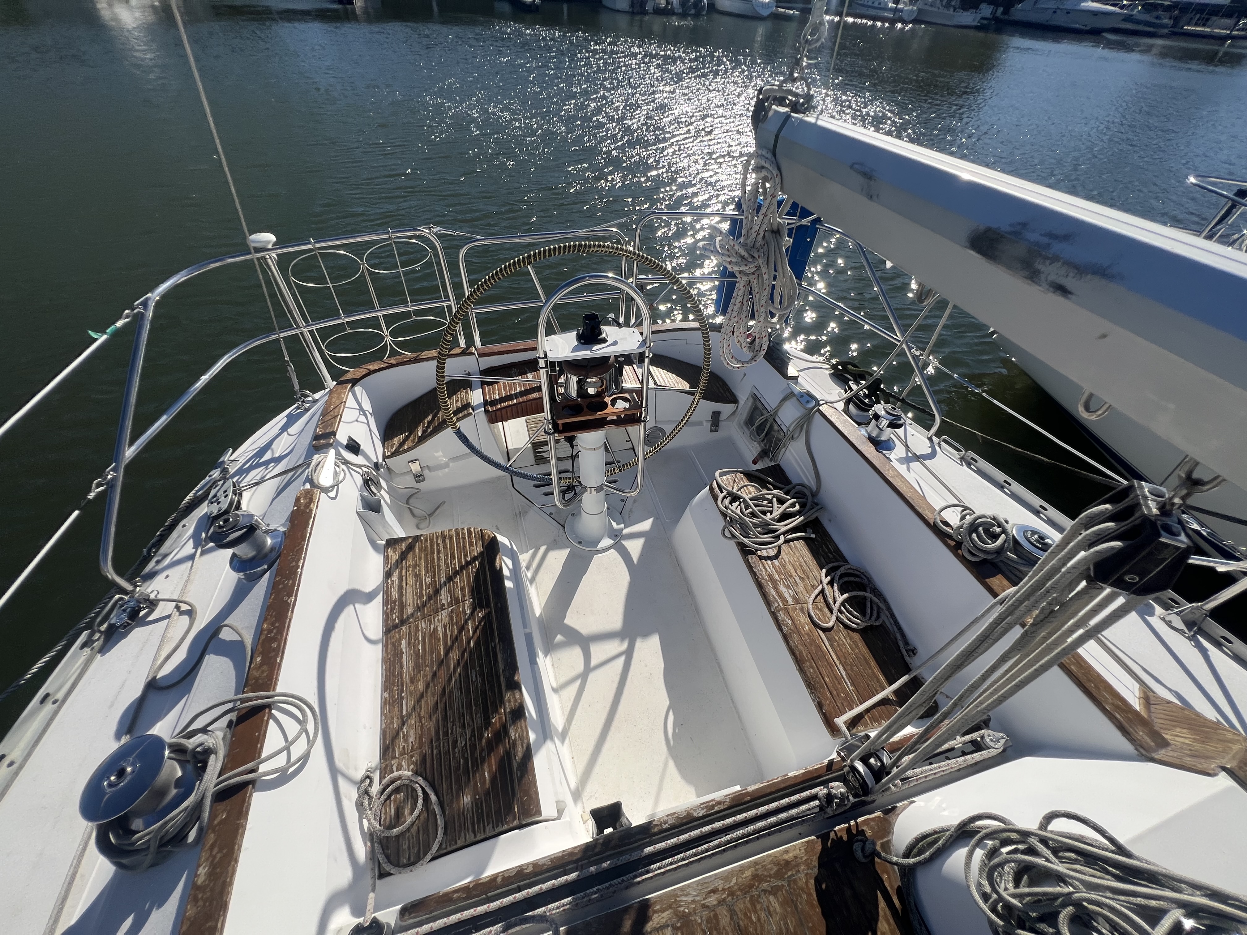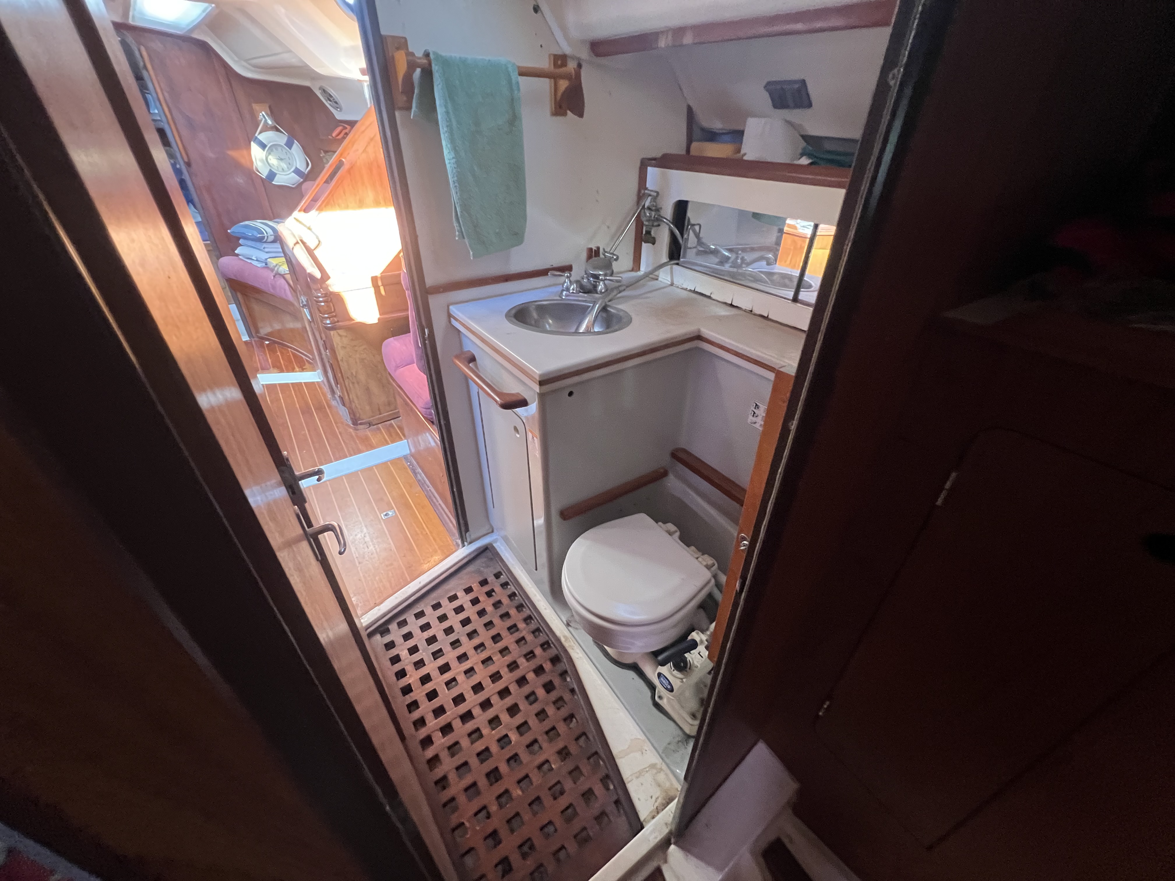 Large main salon with dinnett to port and settee to starboard, nav station to starboard, full galley with 2 burner stove / oven, double stainless sink and refrig, master cabin has queen size island birth.