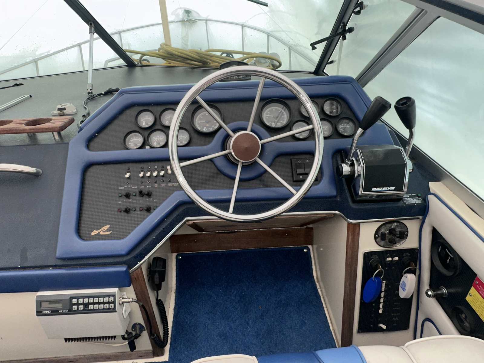 This freshwater 1987 Sea Ray 270 Sundancer is a classic mid-sized express cruiser known for its solid construction, comfortable cabin, and reliable performance. Measuring 27 feet in length with a 10-foot beam, it offers a spacious cockpit, a well-appointed cabin with sleeping accommodations for four to six, a compact galley, and an enclosed head. Powered by twin 4.3L MerCruiser engines,it delivers a smooth and efficient ride. Ideal for weekend cruising and overnight stays, the 270 Sundancer remains a popular choice among boating enthusiasts. Highlights include A/C in the cabin, Bimini Top with Enclosure, GPS, Stereo and more! She is currently wrapped on land with door access for viewing.