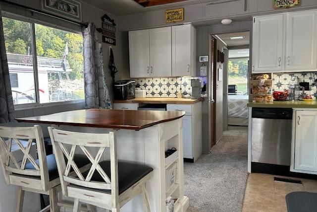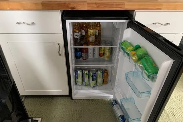 Beverage refrigerator/freezer, upper & lower cabinets at bar area with butcher block counter