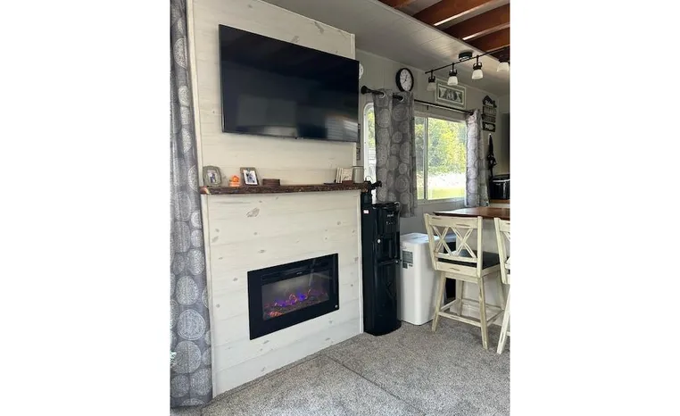 Fireplace and shiplap wall with live-edge mantle