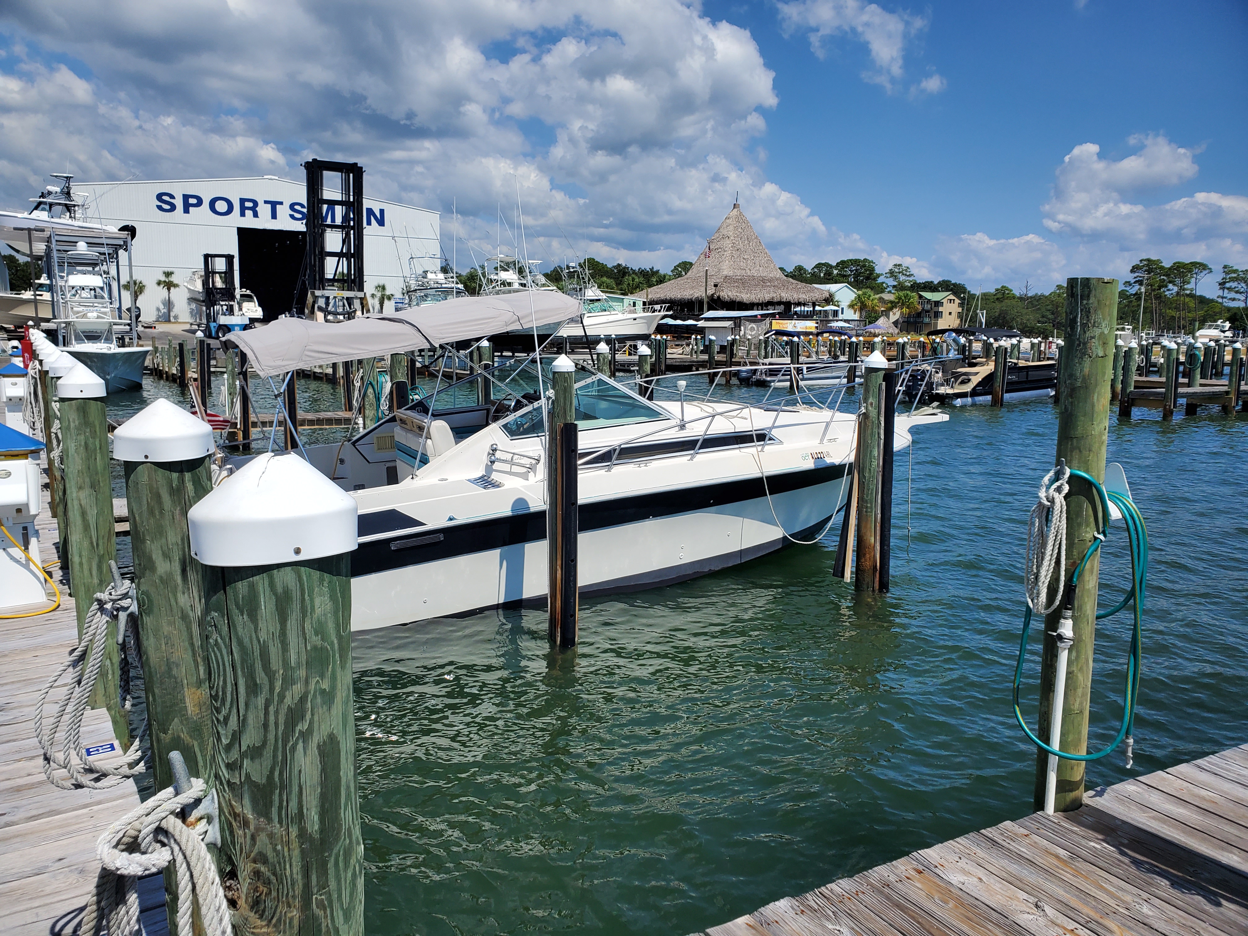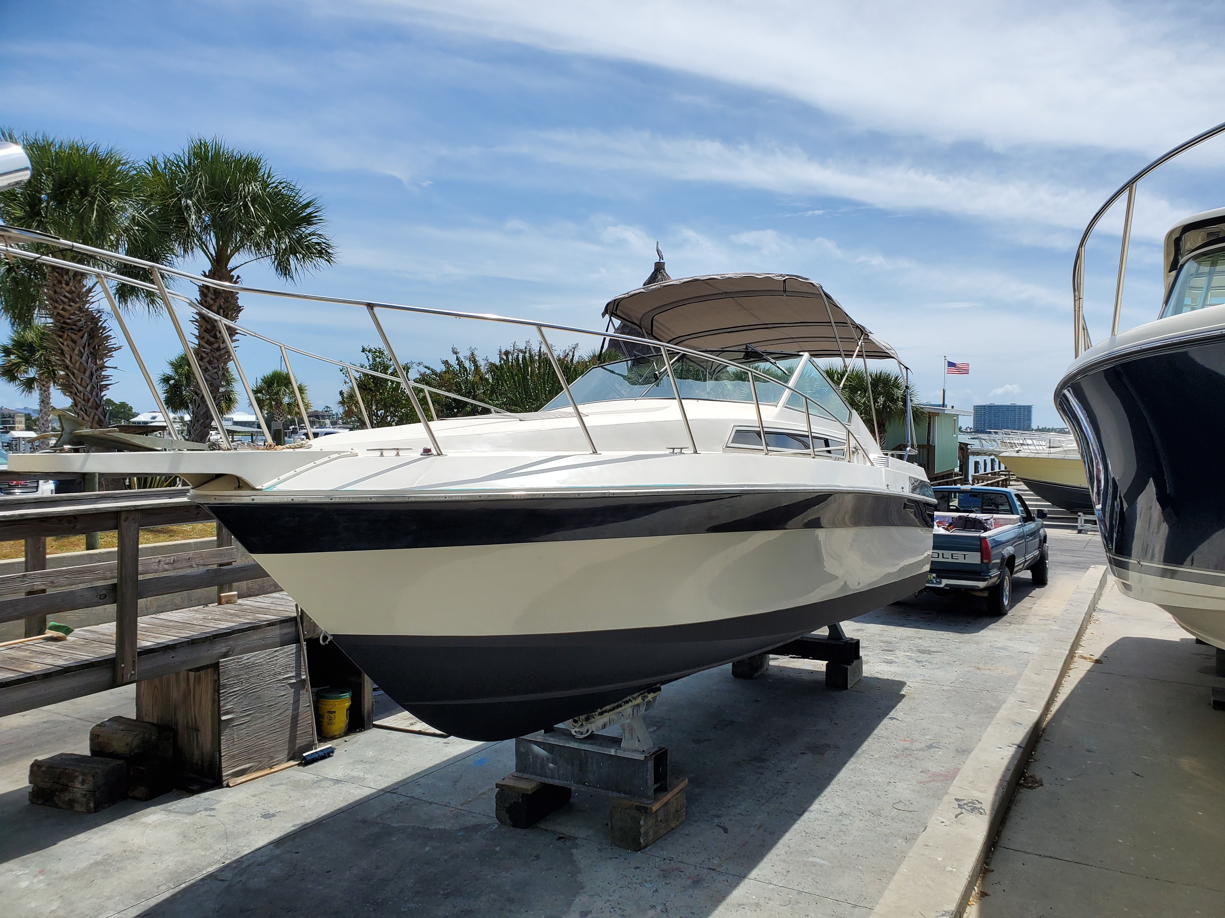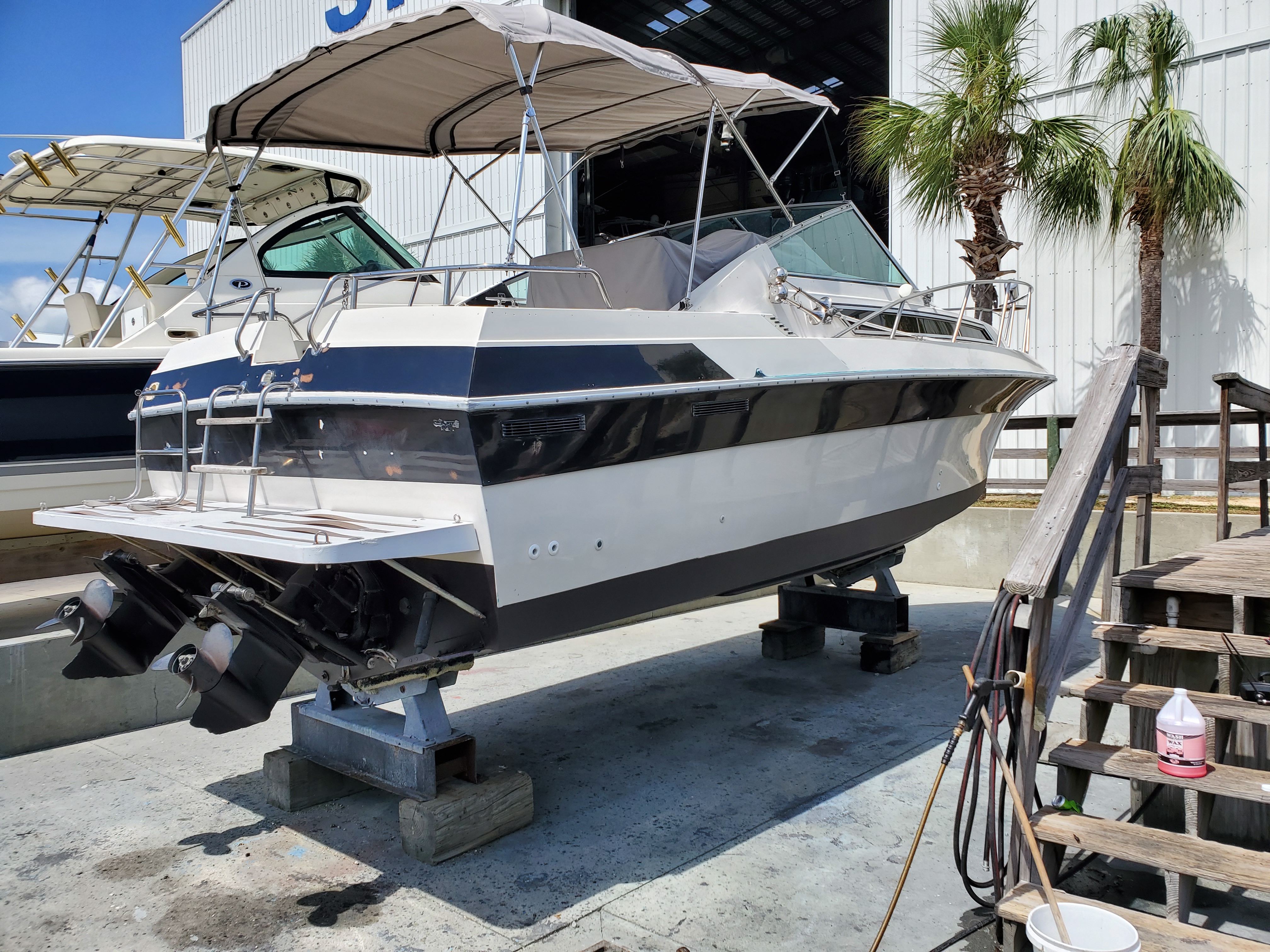 Twin 200 H.P. V-8's Alpha drives forward salon and aft bed walk-in bathroom and shower full galley no generator but does have ducted central heat and air. Dual Bimini tops and new camper canvass two rod holders near stern comes with triple axle aluminum trailer with six new wheels and tires. If you don't leave a message, you will not get a call back to many robo calls.