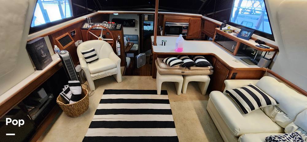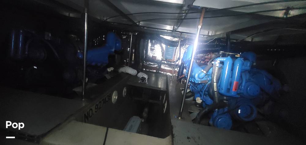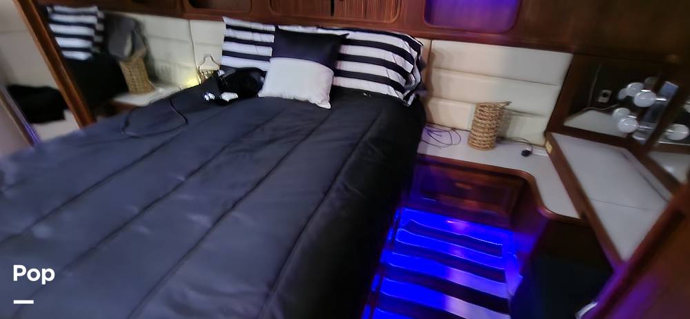 She has three Marine air reverse cycle air/heat units, two electric heads, shower and vanity, convertible dinette, full size refrigerator/freezer 115vac, three burner electric stove, combination microwave/convection oven, convertible L-sofa, wet bar with ice maker, sleeps eight, master stateroom aft, queen island bed, ensuite head/shower/vanity, guest stateroom forward with offset double, teak woodwork.