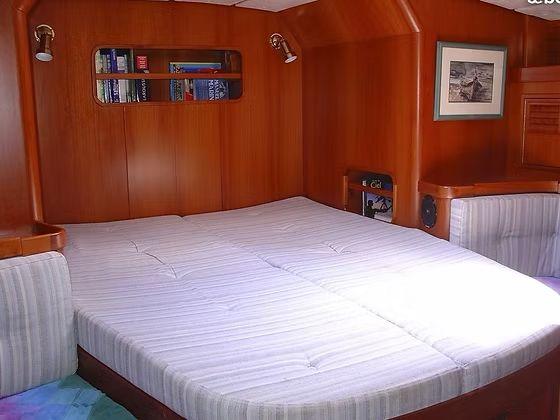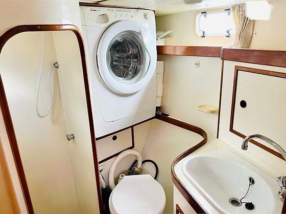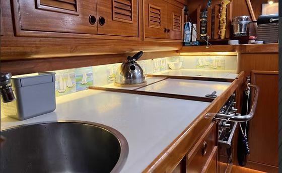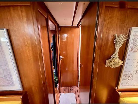 Below deck, two double cabins and a crew cabin sleep six in privacy. A spacious saloon opens to a fully equipped galley with oven and twin refrigerators. You’ll stay out longer thanks to 800 L of fresh water, 600 L of diesel and a working black water tank.
