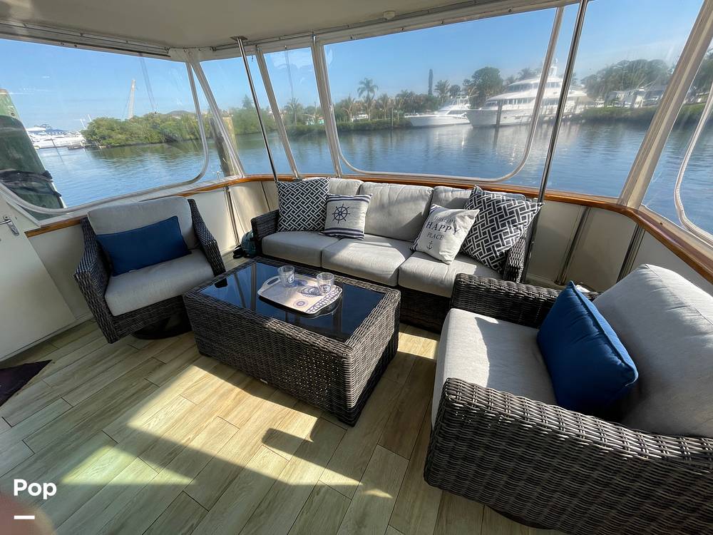 Climb aboard and enjoy the beautiful aft deck with full isinglass enclosure, wing doors (port and starboard) a wet bar with a refrigerator, a lovely loveseat, 2 chairs and a cocktail table. What a great place to take in the sunset over the water.