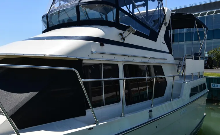 Freshwater / Great Lakes boat since new this vessel features Twin Crusader 454-cid 350-hp Gas Engine's with only 700 original hours. Notable features include but are not limited to the following: Air-Conditioning & Heat (2-Units), (2) Heads (Electric-Flush; Note Stall-Shower in Aft / Master Head), Westerbeke 6.5-kw Generator, NEW Custom Canvas Package (Convertible-Top w/Full Isin-Glass Enclosure on Fly-Bridge, Aft-Deck Convertible-Top, NEW Garmin 741XS (Color / TouchScreen) GPS/Chartplotter, and MUCH more!