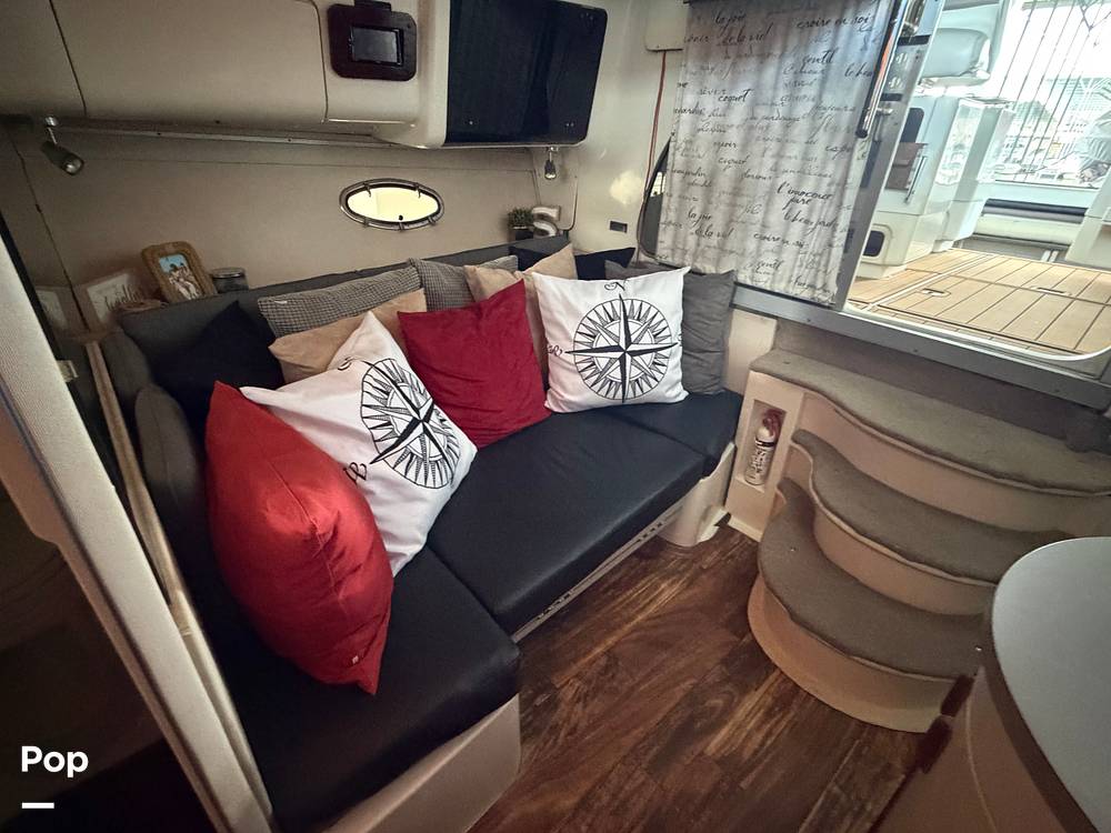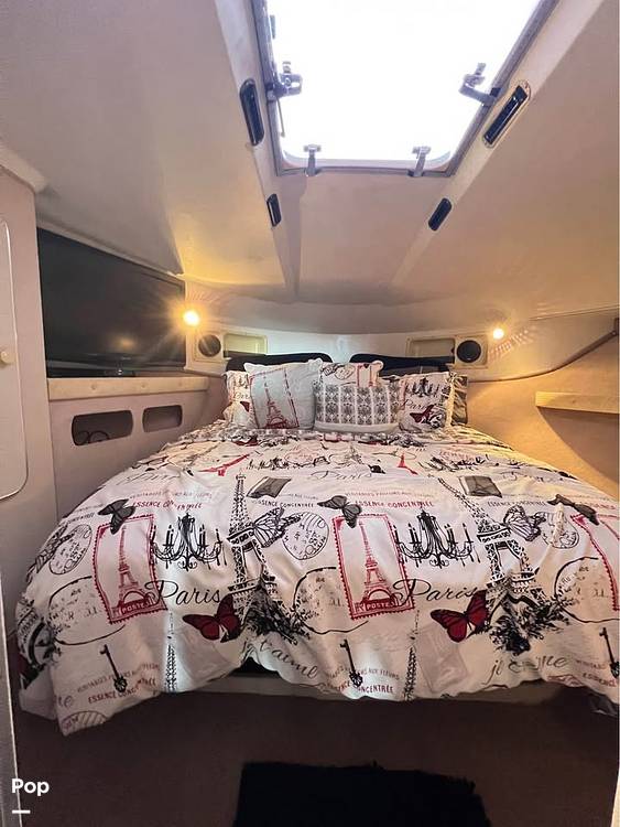 Below deck, the master bedroom provides a cozy and private space to relax after a long day on the water. A couch that converts to bunk beds gives additional sleeping accommodations for kids or guests. The galley kitchen features a glass cooktop, microwave, and double-door glass-front fridge.