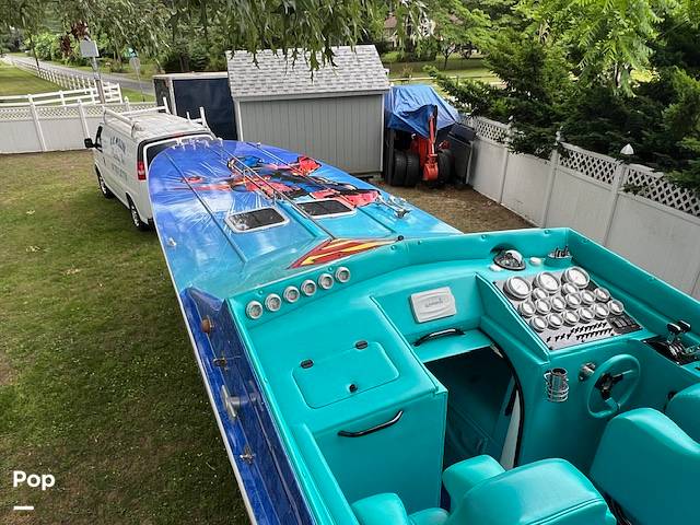 A custom-built and specialty-wrapped 41 Apache ocean racer made from Kevlar, it has 2 925 HP blown 557 cubic inch dart head and block engines, super cyborg transmissions, and 5 hrs. on them.