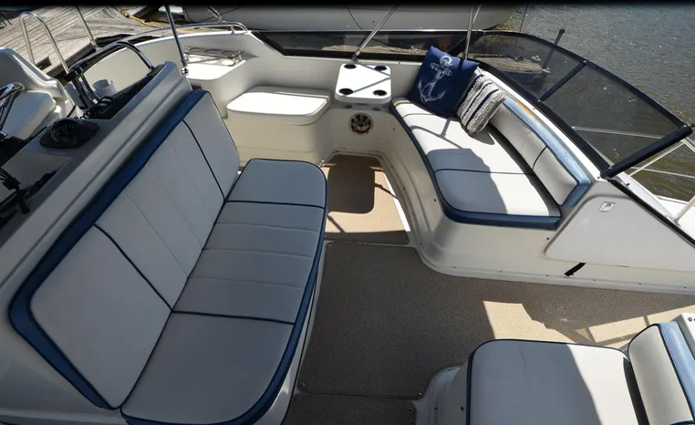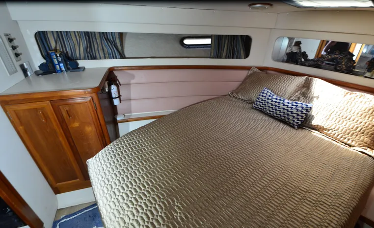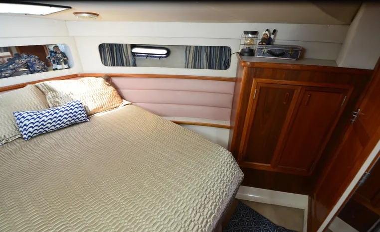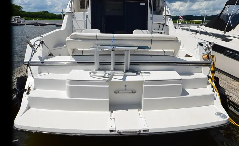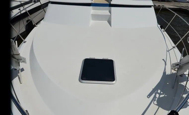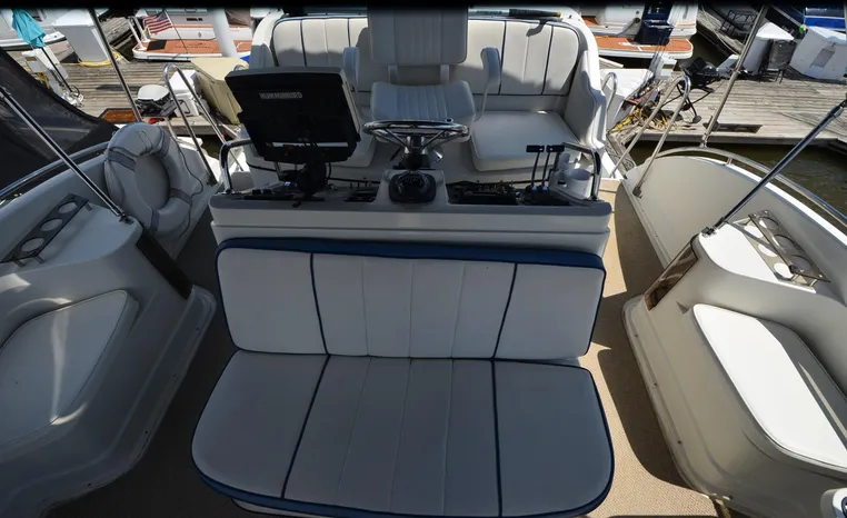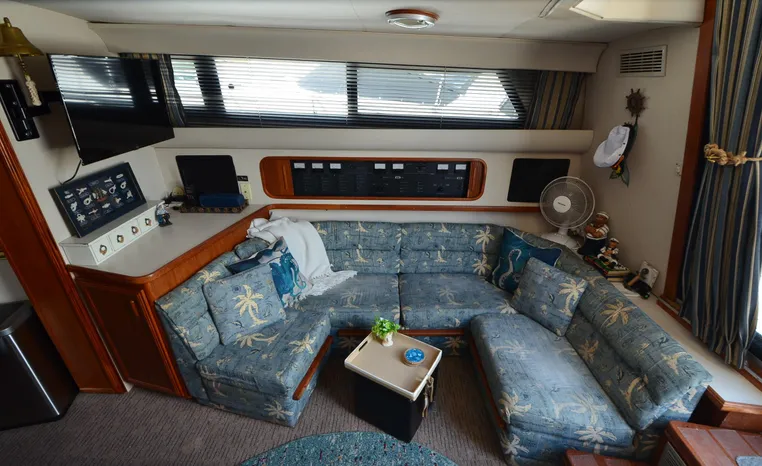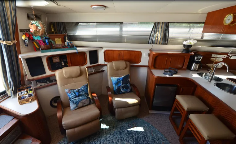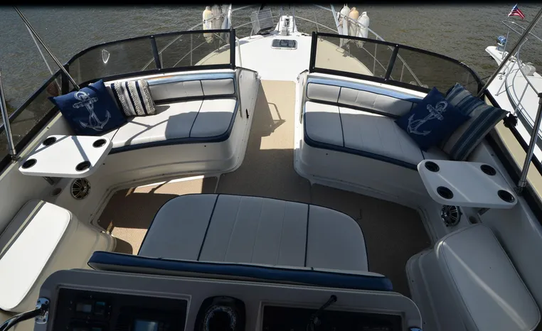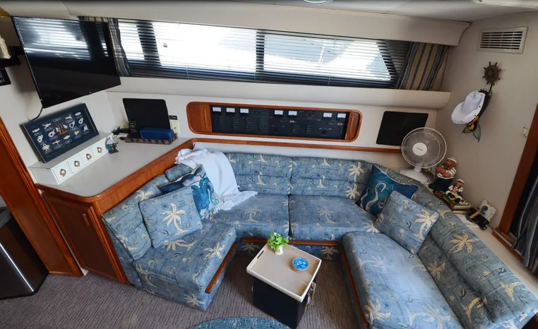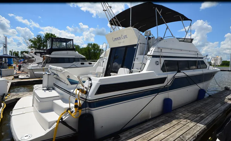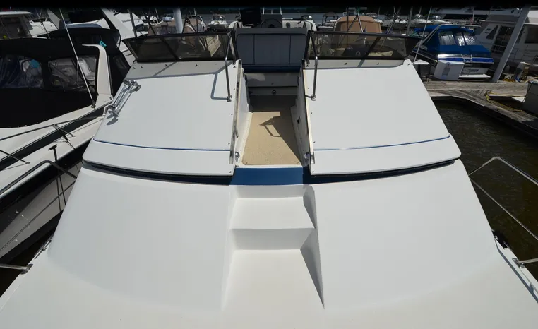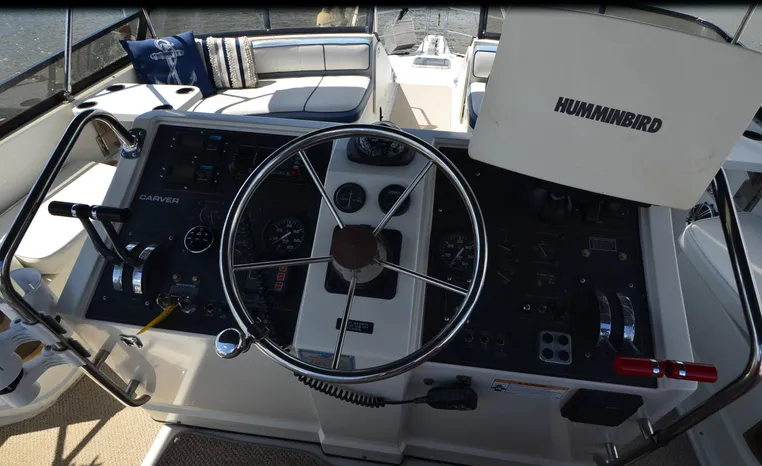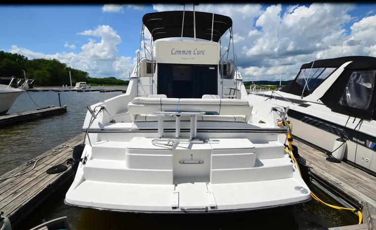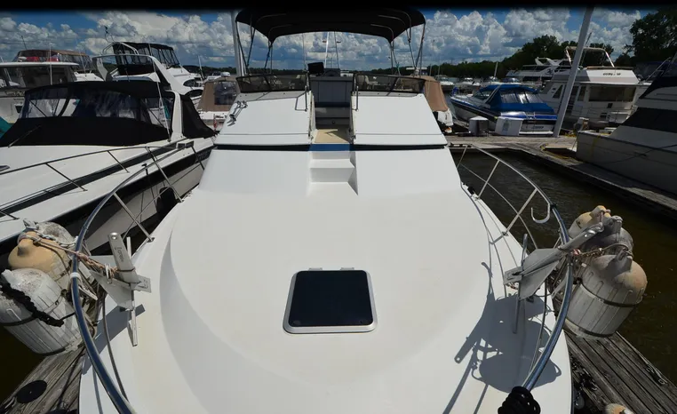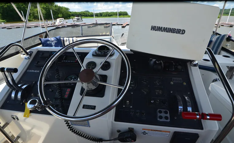 1989 Carver Santego 3867, Twin 340 HP Mercruiser, V-drive, GM 454 CID, 7.4L, raw water cooling, 1226 hours, Kohler 7.5Kw generator, 1739 hours, fly-bridge, single station, Seastar steering, Fireboy auto halon, four batteries, Pro Tech 30 AMP battery charger, dual 30 amp service with two shore power cords, two Cruise Air reverse cycle air conditioning/heating units, electric head, vanity, stall shower, sleeps four, master stateroom forward with island queen berth, beige carpet, light blue upholstery, teak woodwork, convertible sofa, dinette table, Kenwood stereo CD, flat panel TV, water heater, Norcold 12VDC/120VAC refrigerator/freezer, Princess three burner electric stove with oven, Seaward microwave oven, Kenyon VHF marine radio, VHF antenna, Hummingbird GPS, Impulse depth finder, C. Path compass, dual trumpet electric horn, black canvas, bimini top new 15, aft cockpit seat covers, bridge cover, walk through windshield, flybridge carpet, integral bow pulpit, chrome anchor, Good automatic windlass, two fenders, BBQ grill, Bennett trim tabs, transom shower (H/C), integral swim platform with boarding ladder.