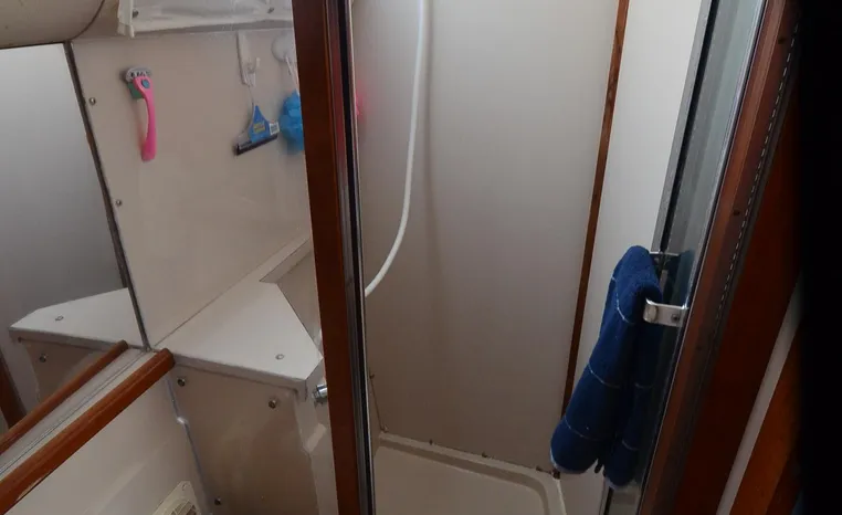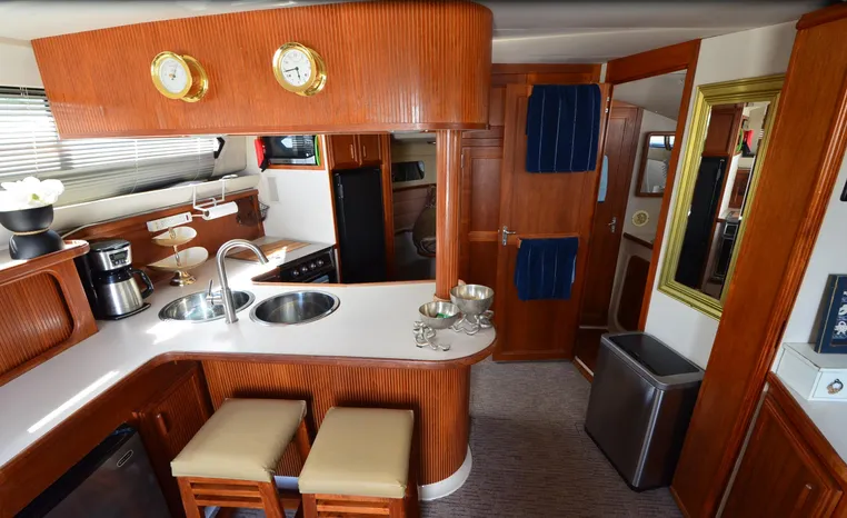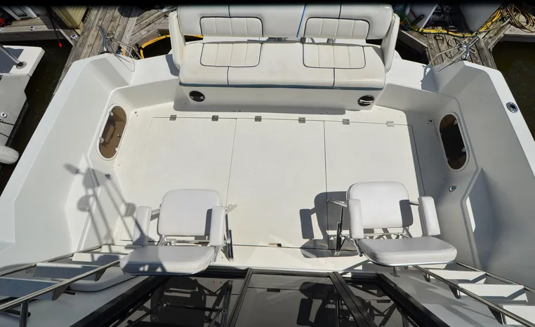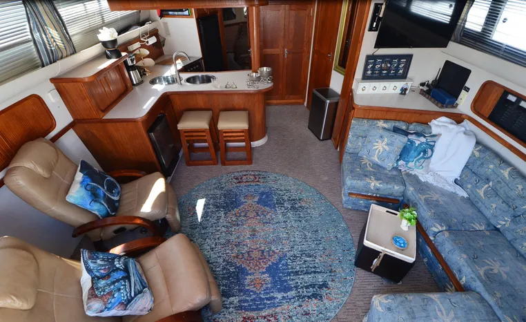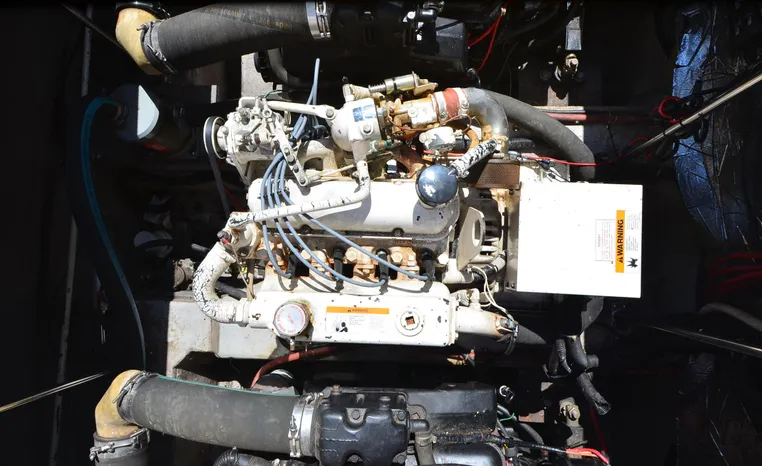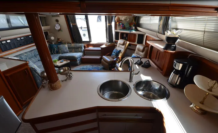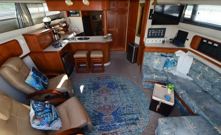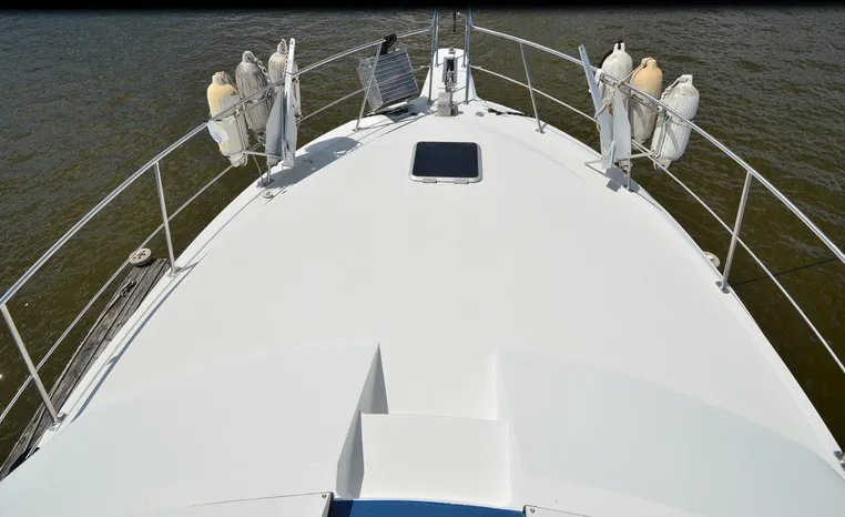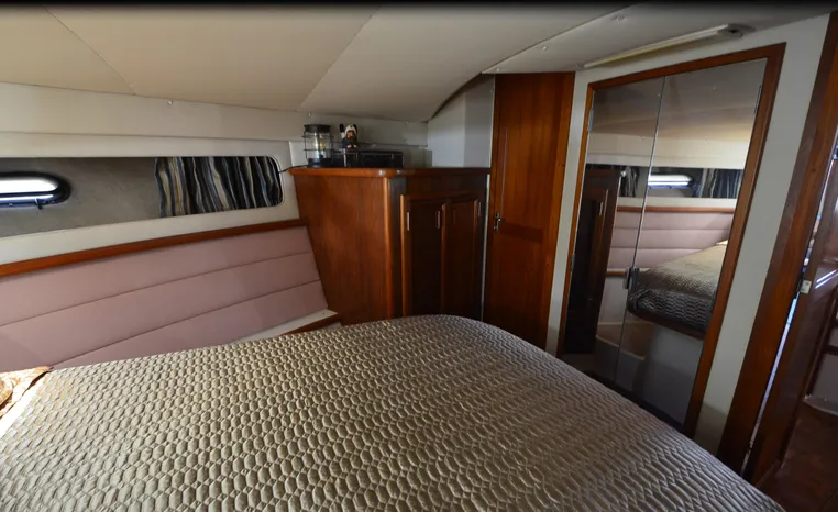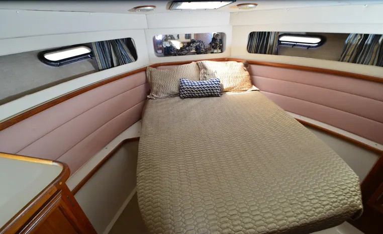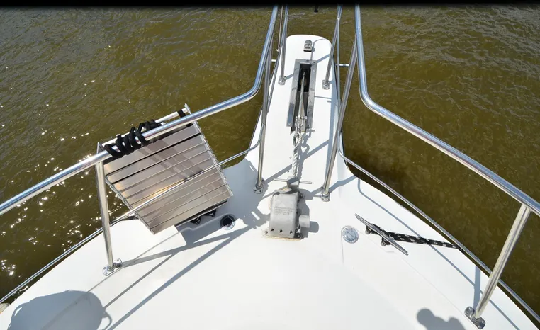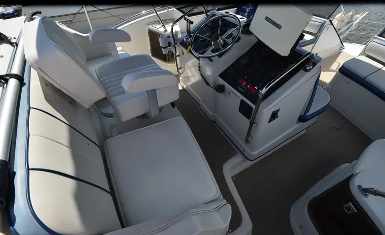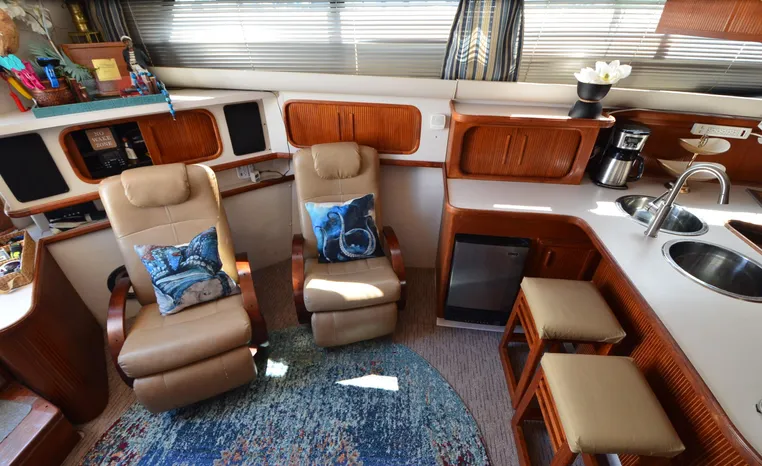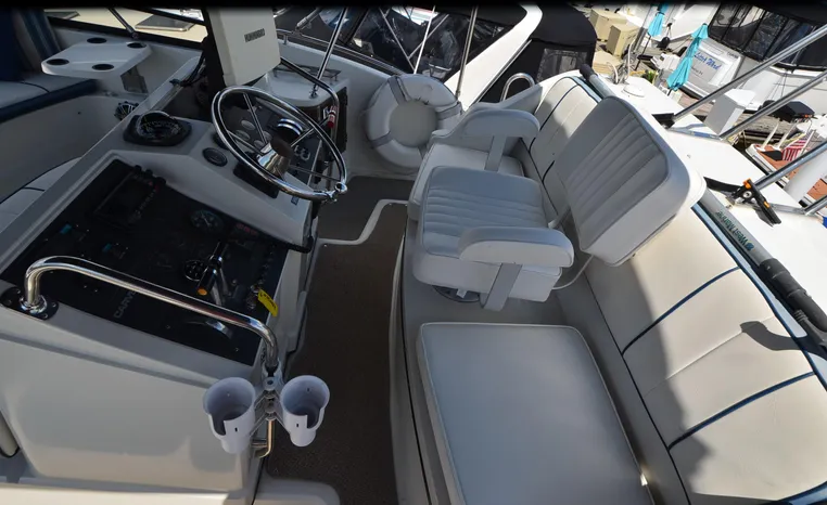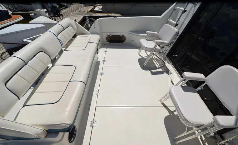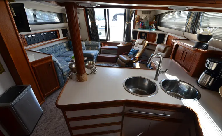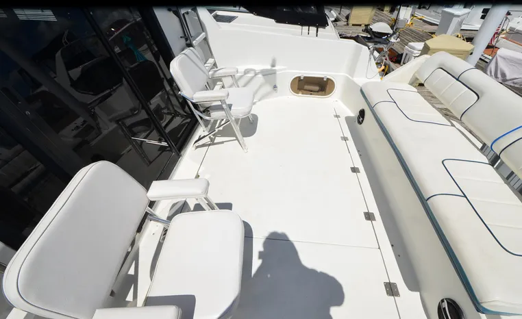 1989 Carver Santego 3867, Twin 340 HP Mercruiser, V-drive, GM 454 CID, 7.4L, raw water cooling, 1226 hours, Kohler 7.5Kw generator, 1739 hours, fly-bridge, single station, Seastar steering, Fireboy auto halon, four batteries, Pro Tech 30 AMP battery charger, dual 30 amp service with two shore power cords, two Cruise Air reverse cycle air conditioning/heating units, electric head, vanity, stall shower, sleeps four, master stateroom forward with island queen berth, beige carpet, light blue upholstery, teak woodwork, convertible sofa, dinette table, Kenwood stereo CD, flat panel TV, water heater, Norcold 12VDC/120VAC refrigerator/freezer, Princess three burner electric stove with oven, Seaward microwave oven, Kenyon VHF marine radio, VHF antenna, Hummingbird GPS, Impulse depth finder, C. Path compass, dual trumpet electric horn, black canvas, bimini top new 15, aft cockpit seat covers, bridge cover, walk through windshield, flybridge carpet, integral bow pulpit, chrome anchor, Good automatic windlass, two fenders, BBQ grill, Bennett trim tabs, transom shower (H/C), integral swim platform with boarding ladder.