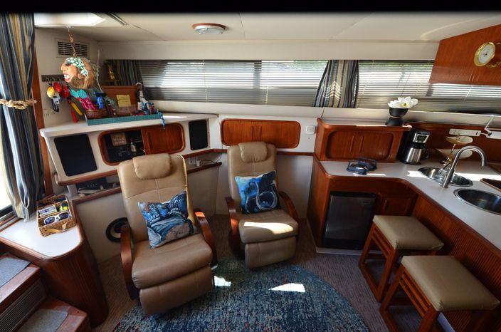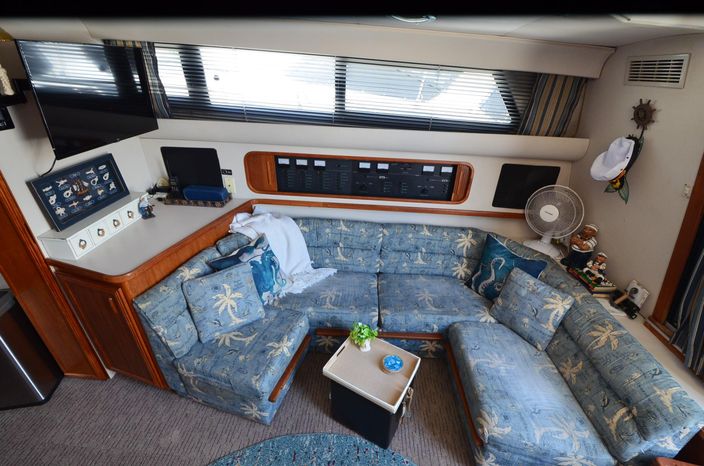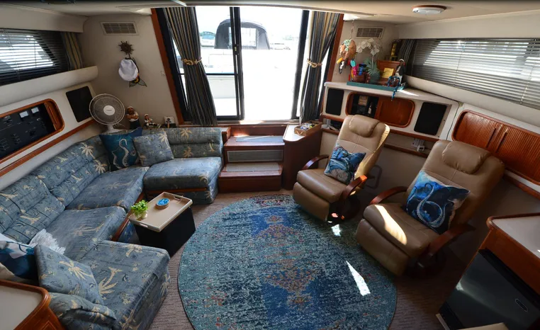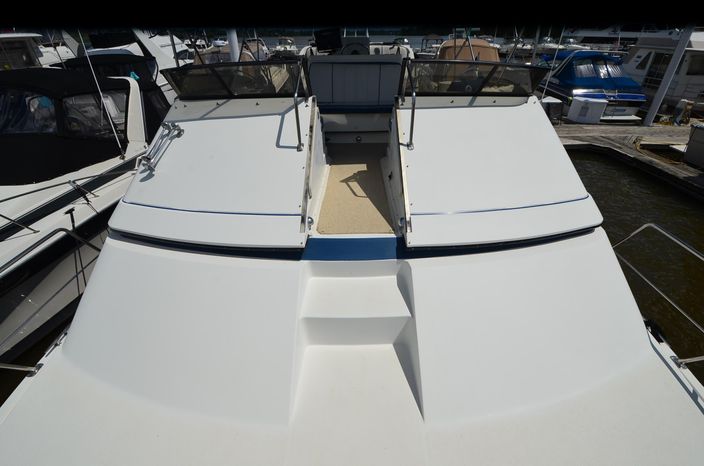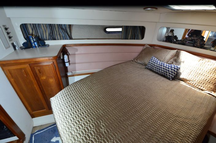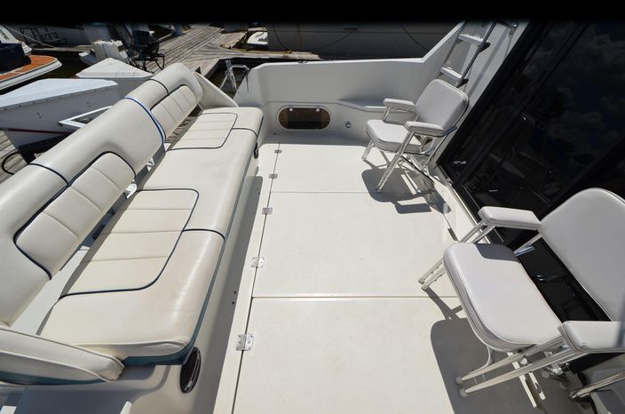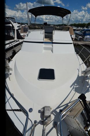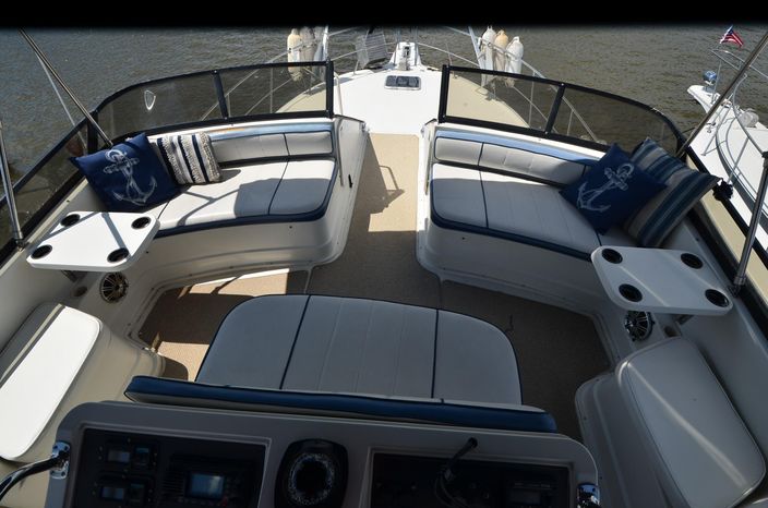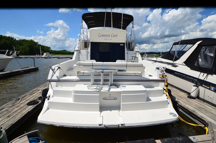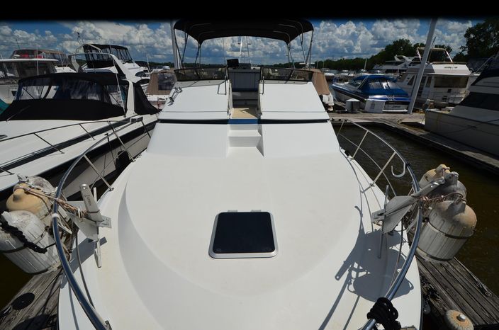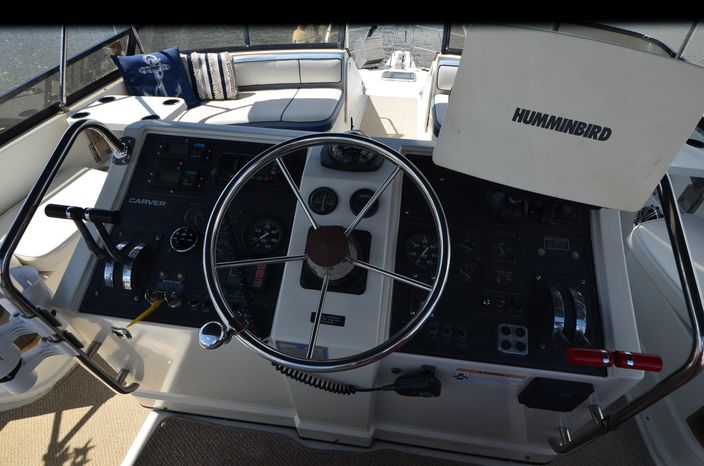 1989 Carver Santego 3867, Twin 340 HP Mercruiser, V-drive, GM 454 CID, 7.4L, raw water cooling, 1226 hours, Kohler 7.5Kw generator, 1739 hours, fly-bridge, single station, Seastar steering, Fireboy auto halon, four batteries, Pro Tech 30 AMP battery charger, dual 30 amp service with two shore power cords, two Cruise Air reverse cycle air conditioning/heating units, electric head, vanity, stall shower, sleeps four, master stateroom forward with island queen berth, beige carpet, light blue upholstery, teak woodwork, convertible sofa, dinette table, Kenwood stereo CD, flat panel TV, water heater, Norcold 12VDC/120VAC refrigerator/freezer, Princess three burner electric stove with oven, Seaward microwave oven, Kenyon VHF marine radio, VHF antenna, Hummingbird GPS, Impulse depth finder, C. Path compass, dual trumpet electric horn, black canvas, bimini top new 15, aft cockpit seat covers, bridge cover, walk through windshield, flybridge carpet, integral bow pulpit, chrome anchor, Good automatic windlass, two fenders, BBQ grill, Bennett trim tabs, transom shower (H/C), integral swim platform with boarding ladder.